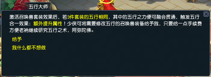 2、五行合一:若已激活3件套效果,且3件套的五行相同,则触发“五行合一”效果,额外增加属性。 举例说明:若雷鸟人穿戴了3件“套装效果:雷鸟人”的召唤兽装备,且3件装备的五行均为金。此时会激活套装效果,由于雷鸟人的参战等级为45级,提升的属性为18力量,五行合一(金)会额外增加12力量。
