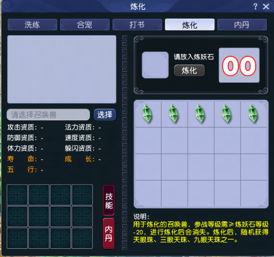 2、天眼珠的炼化 使用召唤兽和炼妖石炼化而成的天眼珠具备与生俱来的灵气,灵气值取决于炼化材料中的召唤兽的参战等级。炼化的召唤兽参战等级越高,获得高灵气天眼珠的可能性就越大。 天眼珠的种类分三种,由低到高依次为天眼珠、三眼天珠和九眼天珠,由天眼珠的灵气决定其类型。