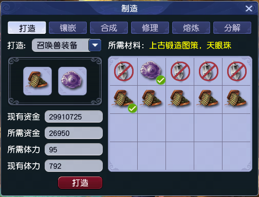 天眼珠的灵气决定打造后装备的属性区间,使用高灵气的天眼珠进行打造,更容易获得高属性装备哦。 3、打造方法 玩家可以找长安铁匠铺(26,22)的打铁炉打造召唤兽装备。 打造装备时,上古锻造图策的等级必须≤天眼珠的等级。 根据上古锻造图策上记载的装备种类、等级和天眼珠的等级,你就可以打造得到相应等级、相应种类的装备啦。 特别说明: 1)所有材料都可以进行交易、给予、出售等; 2)召唤兽装备允许交易、给予、出售等; 3)炼化的召唤兽无论是野生还是宝宝,效果相同; 4)炼妖、炼化时,召唤兽身上不可以穿戴装备; 5)打造装备时,上古锻造图策的等级必须低于或等于天眼珠的等级; 6)最终打造出的装备种类和等级,取决于上古锻造图策的属性; 7)未加锁的召唤兽如果装备了已经加锁的装备,则召唤兽会自动加锁; 8)神兽与变异召唤兽无法与炼妖石进行炼化; 9)带有绑定锁的召唤兽无法与炼妖石进行炼化; 10)带有交易锁的召唤兽或炼妖石进行炼化,得到的天眼珠必定附带交易锁; 11)使用带有交易锁的上古锻造图策或天眼珠进行打造,打造得到的装备必定附带交易锁。 ⑤装备的使用 1、和人物的装备一样,使用鼠标右键可以直接进行穿戴。 2、当装备耐久低于最大值时,玩家可以使用天眼珠(等级≥装备等级)进行修复,天眼珠的种类会影响修复成功率,天眼珠的灵气值影响修复的耐久(失败三次的装备无法使用天眼珠修复)。 3、玩家也可以使用珍珠为召唤兽装备补充耐久(200点),珍珠等级+5≥召唤兽装备等级才允许使用。 ⑥套装效果 1、3件套:召唤兽在穿戴3件与自身同名的装备时,会激活套装效果。激活后,召唤兽的属性会根据装备五行、召唤兽参战等级提升。 举例说明:若雷鸟人穿戴了3件“套装效果:雷鸟人”的召唤兽装备,且3件装备的五行分别为金、木、水。此时会激活套装效果,由于雷鸟人的参战等级为45级,提升的属性为6力量、6体质、6敏捷。