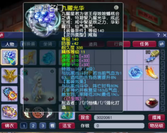 大家好!「烤鸭看西游」每天为你带来不一样的故事。钓鱼岛服战队在夺得9月份武神坛冠军后,展示了一波硬件。 三雾160级伤害709 命中690 力魔双加 神佑玄鸟之灵的弓箭 160级 390灵的魔王项链 钓鱼岛女儿村的玉, 三速度 12段 ?双法防 12段,这个上12段 有点领先. 140级主属性42防御 ?35速度的戒指. 140级主属性 法防29 三速度38的耳朵. 160级愤怒 妙法之护的腰带融了10防御 49气血 160级晶清诀女头 160级 15段伯牙绝弦双圈 11 7轮车 11 7轮车 翻页静台神马死亡攻 翻页四吸收神马隐攻童子 三合谛听 12技能净台死亡宠 叶子猪梦幻西游玩家群:1群 325703083 (2000人),2群: 330102322 (千人);3群: 424986787 (游戏疑难解答);4群: 330518295 (商人物价);5群: 1063086037 (疑难解答);6群: 1045753197 (春心萌动);7群: 787195090 (活跃互动);8群: 720665628 (全民PK)