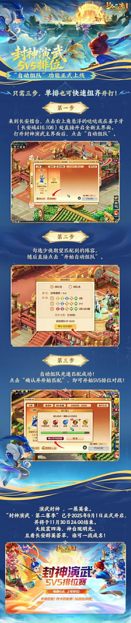 自从封神演武·5V5玩法在今年夏天上线后,擂台便成了少侠们一展身手的热门地,姜子牙身旁更是天天挤满玩家。 不少来自联赛、群雄的玩家,早已组好固定队畅快开打;可还有大批单开玩家,只能望着别人组队激战眼馋。他们扎堆在长安姜子牙跟前,嗓子都快喊哑了:“缺辅助!来个化生寺!175三攻4Q1!”可喊了半天,要么人凑不齐,要么来的门派不对,只能眼睁睁看着别人连破强敌拿下胜利、领走丰富奖励。 不过别慌!单开玩家组队难的问题在10月28日维护后迎来了史诗级优化!封神演武直接上大分——全新“自动组队”功能来了! 这波史诗级优化,直接把组队效率拉满,单排党终于熬出头了! 以前单排玩家冲封神,组队全靠嗓子“吼”;如今只需简单三步,轻松一“点”,组队难题秒解决!少侠来到长安擂台处,点击姜子牙开启封神演武主界面后,即可开始“自动组队”操作,小编专门制作了一张长图,便于各位少侠理解~ 不仅仅是单开玩家,对于许多和好友一起封神的玩家也是重大利好,无论队伍内是几个人,只要还没组满5人,均可使用这个功能,一键帮你组满队! (全新“自动组队”功能将率先在“160至175级等级”玩家中测试) 从喊破喉咙组不上队,到一键匹配直接发车,这次封神演武优化,直接把“爽”字都打在公屏上了!当前,长安城姜子牙处已汇聚各路豪强,公平匹配机制确保每一场排位赛都能遇到势均力敌的对手,段位结算界面的功能升级则让战绩查询更清晰直观,全新的“自动组队”功能让更多喜欢、热爱PK的玩家能更方便的体验,封神演武确实是越来越好玩了。 演武封神 ,一展英豪。“封神演武·第二赛季”已于2025年9月1日00:00正式开启,并将于2025年11月30日24点结束。 每晚18:00至23:00和每月第2、3、4周的周六13:00至23:00,玩家可前往长安城跨服擂台(416,106)姜子牙处开启“5V5排位”,决战第二赛季。 封神演武玩法提供免费的“临时符”、“变身卡”、“三级药品”等比赛物资,每日完成任务均可获得丰厚奖励。 达到超凡战神段位的少侠,还可冲刺“封神之战”,成功击败雷震子即可开启荣耀之路,获得全新赛季的封神荣耀! 叶子猪梦幻西游玩家群:1群 325703083 (2000人),2群: 330102322 (千人);3群: 424986787 (游戏疑难解答);4群: 330518295 (商人物价);5群: 1063086037 (疑难解答);6群: 1045753197 (春心萌动);7群: 787195090 (活跃互动);8群: 720665628 (全民PK)