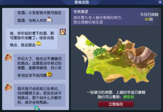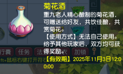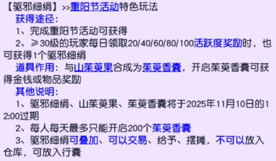 2025年10月28日至2025年11月3日,重阳节活动准时登陆畅玩服。下面,让我们一起了解畅玩服重阳节活动的具体内容吧! 一、【活动内容】 畅玩服重阳节活动共包括“重阳驱邪”、“登高览胜”和“茱萸香囊”三大玩法。各位少侠可通过重阳节活动获得海量经验,更有特色道具菊花酒以及特赦令牌等珍稀物品静候少侠。 活动期间,长安城、朱紫国、宝象国和西梁女国等地还会被美丽的菊花点缀,让各位少侠身临其境地感受重阳赏菊之美。 二、【重阳驱邪】 “重阳驱邪”为节日特色投放怪玩法。每个小时的15分和45分时,投放怪会随机刷新在东海湾、江南野外、长寿郊外等场景。届时,等级达到30级的少侠可组队前往挑战。 “重阳驱邪”的投放怪分为“入魔异兽”和“重九邪毒”两种,每位少侠每天可击杀5次“入魔异兽”,1次“重九邪毒”。 另外,“重阳驱邪”不受双倍和精修时间影响,战斗失败后原地复活,无战斗损失。 三、【登高览胜】 “登高览胜”是重阳节特色单人玩法,等级到达30级的少侠可前往长安城(225,121)重九老人处领取任务。 成功领取任务后,少侠们只需打开玩法界面即可获得任务提示。根据任务提示到达指定地点后会出现“挖掘”按钮,点击“挖掘”即可完成任务并获得重阳节活动特色道具“菊花酒”。实在找不到“挖掘”地点的少侠还可以使用天眼通符知晓准确坐标哦。 温馨提示:菊花酒无法对自己使用,各位少侠可将菊花酒给予其他少侠,届时,双方都可获得奖励。另外,每位少侠每天只能获得20次被给予菊花酒的奖励。 四、【茱萸香囊】 重阳节活动期间,等级达到30级的少侠参与“重阳驱邪”、“登高览胜”玩法或每日领取活跃度奖励时均可以获得驱邪细绢。使用驱邪细绢和山茱萸果(重九老人处购买)可合成茱萸香囊。 开启茱萸香囊后有一定几率可获得经验、金钱、五宝、特赦令牌等不同奖励。打开茱萸香囊的过程中有一定几率触发茱萸仙子的祝福,完成她的考验后可能获得更多奖励。 需要说明的是,每位少侠每天只能打开200个茱萸香囊。另外,驱邪细绢为可交易道具,而山茱萸果和茱萸香囊为不可交易道具,三种道具的过期时间均为2025年11月10日12:00。 【总结】 畅玩服重阳节活动的玩法简单易懂且趣味十足。并且,完成每天的畅玩服重阳节活动不需要花费太多时间,让大家用最短的时间收获最大的快乐。 叶子猪梦幻西游玩家群:1群 325703083 (2000人),2群: 330102322 (千人);3群: 424986787 (游戏疑难解答);4群: 330518295 (商人物价);5群: 1063086037 (疑难解答);6群: 1045753197 (春心萌动);7群: 787195090 (活跃互动);8群: 720665628 (全民PK)