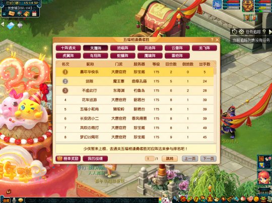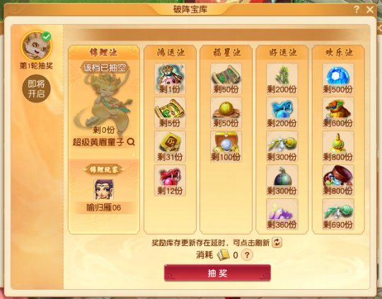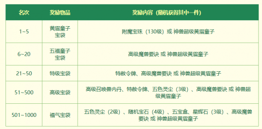 四、五福相逢勇者胜(挑战怪) 活动时间 2025年11月28日12:00-2025年12月30日12:00 参与条件 角色等级≥50级,队伍人数=5人 玩法介绍 五福童子不但擅长布施论道,也擅长构建阵法,为各位少侠提供磨练之所! 挑战玩法。活动期间,玩家(≥50级,5人组队)可前往长安城(235,115)圆福小和尚处向十组阵法发起挑战。十种阵法挑战将于11月28日、12月2日、12月5日、12月8日,定期分批放出。 战斗中,守阵单位拥有阵法增益。击倒某个守阵单位,可使其增益转移给对应站位的玩家!合理规划站位及击倒顺序,更易取胜。 破阵玩法每种阵法设3个难度(简单、侠士、英雄),挑战更高难度的阵法,将得到更多的奖励,完成10阵英雄难度通关,还将获得特色限时称谓“十阵通关盖世英雄”和道具“圣山英雄帖”一件,可在圆福小和尚处抽取一次破阵宝库,最高可得神兽-超级黄眉童子。同时,五福小和尚们将对完成十种英雄难度阵法挑战的少侠做成绩统计,2025年12月30日12:00挑战结束后,全服10种阵法总计所使用的回合数、倒地次数、决胜出手数最少的前1000名少侠,将获得额外的奖励,还请各位勇敢的少侠奋勇争先,具体奖励如下: 越高级的宝袋中,获得神兽的概率越高。12月30日12:00后可以从圆福小和尚处领取自己的排名奖励,同时还将为每种阵法成绩尤其突出的少侠办法特色称谓: 每日成功挑战三次任意难度的阵法,还将获得刮开一次破阵幸运卡的机会,幸运卡文字组合结果不同,少侠将可以获得不同价值的物品奖励。当已拥有幸运卡结果时,少侠还可以消耗12颗“破阵星”对其中一个文字结果进行重新刮操作一次(通关一次侠士难度获得1颗破阵星,通关一次英雄难度获得4颗破阵星,通关普通难度不获得破阵星,每天仅前3次挑战可以获得破阵星) 特别说明 1、任务不受双倍、精修时间影响,死亡计算为非正常死亡,原地复活无损失;若使用800*600、1024*768、1024*768(HD)、1280*960(HD)分辨率、全屏客户端或互通版参与活动,则经验、金钱奖励和获得物品概率都将提升10%。 2、完成任务将获得欢乐积分,累积一定数量后即可在“圣山灵气纳囊中”活动中获得丰厚的奖励哦; 3、特色称谓有效期截止日,圆福小和尚回收时间均为2026年1月6日8:00,还请在玩法中成绩优异获得奖励的少侠不要忘记前往长安城(235,115)处领取自己的奖励。 4、每当破阵宝库中的神兽超级黄眉童子被幸运少侠抽走后,第二天12:00会重置一次破阵宝库抽奖奖池,后续通关十阵英雄难度的少侠依然有抽中神兽的机会。