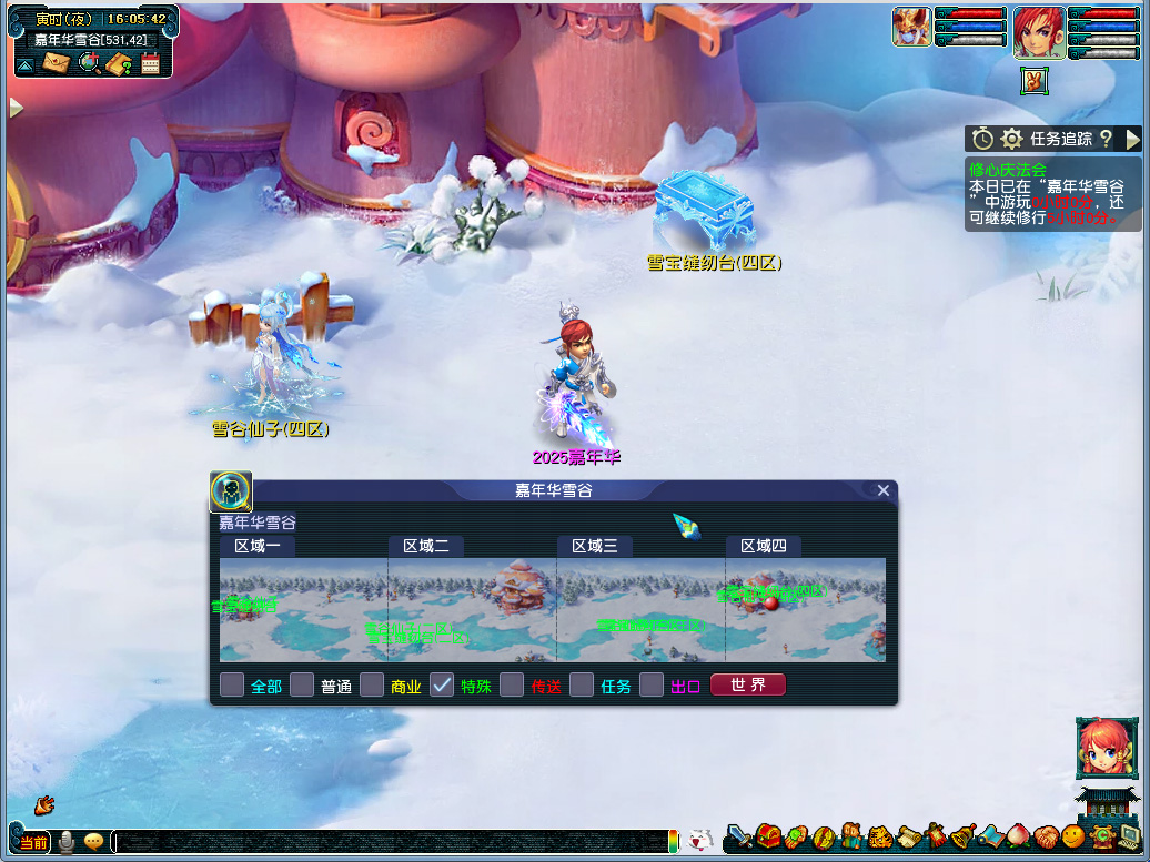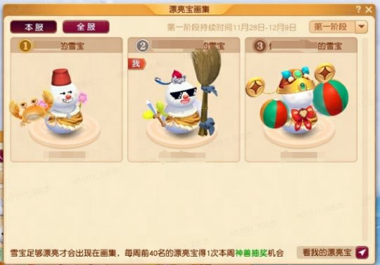 七、雪宝有灵相伴随(雪宝) ①、雪宝有灵相伴随 活动时间 2025年11月28日12:00-2025年12月30日12:00 参与条件 角色等级≥30级,单人 玩法介绍 去年,雪宝堆堆和各位少侠度过了一段非常愉快的时光。经过这一年的修炼,雪宝堆堆变得更加活泼了~它一直盼望着早日见到昔日的伙伴呢。快领取你的雪宝堆堆,一起欢度嘉年华庆典吧! 嘉年华活动期间,玩家(≥30级,单人)可通过长安城(235,115)圆福小和尚或长安城(240,112)雪宝大使处进入嘉年华雪谷,在这里使用“雪宝堆堆”道具,便可以创造出独属于你的雪宝啦! 1、雪宝游园会 活动期间每天19:30和22:15分,雪谷内将举办两场雪宝游园会,将从每台服务器挑选40只最具特色的雪宝!雪宝们将会在游园会活动中一展风采,每位少侠在每次雪宝展示时,可以挑选3个自己最喜欢的雪宝进行投票,当天每台服务器被票选出的最高得票“显眼宝”,其主人将会获得梦晶石奖励,还有机会参与超级黄眉童子神兽抽奖。 2、漂亮宝评选 活动期间每周都将举办漂亮宝评选,玩家可以用心打扮自己的雪宝,在长安城(235,115)圆福小和尚或长安城(240,112)雪宝大使处参与当周的漂亮宝评选,最终每周每台服务器被评选出来的“漂亮宝”,其主人将会获得梦晶石奖励,也有机会参与超级黄眉童子神兽抽奖。 嘉年华漂亮宝评选共分4轮:2025年12月9日11:00、2025年12月16日11:00、2025年12月23日11:00以及2025年12月30日11:00为每个阶段的报名截止时间,圆福小和尚会评选每个阶段每台服务器的“漂亮宝”,在截止当日的12:00公布。不同阶段将会有不同的评选标准,部分装饰品也会在后续阶段相继投放。快去搜集装饰品,让你的雪宝变得独一无二吧! 3、打卡三界 经过一年的修炼,雪宝离开雪谷的本领有所精进,每天能离开雪谷两次,嘉年华结束后还能留下一个分身陪伴少侠。雪宝很怀念去年看到的美景,快带上雪宝再去看看并合影留念吧,今年雪宝也想去看看各个门派和一些新的漂亮地方哦。 活动期间完成28次打卡任务,即可领取雪宝庭院装饰,可以让雪宝的分身在玩家之家一直陪伴少侠。 4、雪宝寻友 看完雪宝游园会,你的雪宝也爱上了穿着打扮,也想跟那些打扮得很显眼的雪宝交朋友,并向他们学习穿搭。而每天都会有40只雪宝入选游园会,雪宝想和前一天的候选雪宝交朋友。 每天8:00~19:00,玩家点击自己的雪宝,选择“寻友”选项即可进入游园会后场,帮自己的雪宝找朋友。请玩家仔细观察场内雪宝的穿搭,如果觉得身上任意一件装饰符合任务提示中的标签,那他就符合雪宝的找朋友要求,找到3只即可完成任务,获得经验和装饰积分奖励。每天可以做2次寻友任务。 特别说明 1、雪宝装饰品可以在嘉年华雪谷的缝纫台NPC处或点击雪宝衣柜中的“获得装饰”按钮,使用雪宝装饰积分兑换,参加环任务、迷你副本、破阵玩法、投放怪、和每日的雪宝寻友、打卡三界玩法都能获得数量不等的雪宝装饰积分,不同装饰的兑换需要小号的雪宝装饰积分不同。 2、每阶段“漂亮宝”决出后系统邮件将通知获奖者,前往长安城(235,115)圆福小和尚或长安城(240,112)雪宝大使处选择“雪宝有灵相伴随-我来领取漂亮宝奖励”即可; 3、雪宝庭院装饰(永久)获取时间为嘉年华活动结束后的2025年12月30日12:00-2025年1月6日维护前,只要在活动期间完成28次合影打卡任务,即可登录获得,请注意及时上线; 4、圆福小和尚回收时间:2026年1月6日8:00。 ②、灵山雪谷庆华诞 活动时间 2025年11月28日12:00-2025年12月30日12:00 参与条件 角色等级≥10级,单人 玩法介绍 盛大法会举办之际,亦可深入雪乡享受片刻静谧。活动期间玩家可于位于长安城(235,115)的圆福小和尚或长安城(240,112)雪宝大使处进入嘉年华雪谷,不仅每3分钟可获得一次经验奖励,还可以在这里堆砌属于你的雪宝哦。 各位少侠进入进入雪谷时即可选择不同分线。当雪谷中的雪宝数量越来越多,仙子会不断开放新分线,你既可以在本分线游览,也可以通过雪谷仙子传送前往其他分线。如果觉得地图太大容易迷路,就打开小地图看看吧。 此外,与雪谷仙子对话,还可以领取一个变身道具,使用后可以在雪谷变身成一个造型随机的雪宝。变身雪宝后无法移动,点击界面下方中央的技能图标,就可以让雪人融化,变回自己啦! 特别说明 1、嘉年华雪谷内不可使用飞行符、导标旗、灵光宝匣、回门派法术,只能通过各区域的雪谷仙子进行传送,使用快捷键“Tab”或点击小地图,即可便捷找到当前区域雪谷仙子的位置; 2、玩家每人每天可以在嘉年华雪谷中修行5个小时,获得100次奖励,之后将不能再获得奖励; 3、玩家每天可以在雪谷仙子处购买九霄清心丸及天机培元丹,获取更多奖励; 4、奖励不受双倍、精修加成时间影响。