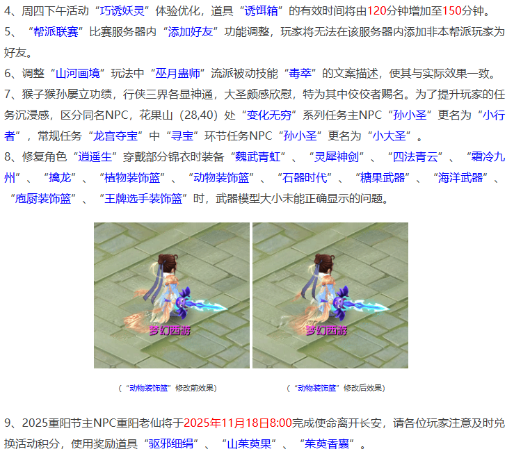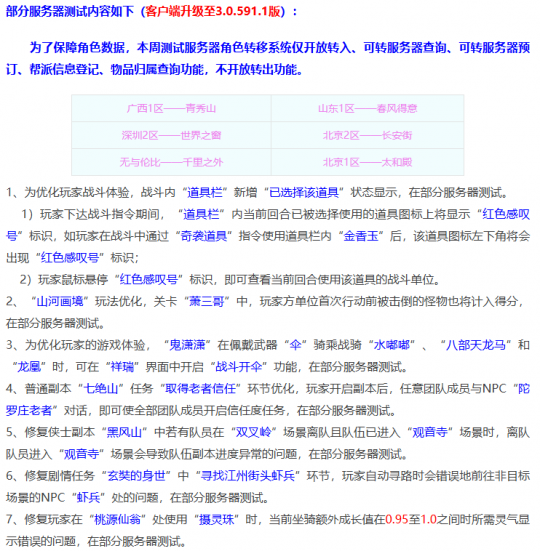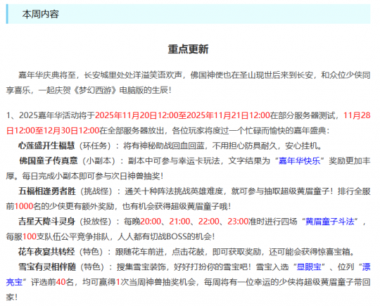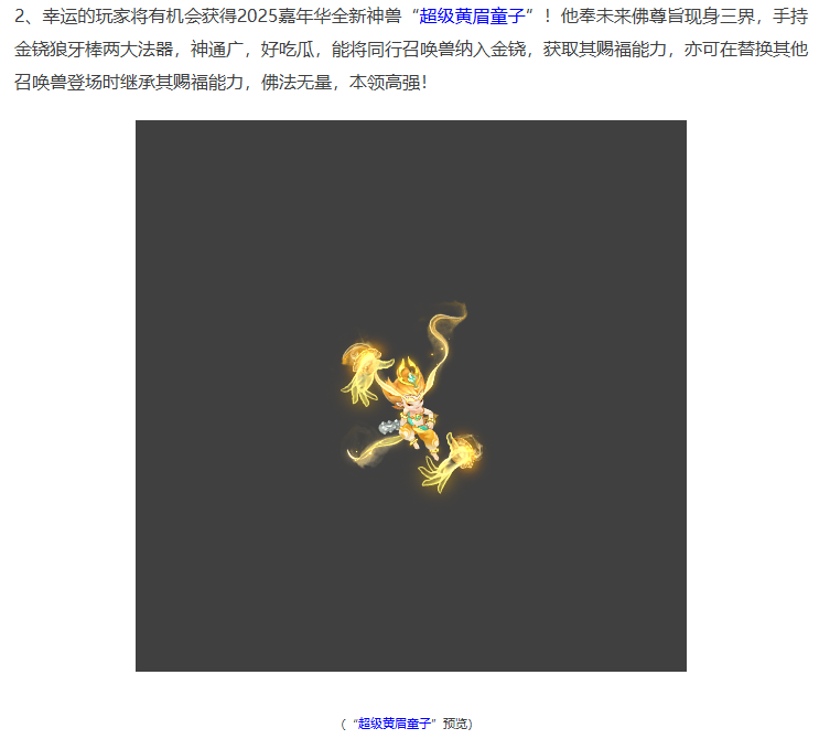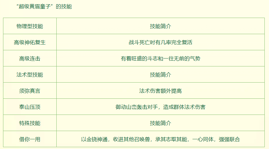在梦幻西游里面,每年的嘉年华活动都会放出新款神兽,今年嘉年华活动同样如期而至,除了常规的活动之外,新的神兽堪称强无敌,物理类型有高连、高偷,法术类型有泰山、须弥、高魔心,功能性技能齐全。下面先来看一下本周的系统维护情况,等下详细介绍一下今年的嘉年华神兽。 本周重点更新,嘉年华活动将在11月20日开启测试,28日全服开放,活动包含环式任务、小副本、挑战怪、整点怪以及特色玩法。 活动新出的神兽名字是“超级黄眉童子”,物理技能有高神、高连,法术技能有须弥、泰山,物理系转生技能:金蝉脱壳、高级偷袭;法术系转生技能:金蝉脱壳、高级魔之心;特殊技能:借你一用(直接出战时,获得绑定召唤兽的赐福已进化技能。(战斗外右键此技能绑定)替换其它召唤兽出战时,炼化继承其技能与属性,并额外进化2个已赐福技能。无法炼化带有否定信仰的或过强的召唤兽)。 本周全服放出的常规内容情况,新服开服时间小于3个月的,登录队列功能优化,提升打击外挂、脚本、挤线器惩处力度;跨服擂台经脉优化;神兽乐园调整为神兽幻境,进入方式不变,维护后小于8天的服务器神兽幻境必定出现超级风泽,大于8天的服务器,随机出现超级风泽。 巧诱灵妖体验优化,诱饵箱的有效时间有120分钟增加至150分钟;帮派联赛比赛服务器内添加好友功能调整;调整山河画境玩法中技能文案描述;修改花果山处NPC同名问题;修复逍遥生穿戴部分锦衣时装备武器显示问题;重阳节活动NPC将离开,大家记得使用积分。 下面是本周测试服情况:战斗内道具栏新增已选择该道具显示;山河画境玩法优化;鬼潇潇在佩戴武器伞乘骑战骑“水嘟嘟”、“八部天龙马”、“龙凰”时可以战斗开伞;普通副本七绝山任务取得老者信任环节优化;修复黑风山副本中有队员在双叉岭场景离队且队伍已进入观音山场景时,离队对于进度异常情况;修复剧情任务玄装身世中环节;修复玩家使用摄灵珠时,当前坐骑额外成长值在0.95至1.0之间同时所需灵气显示错误的问题。 好了,本期的内容到此就结束了,喜欢表弟的记得点个赞。 叶子猪梦幻西游玩家群:1群 325703083 (2000人),2群: 330102322 (千人);3群: 424986787 (游戏疑难解答);4群: 330518295 (商人物价);5群: 1063086037 (疑难解答);6群: 1045753197 (春心萌动);7群: 787195090 (活跃互动);8群: 720665628 (全民PK) [编辑:百晓生]