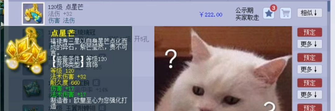 Hi,欢迎来到本期的梦幻精选资讯~ TOP1:222捡漏极品耳饰 玩家闲来无事逛藏宝阁,目光突然被一件耳饰吸引。仔细一瞧,这耳饰竟有2条法伤、1条伤害属性,对于法系而言,属性搭配相当不错。更让人惊喜的是,它居然只标价222块,这简直就是捡漏价啊!虽说在那些追求极致、装备豪华的大佬眼中,它或许只是不起眼的垃圾货,但在平民玩家面前,它可是妥妥能用到毕业的装备。对于像老哥这样的五开党来说,秒下它,那绝对是稳稳地赚了一笔! TOP2:旭旭宝宝罗汉鞋被点天灯30亿? 梦幻西游里,齐天大圣服务器曾有老板退游,一时间引发物价崩溃,市场动荡不安,不少玩家人心惶惶。然而,旭旭宝宝团队的老王组织的拍卖会却呈现另一番景象,多件装备高价成交,其中80级罗汉鞋更是以30亿梦幻币的天价创下纪录。 由此可见,老板退游虽有一定冲击,但装备价值终究取决于属性与需求的匹配程度。只要老板们对极品装备的需求依旧旺盛,物价波动便难撼动高端市场的稳定,就像时间服,物价低迷时,极品装备依旧炙手可热、一件难求。 TOP3:白板之日成就还在也能出无级别 梦幻的卡等级设定是任何游戏都没有的,众多等级段都有玩家选择停留。近日,一位玩家用刚升到29级的小号鉴定装备,没想到运气爆棚,竟炸出一把150级专用无级别法杖,这等神器让旁人羡慕不已。号主兴奋不已,将其转成长枪,各种耍酷。主播老王看到后赶忙提醒,这小号千万别升级。在28级时拿上这把武器,在游戏里简直能横着走,清理小怪几乎一刀就能秒掉,那叫一个威风! 叶子猪梦幻西游玩家群:1群 325703083 (2000人),2群: 330102322 (千人);3群: 424986787 (游戏疑难解答);4群: 330518295 (商人物价);5群: 1063086037 (疑难解答);6群: 1045753197 (春心萌动);7群: 787195090 (活跃互动);8群: 720665628 (全民PK) [编辑:百晓生]