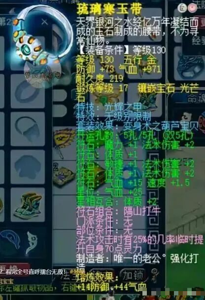 大家好,我是无邪,资深老玩家给你带来梦幻故事! 老王最近随机上号点评,惊险粉丝扮猪吃老虎的,老王看完号以后,直呼擂台无敌,大家一起来看一下吧! 当你看到这个画面的时候,连个限量锦衣跟祥瑞都没有,肯定上了一个穷哥们的号,估计是没啥看的,别着急,下面的装备绝对会惊掉你下巴! 130无级别刀,打了16锻太阳石,伤害达到636,魔力+25,力量+25,特技是玄鸟之灵,大家觉得如何? 130级无级别腰带,防御+87,气血+335,特技是光辉之甲,打了17锻光芒石! 140级无级别衣服,初防+285,力量+26,魔力+30,打了17锻舍利子! 140级的无级别鞋子,防御+97,敏捷+62,打了17锻黑宝石! 150级的无级别男头,初防+108,打了18锻的月亮石。 150级的无级别项链,初灵+235,打了18锻的舍利子! 灵饰是100级的三法伤的戒指,四法伤的耳饰,120级的气血防御法防的11锻的配饰跟手镯,太强了! 三法伤的阳玉跟法防+双防御奇袭的阴玉,然后咱们看看老板的属性,气血+7866,防御+1800,速度+438,法伤+2299,用王总的原话就是这个号擂台无敌,大家觉得呢?这个东海渊在109级的强不强? 叶子猪梦幻西游玩家群:1群 325703083 (2000人),2群: 330102322 (千人);3群: 424986787 (游戏疑难解答);4群: 330518295 (商人物价);5群: 1063086037 (疑难解答);6群: 1045753197 (春心萌动);7群: 787195090 (活跃互动);8群: 720665628 (全民PK) [编辑:百晓生]