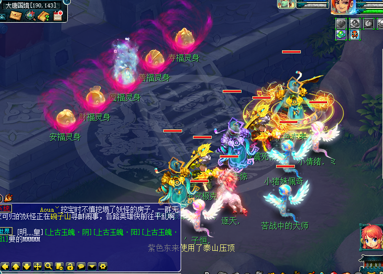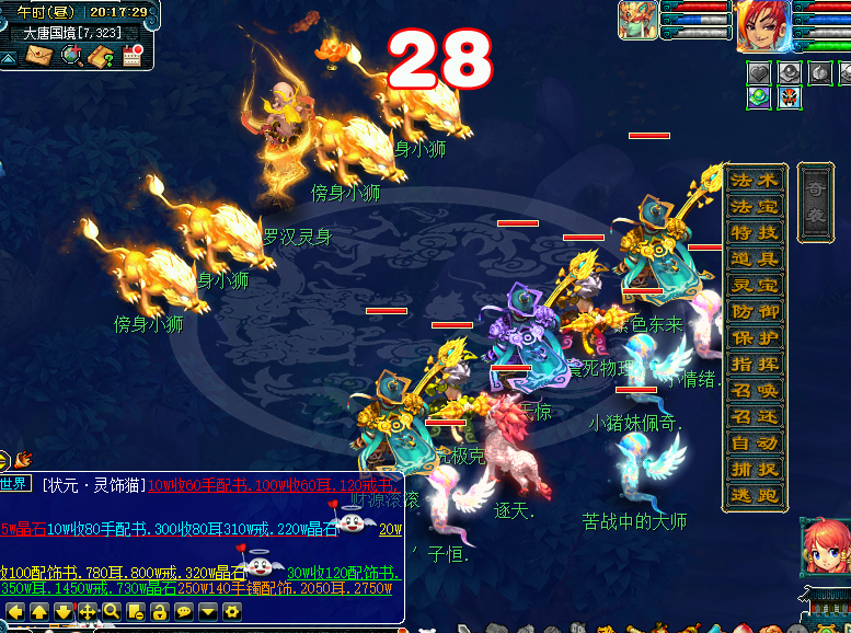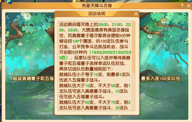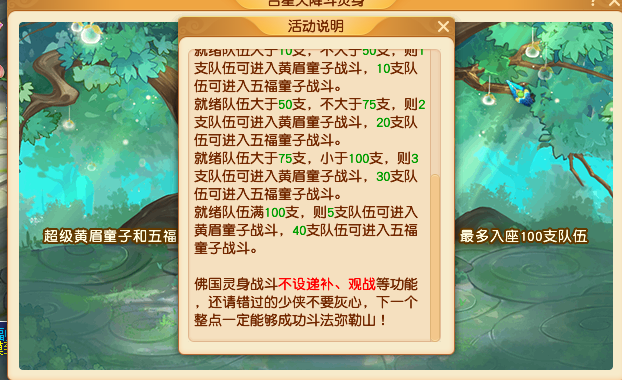 嘉年华庆典在即,龙华法会至,每天晚上20:00、21:00、22:00、23:00四个整点,将有大量佛国天降灵身出现在大唐国境,布道同时,与少侠切磋,玩家(≥30级,人数≥3人)皆可挑战! 其中整点BOSS需要玩家提前5分钟入座等待,因为怪物所处的位置在金山寺山门处,所以要快速过去还得费点机油。 这是玩法的相关说明,我们区号称蝗叔遍地跑的,不过我观察了下,最多一次去了51队,之后每天都在衰减,现在每个整点普遍只去了十来队,可能是奖励不太吸引人。 斗法开始后,系统会以抽签的方式选择幸运队伍,抽到的切入战斗。 不过第一阶段童子还没现身,目前是灵身打头阵,玩家每天至多挑战2次。 中速怪,血量较高,被封印法术则普攻,被封印多个单位不会玉清,建议一个个双封起来。 花果山起状态后就开始神针撼海。 化生会金刚护体/活血。 五庄会烟雨剑法。 法系会泰山压顶。 奖励除了常规的经验、金钱外,几率得宝石、强化石、1个碎片或珍贵的抄本。 但运气差的话,抽不到只能去杀小怪了。 小怪刷在国境随机位置,有点像盘龙岛的怪,是固定的几种类型。 击败沉思罗汉灵身。 主怪:不会动。 净瓶女娲:普陀,会紧箍咒/普度众生。 龙龟:会泰山压顶/落岩。 击败布袋罗汉金身。 主怪:神木,会尘土刃。 小怪:会水攻。 击败欢喜罗汉金身。 主怪:中速化生,会唧唧歪歪。 野猪:中速盘丝,会天罗地网/魔音摄魂。 蝙蝠:没留意。 狸:中速地府,会幽冥鬼眼。 猫灵:狮驼,变身后鹰击,建议封印。 蜃气妖:魔王会三昧真火/普攻。 击败笑狮金身罗汉。 主怪:凌波,被封印了。 小怪:会破血召唤兽。 每只小怪所获的奖励如图所示,几率得1个碎片。 建议整点怪先入座挑战BOSS,若抽不到再去杀小怪,每天总共杀四只,拿满欢乐积分就好了。今年的整点BOSS虽说不用抢,但奖励削弱太多了,策划为玩家减负做出了突出贡献! 叶子猪梦幻西游玩家群:1群 325703083 (2000人),2群: 330102322 (千人);3群: 424986787 (游戏疑难解答);4群: 330518295 (商人物价);5群: 1063086037 (疑难解答);6群: 1045753197 (春心萌动);7群: 787195090 (活跃互动);8群: 720665628 (全民PK) [编辑:百晓生]