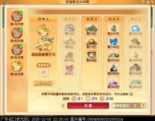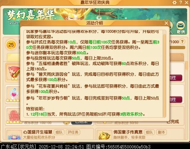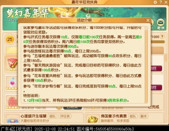 嘉年华第一阶段活动持续进行时,相信大家坚持刷任务主要是为了抽神兽,或者拿到更多的其余奖励,本篇就围绕此玩法,为大家科普一下一些需要注意的小细节。 首先是欢乐祝福,今年删除了变身卡的时间加成,为了推广神通变身,策划一直在努力。 第二项是欢乐积分的获得,除了我们常知的环式、小副本、整点、挑战外,那个“花车夜宴共转经”,就是点退堂鼓那个,建议大家坚持参与,100积分点点就到手了,雪人和那些小游戏玩法可以忽略,今年没人玩了,活动人旁边的雪人每天都是秃头的,没人花时间去打扮它了。 关于成就点,总共有7点,但是挑战黄眉童子的和服务器参与的总队伍数相关,现在入座都是低于五队的,建议放弃。 关于祈愿,第一档奖励建议不抽或留到最后只剩一个晶石再考虑,运气差抽到小66,现在一个跌到2W8了。 第二档是性价比最高的,可以抽神兽,也是目前神兽产出最多的途径,不用说,够五个就碰碰运气吧! 第三档看似奖励丰厚,但是抽一次要30个晶石,性价比不高,可能等你攒够,神兽早被抽光了,万一抽到五宝盒开出避水珠,我觉得你有砸电脑的冲动,所以不推荐。 另外,今年策划也提供了另一种兑奖模式,玩家在参与各类玩法中有较低几率获得珍贵抄本,将其上交给化生寺门口的和尚后,可打折购买物品,若同一物品打折三次则直接获得,适合想稳定拿奖励的玩家,其中令牌是很多玩家垂涎的。 但这兑换模式也有缺陷,首先是这个碎片非常占用背包格子,虽然可以放到仓库,但是万一忘记了,就是一大损失。其次,若将碎片合成晶石,是不能再分解回来的。最后,这些物品每天都是限量的,先到先得,万一你打折三次的物品被人换完了,刚好碰到活动结束,那可倒大霉了。事实上,我觉得这个可以视为一个多拿物品的随缘渠道,只要坚持刷活动攒抄本,白嫖不是梦。 最后附上童子的挑战,话说当时刷到这个我还有点意外,毕竟原来一直是那些植物怪,但是当时没切属性,带的限时腰带,最后只击飞一只怪就团灭了,怪的特性倒是记录下来了。 挑战黄眉灵身。 主怪:会蓄力施法。 蜃气妖:龙宫,会龙卷/龙腾。 巨石守卫(昼):会泰山压顶。 大力金刚:凌波,会翻江搅海。 若挑战成功,可获得1点成就,至于奖励,一般般吧! 叶子猪梦幻西游玩家群:1群 325703083 (2000人),2群: 330102322 (千人);3群: 424986787 (游戏疑难解答);4群: 330518295 (商人物价);5群: 1063086037 (疑难解答);6群: 1045753197 (春心萌动);7群: 787195090 (活跃互动);8群: 720665628 (全民PK) [编辑:百晓生]