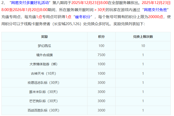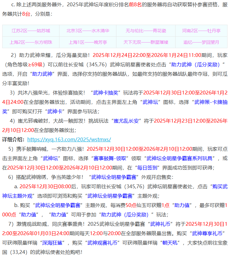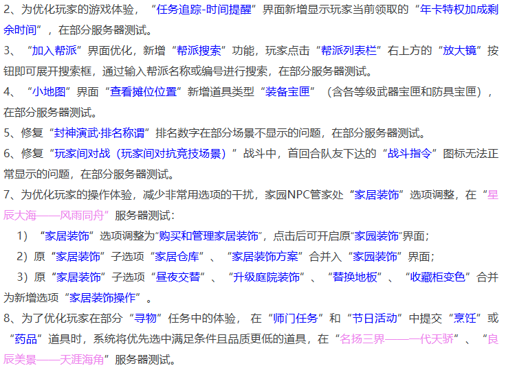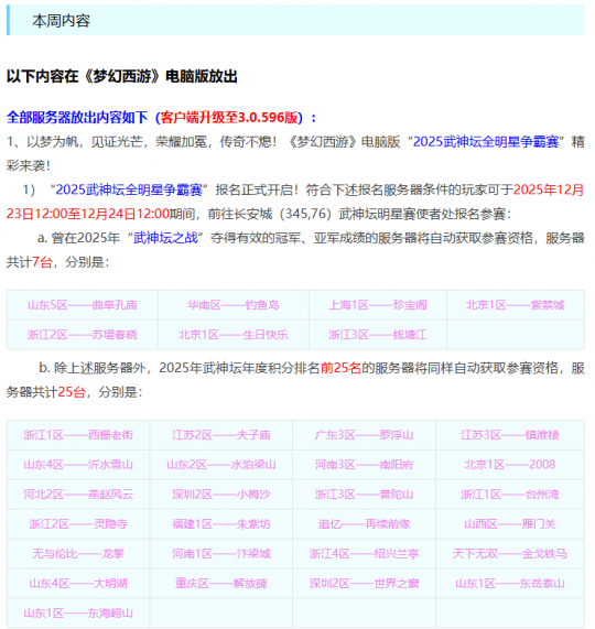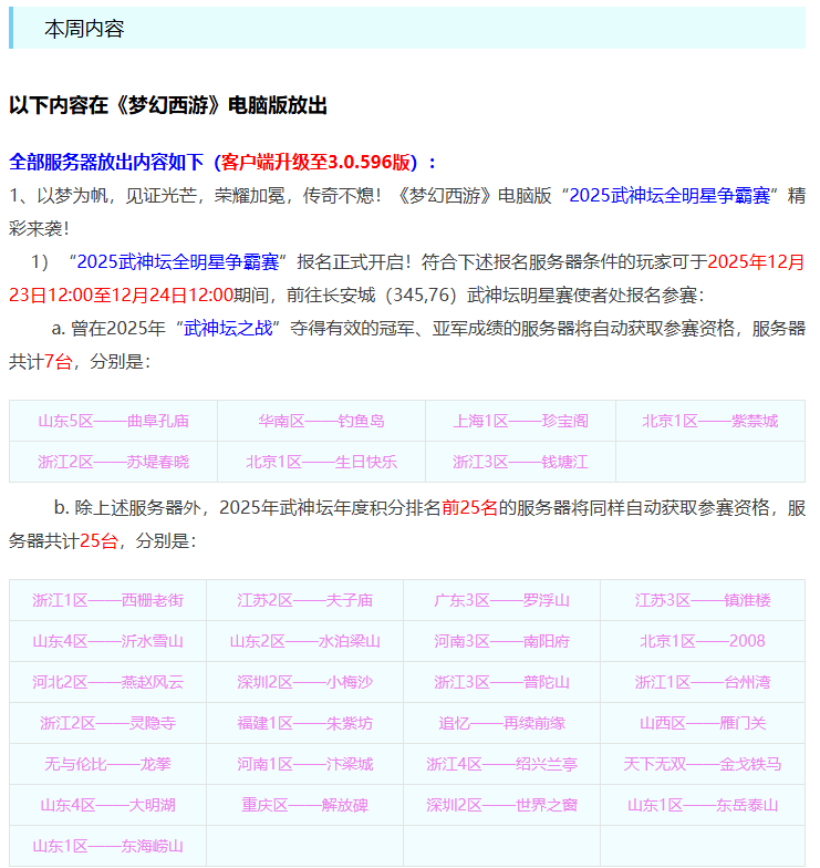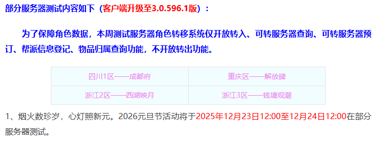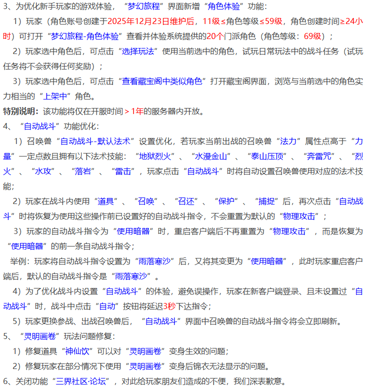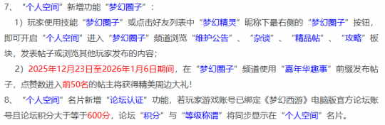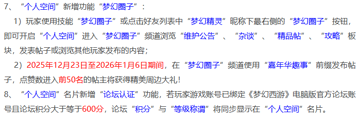 本周二系统维护,大多都是上周测试服内容全服开放,另外本周还新增加了梦幻圈子功能,在12月23日至26年1月6日期间,在梦幻圈子频道使用嘉年华趣事前缀发布帖子,可以获得周边大礼。一起来看看本周的具体维护情况吧。 下面是本周具体的维护情况:2025年武神坛全明星争霸赛精彩来袭,今年的全明星争霸赛有2025年度武神坛冠亚军服务器、积分排名前25名的服务器,另外积分排名前8名的服务器自动获取替补参赛资格。12月30日至26年1月3日,全部服务器限量出售深海狂鲨、朝天吼,重大赛事必定返场的两类祥瑞。 支付好礼活动也将同步开启,积分可以兑换境外旗子、这个才是最实用的。 梦幻旅程新增加角色体验功能,角色创建≥24小时,11级≤等级≤59级可以体验20个门派角色。自动战斗功能优化,召唤兽法力高于力量,自动默认法术攻击,女儿村暗器使用也进行优化。灵明画卷玩法问题修复,修复神仙饮效果。三界社区论坛功能关闭,作为梦幻早期的攻略聚集地,如今各类自媒体泛滥,论坛早就无人问津了。 个人空间新增加梦幻圈子功能,可以在个人空间进入梦幻圈子,频道里面可以浏览:维护公告、杂谈、精品帖、攻略。个人空间名片新增论坛认证功能。 下面是本周测试服的维护情况,2026年元旦活动即将开启,测试服23日至24日开启测试。 任务追踪时间提醒界面显示年卡特权加成剩余时间。加入帮派界面优化,新增加搜索功能。小地图查看摊位位置增加装备宝匣搜索。修复:封神演武-排名称谓;玩家间对战功能。调整家园管家出家具装饰选项;部分寻物任务体验。 好了,本期的内容到此就结束了,喜欢表弟的记得点个赞。 叶子猪梦幻西游玩家群:1群 325703083 (2000人),2群: 330102322 (千人);3群: 424986787 (游戏疑难解答);4群: 330518295 (商人物价);5群: 1063086037 (疑难解答);6群: 1045753197 (春心萌动);7群: 787195090 (活跃互动);8群: 720665628 (全民PK) [编辑:百晓生]