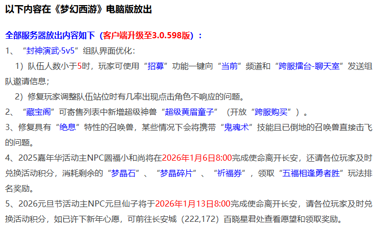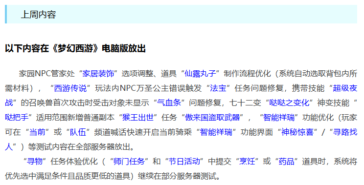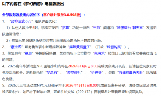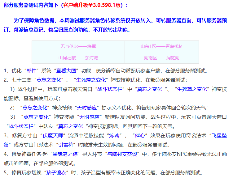 本周二系统维护主要内容有超级黄眉童子可上藏宝阁、可跨服购买,七十二变神变技能优化,方寸山伏魔天师流派优化。另外还有一些其他方面内容维护,一起来看看吧。 首先是上周内容全服放出情况,家居装饰选项调整,道具仙露丸子制作流程优化。西游传说玩法内任务触发错误情况改动,哒哒之变化神变技能优化。寻物任务优化,包含师门、节日活动中交烹饪和药品环节。 下面是本周电脑端的维护内容,封神演武5V5队伍界面优化,队伍人数小于5时可以使用招募功能一键发邀请;藏宝阁新增加超级黄眉童子出售渠道,并且可以跨服购买,这次嘉年华活动送的黄眉童子数量确实不少,早期最高峰的时候价值8W左右,如今已经跌倒2W左右,之前之所以炒到了高价,主要是玩家给超级黄眉童子赋予了PK价值,和PK沾边涨价是必然的,现在的价格才是中规中矩的;嘉年华活动NPC将在1月6日离开长安城,大家的道具和积分要尽快用掉;元旦活动NPC1月13日离开,同样别忘记了积分兑换。 下面是测试服的情况,优化邮件系统查看大图功能;七十二变中莫忘、生死簿神变技能优化;方寸山伏魔天师流派中经脉技能“炼魂”“催心”效果修复;修复神器任务起“墨魂笔之踪”寻人环节;修复玩家切换孩子锦衣时孩子造型情况。 本次系统维护依旧未提及新门派弥勒山相关内容,之前策划爆料将在1月27日全面开放,离之也不远了,新门派、新召唤兽到来,也许会带来不一样的任务和PK格局。 好了,本期的内容到此就结束了,喜欢表弟的记得点赞。 叶子猪梦幻西游玩家群:1群 325703083 (2000人),2群: 330102322 (千人);3群: 424986787 (游戏疑难解答);4群: 330518295 (商人物价);5群: 1063086037 (疑难解答);6群: 1045753197 (春心萌动);7群: 787195090 (活跃互动);8群: 720665628 (全民PK) [编辑:百晓生]