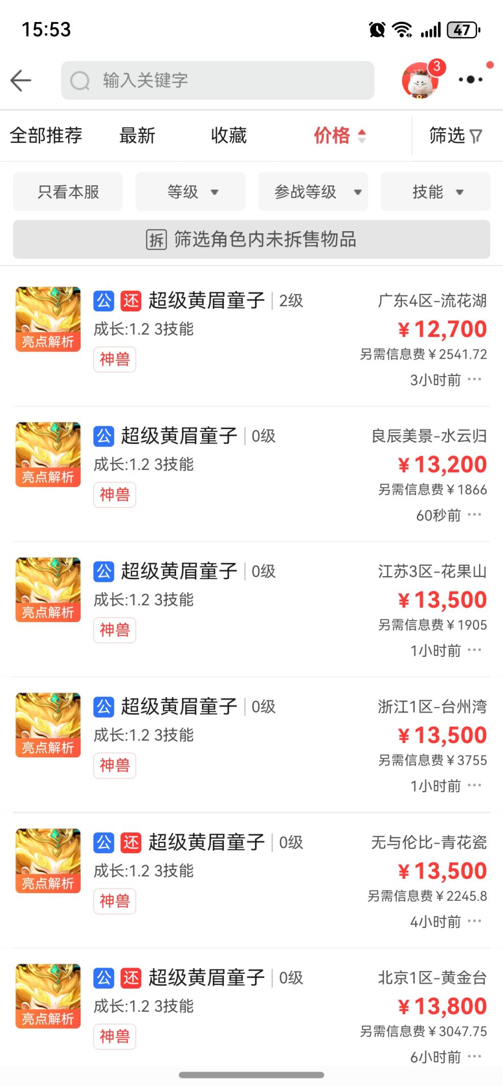 梦幻西游旭旭宝宝惨遇三蓝字之耻,超级黄眉童子CBG最低摆价1.27W