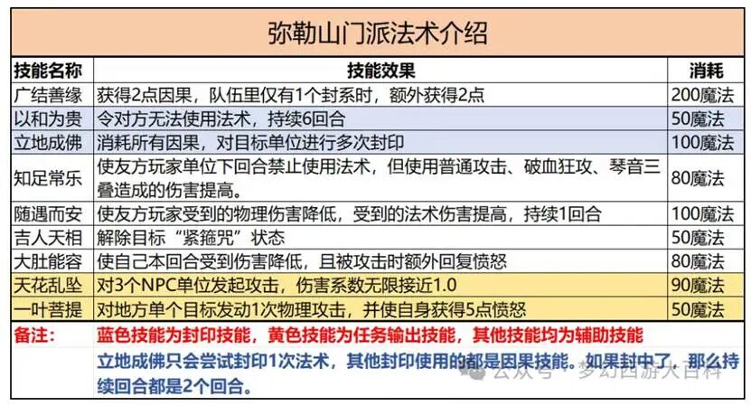 记录梦幻日常,分享心得攻略。大家好,我是阿盐。 梦幻西游全新资料片《灵猴降世》目前已在开发测试服上线测试。 新门派弥勒山和4个新召唤兽的相关信息,已经全面曝光。 弥勒山的定位是特殊封系门派,其封印能力非常多元化。 弥勒山技能分为因果法术和常规法术。 因果法术主要是封印类技能,可以封普攻、法宝、特技、道具,使用需消耗因果值。因果值类似于奶神木的灵药、凌波城的战意。但弥勒山使用因果法术不占用回合数,可以和普通法术在同一回合使用。 弥勒山的普通法术有两个任务技能,分别是物理秒三和物理单体,其余为封印技能和辅助类技能。 此外弥勒山的灵宝非常强大,7点灵元的效果,理论上可以一回合封印对面所有单位,不让其行动。 总得来看,弥勒山是一个极其强大的封系兼辅助门派,有着多元化的封印能力及多元化的辅助能力,各式辅助技能可以防点杀、防笑里、解紧箍咒。 待其正式上线以后,预计会统治各等级的各式PK赛相当长一段时间,直至数值经数次调整后趋于平衡。 当然对于新门派,普通玩家必定还非常关注他的任务能力。 弥勒山目前只有一个流派,其经脉效果也多以增益封印技能为主。不过其第一丹可以让物理秒三的技能,变成物理秒四,经测试伤害系数约为1。 若作为物理门派来刷任务,弥勒山的优势在于其能封印、能稳定秒四,且因为师门技能加面板速度,能够当做高速任务物理来使用,效果接近力女儿。 但缺点是弥勒山的师门技能不加命中,且仙族本身的力量成长就偏低,又没有经脉效果加成,其在任务端的伤害能力,只能说中规中矩,并不适用于作为纯粹的任务物理门派来使用。 至于4只新召唤兽,颜值很不错,且带来了两个新的特殊技能,分别是落岩专精和烈火专精,可以提升单法伤害。 不过尽管其都有两个必带技能,相对好炼妖,但其新特殊技能的效果,目前来看没什么应用前景。 单法目前在各式玩法中最常见的场景耐法电魂闪,用单法打驱散,并不注重伤害。 这种提升单法伤害的特殊技能,当前版本比较鸡肋。 以上就是本次新资料片的主要内容。 更多测试结果后续将继续为各位播报。 叶子猪梦幻西游玩家群:1群 325703083 (2000人),2群: 330102322 (千人);3群: 424986787 (游戏疑难解答);4群: 330518295 (商人物价);5群: 1063086037 (疑难解答);6群: 1045753197 (春心萌动);7群: 787195090 (活跃互动);8群: 720665628 (全民PK) [编辑:百晓生]