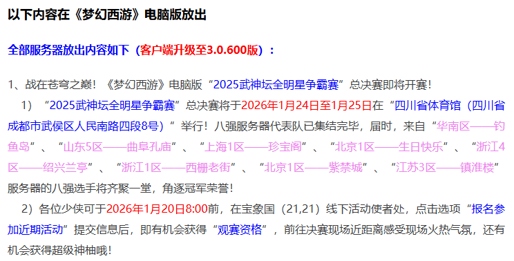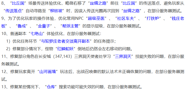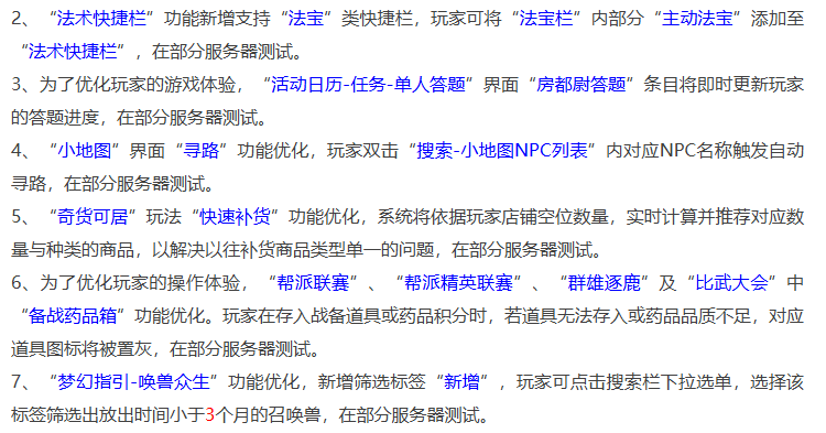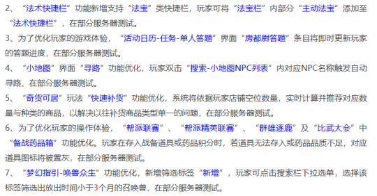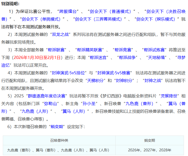 经过开发测试服一周测试,新资料片“灵猴降世”也将进入正式开启测试服,此次资料最大的特色反而不是新门派弥勒山,反而是召唤兽新技能高级单法精通,高级单法精通可以大大提升宝宝单法输出,特别是在须弥加持下,绝对是可以直接秒人的,下面来看看本周的具体维护情况吧。 本周重点更新是新资料片内容,新资料片包含了新门派弥勒山,新角色孙小圣,新召唤兽:九色鹿(兽形)、九色鹿(人形)、翼马(兽形)、翼马(人形),除此之外还出了新的主线剧情、新的单人剧情。在各类PK玩法里面,测试服不与非测试服同步匹配。 本周常规更新,2025武神坛全明星争霸赛总决赛将在四川体育馆举行,八强服务器分别是:钓鱼岛、曲阜孔庙、珍宝阁、生日快乐、绍兴兰亭、西栅老街、紫禁城、镇淮楼。 1月23日新服“高级神佑”开启新服活动,可以获得神兽超级神柚;物品锁体验优化,部分功能将不再需要解锁操作;玩家之家新增荣耀奖杯系列。 赛事大厅界面录像功能新增加支持查看封神演武战斗录像;玩家对战行动条功能将在帮派联赛、帮派精英联赛开放;修复战前检查切换孩子失败情况;修复法宝任务寻物目标为万圣公主时未显示所需道具问题;嘉年华告白日记锦衣礼盒系列将在1月20日停售;嘉年华活动将在1月20日结束。 本周测试服内容:召唤兽“逆境”描述改动,但不影响实际使用效果。 法术快捷栏新增加法宝类快捷栏,今后操作将更加便捷;优化活动日历单人答题界面房都尉答题条目;小地图寻物功能优化;奇货可居玩法快速补货功能优化;优化玩家系列PK操作体验;优化唤兽功能新增标签。 比丘国传送场景优化,略微右移了丝绸之路前往比丘国的传送落点;优化常用NPC显示层级,包含超级巫医、社区车夫、打铁炉、钱庄老板、鲁成、金童子、帮派主管;优化七绝山玩法体验;修复三界洞天技能失败问题;修复离开山河画境玩法后出战召唤兽的默认法术未正确恢复的问题;修复某些情况下仓库搜索功能失效问题。 好了,本期的内容到此就结束了,喜欢表弟的记得点个赞。 叶子猪梦幻西游玩家群:1群 325703083 (2000人),2群: 330102322 (千人);3群: 424986787 (游戏疑难解答);4群: 330518295 (商人物价);5群: 1063086037 (疑难解答);6群: 1045753197 (春心萌动);7群: 787195090 (活跃互动);8群: 720665628 (全民PK) [编辑:百晓生]
