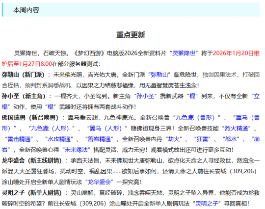 梦幻西游1月20日维护公告解读:新资料片部分上线,特性逆境描述改动