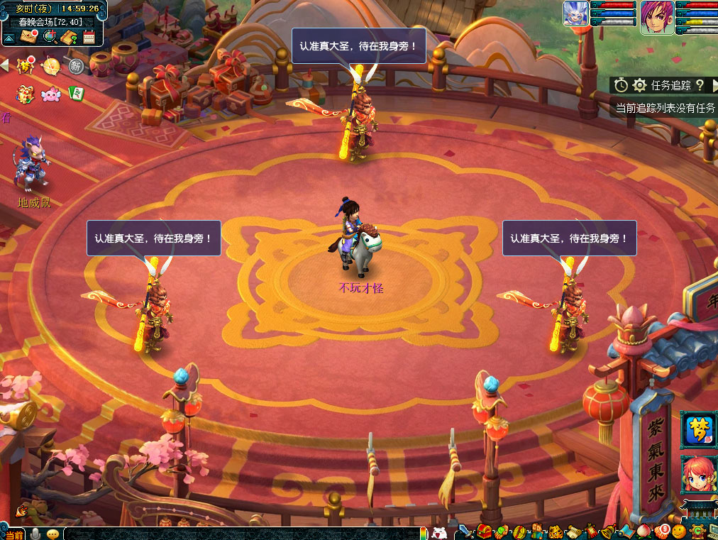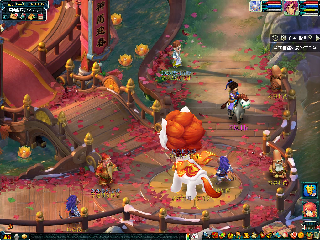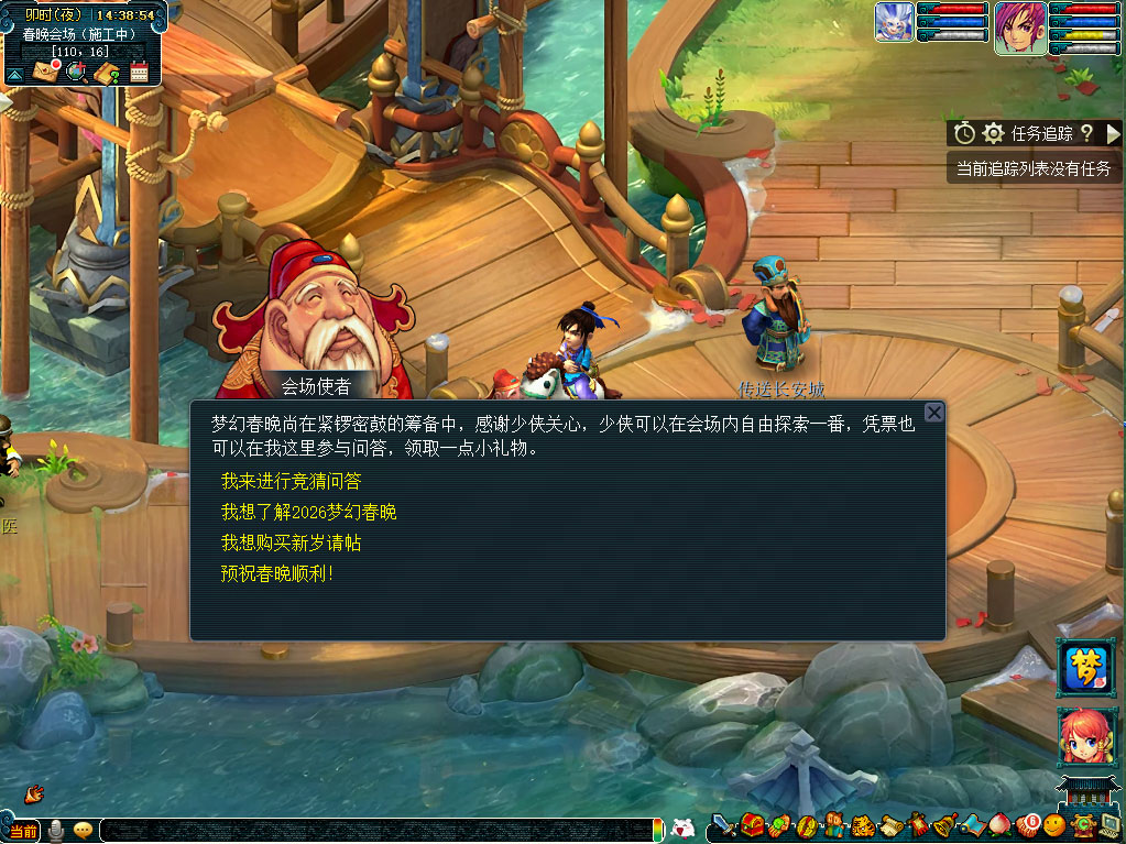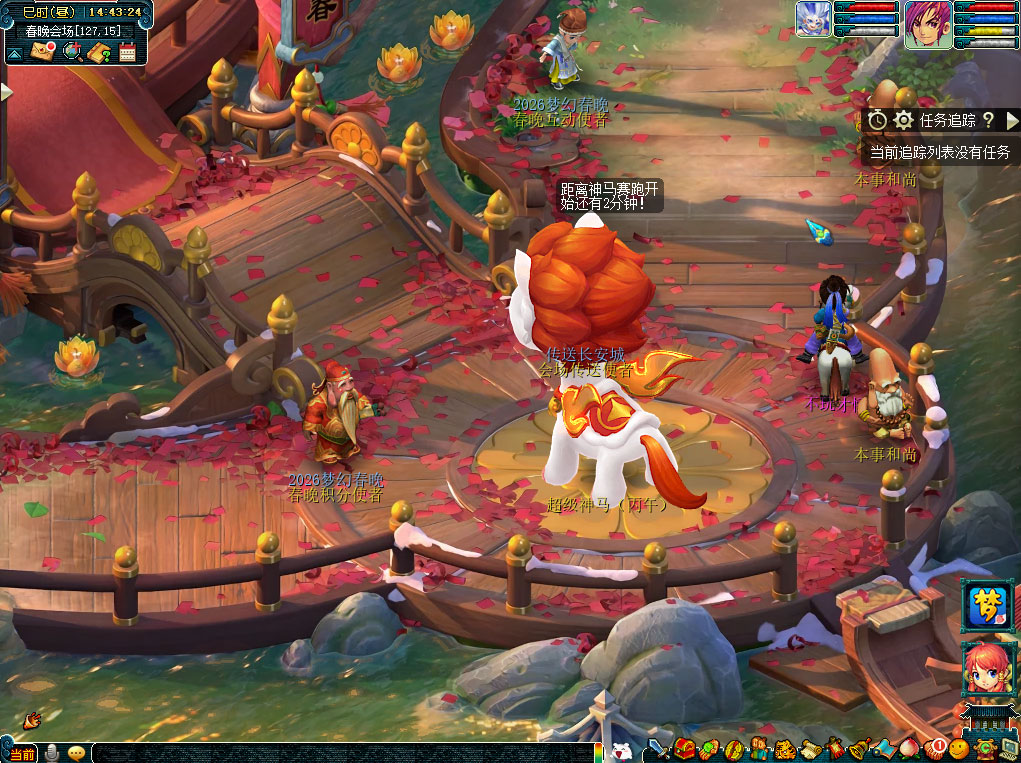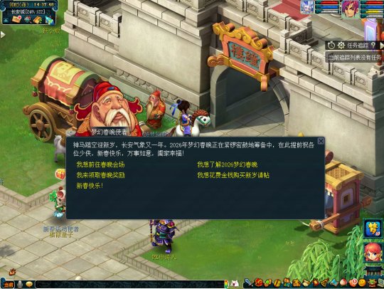 新年新气象,梦幻新春晚!2026梦幻春晚将于2026年2月10日20:00与大家见面,梦幻春晚预热活动将于2026年1月27日12:00至1月28日12:00在部分服务器测试,2月3日12:00至3月3日12:00在全部服务器放出。 1)预热活动期间,玩家可从长安城(245,124)梦幻春晚使者处进入尚在施工中的梦幻春晚会场、购买“超级神马新岁请帖”提前感受节庆氛围; 2)持有“超级神马新岁请帖”的玩家可在2月3日12:00后进入场地参与“春晚答题竞猜”活动,全服前99999名答对全部问题的玩家将获得额外奖励! 3)2026梦幻春晚将有如下精彩节目: 神马赛跑:跟随巨大的“超级神马(丙午)”游历会场,亲密互动薅取“神马鬃毛”,宝贝多多! 真假猴王:认准真大圣,待在他身旁,优胜者有机会获得梦幻周边大礼包! 天降良驹:春晚会场万马奔腾,游戏管理员助你降服遍地小马驹,人人都有机会把神兽带回家! 一、春晚筹备忙 活动时间 2026年2月3日12:00-2026年2月10日19:00 参与条件 角色等级≥59级,单人 活动NPC 梦幻春晚使者(长安城,245,124) 活动介绍 神马踏空迎新岁,长安气象又一年。2026年梦幻春晚正在紧锣密鼓地筹备中,在此提前祝各位少侠,新春快乐,万事如意,阖家幸福! 2026梦幻春晚将在2月10日20:00举行,届时所有符合条件的少侠,凭“超级神马新岁请帖”登记资格即可入场参加春晚活动,“超级神马新岁请帖”可以通过新春活动的欢乐积分达到3级获取,也可以在(长安城,245,124)梦幻春晚使者处花费50000银两购买,使用道具即可完成资格登记,可参与2月10日20:00的梦幻春晚。 所有等级≥30级的少侠都可以在(长安城,245,124)梦幻春晚使者处进入春晚会场(施工中)场地拜访,其中已完成春晚资格登记、等级≥59级的少侠,可以单人找到场地内的会场使者参与预热竞猜问答活动。全服前99999名答对问题的玩家将能获得经验、金钱、物品奖励。 特别说明 1、每名玩家活动期间仅能尝试竞猜答题2次,如两次都答错了问题将无法获得答题奖励。预热活动的竞猜答题活动外测期间不开放,于2月3日12:00后统一开启。 2、春晚会场(施工中)中的所有活动将只持续存在到2月10日19:00,预热活动结束后,所有仍身处场景内的玩家需要主动找场内的会场传送使者回到长安城。 3、2月3日至2月9日期间,每日晚间20:00后,还将有机会在春晚会场(施工中)遭遇少量神秘“嘉宾”来访,击败这些神秘“嘉宾”将有机会获得额外的物品奖励,提前感受春晚氛围! 二、神马大赛跑 活动时间 2026年2月10日20:05-2026年2月10日20:10(第一轮) 2026年2月10日20:40-2026年2月10日20:45(第二轮) 参与条件 角色等级≥59级,单人 活动NPC 超级神马(丙午)(春晚会场,118,12) 活动介绍 超级神马(丙午)将从春晚会场(118,12)起跑,踏遍春晚会场,跟随它从它身上拿到宝贵的“神马之鬃”吧! 少侠需要全程跟随巨大的超级神马(丙午)跑遍春晚会场,在它发光时尝试与它互动,将有机会获得经验、梦幻周边好礼等奖励,该环节更将有最多2名幸运儿可以将超级神马(丙午)神兽带回家哦! 特别说明 1、超级神马(丙午)每次发光时,每名玩家可以从其身上尝试获取5次鬃毛。 2、尝试获取鬃毛时,超级神马(丙午)将会释放法力,将少侠随机变成一种马匹/其他造型,更多乐趣仍待少侠探索! 三、天降有良驹 活动时间 2026年2月10日20:15-2026年2月10日20:25 参与条件 角色等级≥59级,单人组队皆可 活动NPC 天降神驹、黄金神马 活动介绍 超级神马从天而降!活动期间,将会有大量的天降超级神马出现在春晚会场中,少侠们不限单人还是组队均可挑战,成功挑战小马将获得丰厚奖励,更有游戏管理员闯入战斗,尝试助少侠驯服良驹,每轮游戏将有最多5名幸运儿可以将超级神马领回家! 此外,该环节每2分钟,将会有一只黄金神马混入小马驹们的队伍中,找到黄金神马的幸运少侠若能挑战胜利,队伍中将必定有一名成员获得超级神马(丙午)神兽一只!剩余队员也将获得高级魔兽要诀作为奖励,还请少侠们好好发挥手速和眼力,别让黄金神马溜之大吉! 特别说明 1、每只天降神驹将会存在春晚会场10分钟,20:30分所有未进入战斗的小马驹将会离开会场。 2、每一只天降神驹/黄金神马尽可被挑战1次(无论胜利失败),若非最后一轮挑战黄金神马的队伍失败了,则会在次轮额外出现一只黄金神马。 3、每名玩家活动期间最多获得1只超级神马(丙午)神兽。 四、大圣送祝福 活动时间 2026年2月10日20:30-2026年2月10日20:36(第一轮) 2026年2月10日20:50-2026年2月10日20:56(第二轮) 参与条件 角色等级≥59级,单人 活动地点 (春晚会场,77,44) 活动介绍 大圣也来到了春晚会场与少侠们同乐,还带来了几位学习了七十二变神通的小伙伴,少侠们需要在他们之中找出并待在真大圣的周围! 少侠们需要留意春晚舞台上,三名“齐天大圣”的变化手段,找出其中的真大圣,并待在真大圣的黄圈范围内,游戏将进行3轮,每轮能正确待在真大圣身边的少侠将能获得额外的奖励,包含经验、春晚积分,有几率额外获得物品奖励和梦幻周边好礼。 五、良宵同相庆 活动时间 2026年2月10日21:00-2026年2月10日22:00 参与条件 角色等级≥59级,单人 活动介绍 梦幻新春晚,佳节同相庆!2月10日21:00整,春晚结束时分,通过指令或输入发送“人人都玩,不玩才怪!”至当前频道,将获得经验、金钱、物品奖励,更有最多5名幸运儿可以将超级神马(丙午)神兽带回家! 愿少侠们都能度过一个难忘的春晚! 特别说明 1、每名玩家能且仅