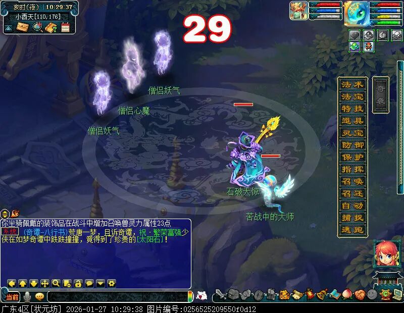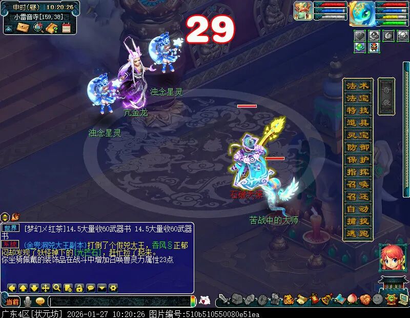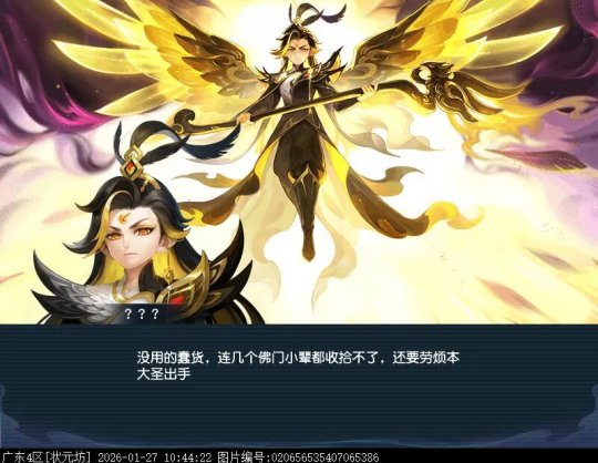 承西天法旨,未来佛现世大唐弥勒山,欲点化天命之人寻经救世,然浊念一派混天大圣嚣狂登场,扰动时空、祸乱因果……1月27日维护后,玩家上线会自动获取新主线剧情“龙华盛会”,在涂山瞳处即可开启全新单人剧情玩法。 剧情改编自小雷音寺,在时空穿梭中加入了未来与过去的碰撞,顺道宣传了下新门派弥勒山及新召唤兽九色鹿、翼马,具体流程大家可以到游戏中自行体验,这里主要给大伙测下战斗及奖励。 制服小妖。 主怪:狮驼,变身后鹰击/连环击。 雷鸟人:魔王,会牛劲/飞沙走石。 小游戏玩法,躲过僧人的扇形扫描,抵达小雷音寺,若被扫到,会回到原点,比较考研玩家对突围时机的把握。 净化亢金龙的浊气。 主怪:天宫,会错乱/天雷斩。 星灵仙子:无底洞,会明光宝烛/地涌金莲/夺命咒。 到这剧情和西游记很接近,玩家被打入金铙里。 制服可疑僧侣。 主怪:化生,会唧唧歪歪/推气过宫。 蜃气妖:地府,会阎罗令/尸腐毒。 阻止混世魔王加害弥勒。(必死战斗) 主怪:魔王,会飞沙走石。 小怪:地府,会阎罗令/尸腐毒。 第三回合,主怪使用龙卷雨击秒飞本方,结束战斗。 与黄眉童子联手击败混世魔王。 主怪:魔王,牛劲后飞沙走石。 小怪:地府,会阎罗令/判官令。 助战九色鹿:弥勒山,会一叶菩提。 助战黄眉童子:弥勒山,会天花乱坠。 然后是新的幕后黑手登场,原来是混元使者,现在是混天大圣,而且这个是凤族的,未来会不会围绕这个推出新召唤兽呢? 最后是翼马登场。 击败亢金龙。 主怪:天宫,会天雷斩/错乱。 星灵仙子:普陀,会紧箍咒/普度众生。 达成剧情后,最终奖励。。。 叶子猪梦幻西游玩家群:1群 325703083 (2000人),2群: 330102322 (千人);3群: 424986787 (游戏疑难解答);4群: 330518295 (商人物价);5群: 1063086037 (疑难解答);6群: 1045753197 (春心萌动);7群: 787195090 (活跃互动);8群: 720665628 (全民PK) [编辑:百晓生]