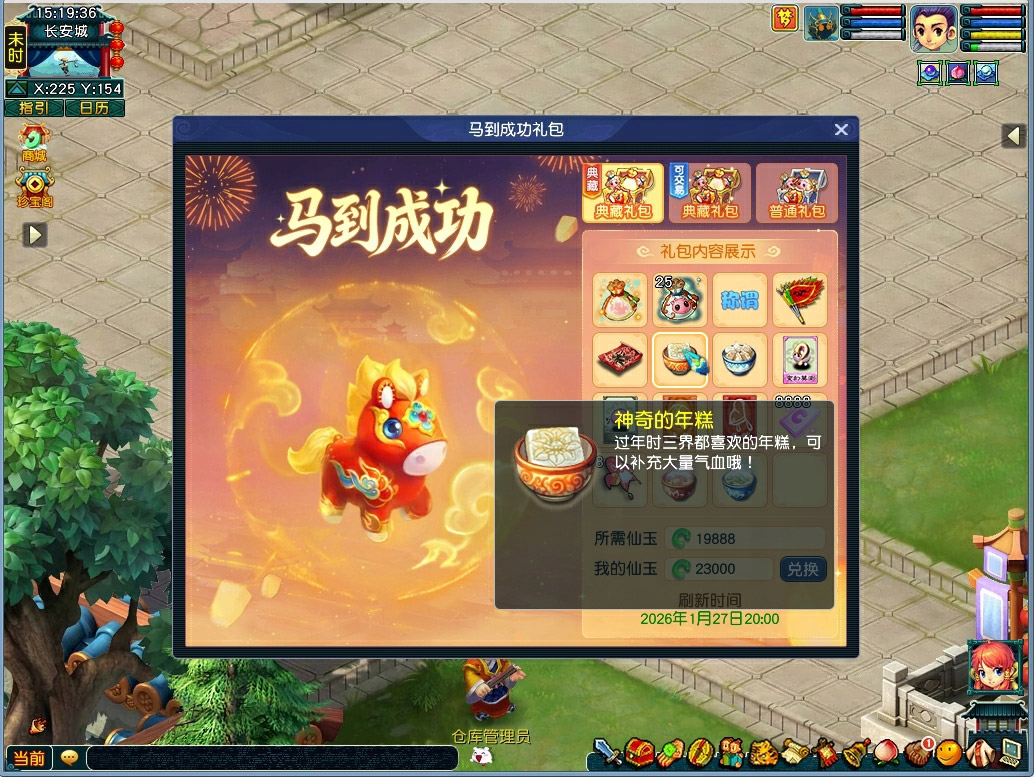 神马赐福,阖家欢乐!“典藏版马到成功礼包”、“典藏版马到成功礼包(可交易)”与“马到成功礼包”将于2026年1月27日12:00在全部服务器开启售卖,届时玩家可点击主界面左上角礼包入口或前往宝象国(33,25)马到成功使者处购买。 一、马到成功礼包 售卖时间 2026年1月27日12:00至2026年2月1日12:00 活动时间内随时可购买。 加售时间 若玩家购买热情高涨,将开启加售,加售时间: 2026年2月1日12:00至2026年2月11日12:00 活动时间内随时可购买。 礼包详情 想拥有属于自己的生肖神兽吗?马到成功,让你离它更近! 礼包内含物品一览 花费6888仙玉购买马到成功礼包即可获得如下内容: 神兜兜*8(绑定)、霓裳积分*2888、马到成功称谓 特别说明 1.购买礼包的玩家需满足角色≥50级,且每名玩家限购1份; 2.马到成功礼包在活动期间内随时可购买,不设总量上限; 3.若玩家购买热情高涨,马到成功礼包将开启加售,结束时间延长至2026年2月11日12:00。 FAQ常见疑问解答 Q: 马到成功系列礼包可以使用免费仙玉购买吗? A: 礼包不可以使用免费仙玉购买。 Q: 购买马到成功系列礼包需要预定吗? A: 不需要预定,当前尚有售卖量时可直接购入。 Q: 我可以购买多个马到成功系列礼包吗? A: 可以,不同礼包可购买数量不同,马到成功礼包限购1个、典藏版马到成功礼包限购1个、典藏版马到成功礼包(可交易)限购10个。 Q: 马到成功系列礼包中的灵兜兜有什么用处? A: 使用灵兜兜+99个神兜兜可以在袁天罡处兑换指定的生肖神兽,目前生肖神兽暂时只有超级神马。 Q: 礼包中的神兜兜可以交易吗? A: 典藏版马到成功礼包、典藏版马到成功礼包(可交易)中的神兜兜可交易;马到成功礼包中的神兜兜带有绑定锁,无法交易。 Q: 购买典藏版马到成功礼包(可交易)后,如何进行交易? A: 在26年2月24日12:00后,此礼包允许本服直接交易,也可以通过上架珍宝阁实现跨服交易。珍宝阁仅支持仙玉上架,礼包定价为19900仙玉起。通过珍宝阁交易成功后卖家需支付5%手续费(非尊享为9%),若为跨服交易,则买家需缴纳额外10%的跨服费用。注意,通过跨服购买的礼包将附带14天时间锁,期间无法流通。 Q: 超级神马可以通过使用99个神兜兜召唤随机神兽获得吗? A: 不可以,生肖神兽不在随机召唤的神兽范围内。 Q: 通过灵兜兜+99个神兜兜获得的超级神马会有时间锁吗? A: 不会有时间锁,允许立即交易。 Q: 超级神马是否可以用于当前的跨服赛事? A: 为保证公平,超级神马在次周的维护后(2月3日08:00)才可以用于跨服赛事,包括剑会天下、决战华山、金马踏春巅峰赛。 二、马到成功礼包(典藏版) 售卖时间 2026年1月27日12:00至2026年2月1日12:00 活动时间内每晚20:00开售。 加售时间 若玩家购买热情高涨,将开启加售,加售时间: 2026年2月1日12:00至2026年2月11日12:00 活动时间内每晚20:00开售。 礼包详情 礼包内包含三重超值大礼等你来拿! 一重大礼—贺岁神兽喜赐福 想拥有属于自己的生肖神兽吗?马到成功,让你离它更近! 礼包中,包含1个灵兜兜,同时赠送25个神兜兜!威武霸气的生肖神兽等着你! 二重大礼—新衣锦绣迎瑞春 新年到,穿新衣,戴新帽! 礼包含衣服兑换券、头饰兑换券及霓裳积分*8888,亮丽的锦衣一起陪你开启新的一年! 三重大礼—年糕饺子乐丰年 过年要吃年糕,包饺子,走亲访友拜大年......礼包中自然也不能少了这些:神奇的年糕、饺子、秘制红罗羹、秘制绿芦羹随时为你补充消耗,而超级导标旗与超级飞行符的组合,更能助你随心所欲,到达想去的地点! 礼包内含物品一览 花费19888仙玉购买典藏版马到成功礼包即可获得如下内容: 1、灵兜兜*1、神兜兜*25、马到成功称谓 2、衣服兑换券、头饰兑换券、霓裳积分*8888 3、超级飞行符、超级导标旗、神奇的年糕、神奇的饺子、秘制红罗羹、秘制绿芦羹、神兽变身卡、泡泡变身卡、传音纸鸢*8 特别说明 1.购买礼包的玩家需满足角色≥50级,且每名玩家限购1份; 2.典藏版马到成功礼包仅在活动期间每晚20:00开售,数量有限售完即止; 3.若玩家购买热情高涨,典藏版马到成功礼包将开启加售,结束时间延长至2026年2月11日12:00。 FAQ常见疑问解答 Q: 马到成功系列礼包可以使用免费仙玉购买吗? A: 礼包不可以使用免费仙玉购买。 Q: 购买马到成功系列礼包需要预定吗? A: 不需要预定,当前尚有售卖量时可直接购入。 Q: 我可以购买多个马到成功系列礼包吗? A: 可以,不同礼包可购买数量不同,马到成功礼包限购1个、典藏版马到成功礼包限购1个、典藏版马到成功礼包(可交易)限购10个。 Q: 马到成功系列礼包中的灵兜兜有什么用处? A: 使用灵兜兜+99个神兜兜可以在袁天罡处兑换指定的生肖神兽,目前生肖神兽暂时只有超级神马。 Q: 礼包中的神兜兜可以交易吗? A: 典藏版马到成功礼包、典藏版马到成功礼包(可交易)中的神兜兜可交易;马到成功礼包中的神兜兜带有绑定锁,无法交易。 Q: 购买典藏版马到成功礼包(可交易)后,如何进行交易? A: 在26年2月24日12:00后,此礼包允许本服直接交易,也可以通过上架珍宝阁实现跨服交易。珍宝阁仅支持仙玉上架,礼包定价为19900仙玉起。通过珍宝阁交易成功后卖家需支付5%手续费(非尊享为9%),若为跨服交易,则买家需缴纳额外10%的跨服费用。注意,通过跨服购买的礼包将附带14天时间锁,期间无法流通。 Q: 超级神马可以通过使用99个神兜兜召唤随机神兽获得吗? A: 不可以,生肖神兽不在随机召