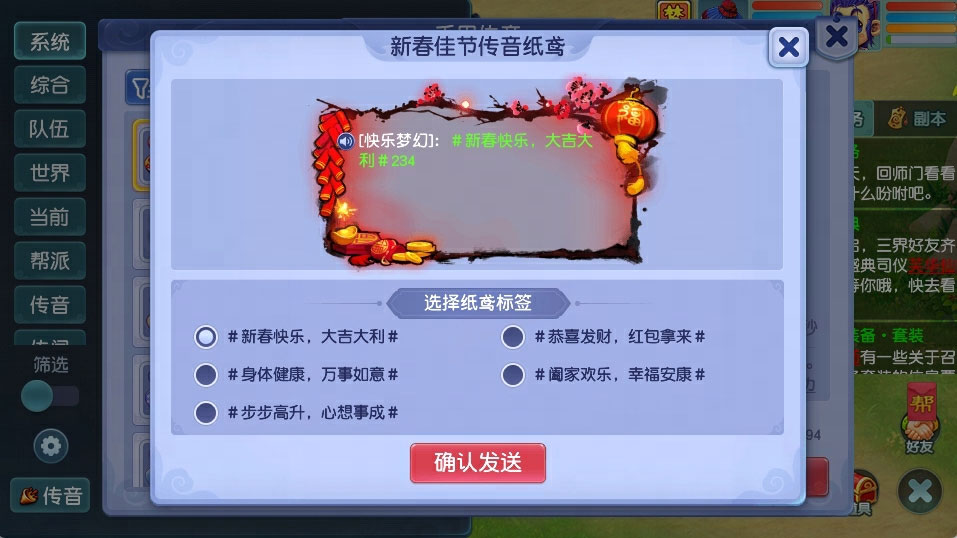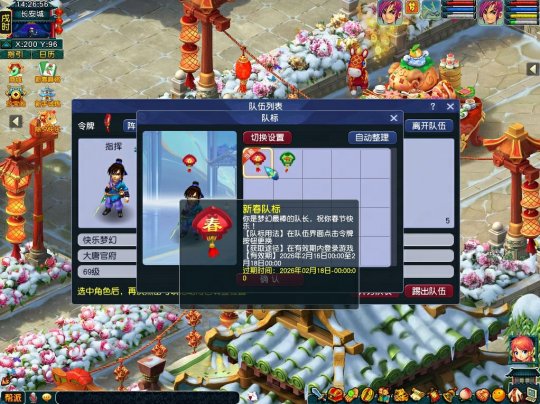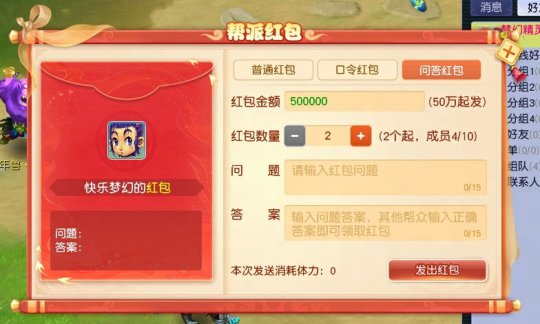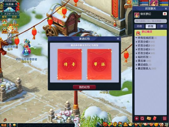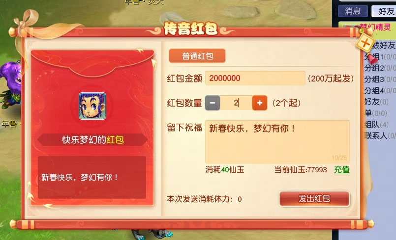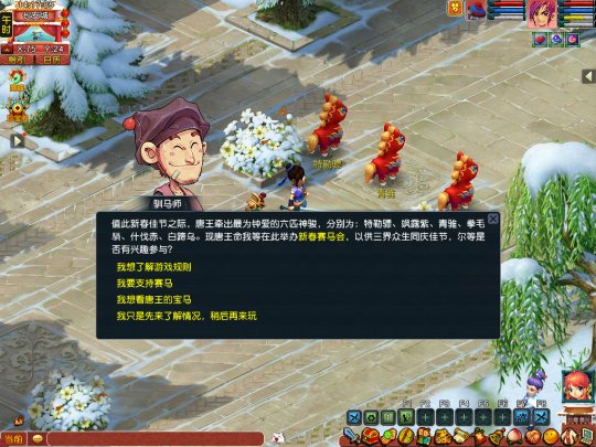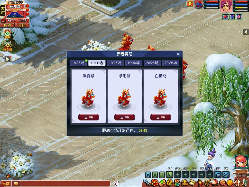 五、新春庙会(趣味) ①、新春红包 活动时间 测试时间:2026年1月27日维护后至2月3日维护(互通版) 全服时间:2026年2月3日维护后至3月3日12:00(互通版) 2026年2月10日维护后至3月3日12:00(电脑版) 活动介绍 新春佳节,红包功能限时开启,为大家增添节气的喜气,点击好友聊天(ALt+F)底部的红包按钮,即可打开发送界面,看看谁会成为红包人气王! (1)发红包 1、请注意自身账号消费安全,≥50级才可发送红包; 2、每日发送3个红包后,再次发送将消耗30点体力; 3、传音红包需要额外支付40点仙玉; 4、红包分配:红包金额将根据所选择的总金额和红包数量进行完全随机分配; 5、红包退还:红包发出24小时后,未被领取的金额将退还给发出者(帮派红包的剩余金额在发送者退出帮派时即刻返还) (2)抢红包 1、同一个红包,每个ID只能抢一次; 2、每日最多可抢50次任意一种红包; 3、抢红包需≥30级。 (3)红包类型 1、传音红包 2、帮派红包 帮派红包分为普通红包、口令红包、问答红包,将发送至帮派群聊。 其中,互通版可通过发送语音完成口令红包的领取。 每日在帮派发送1次红包,当日在帮派频道发言可获得红包前缀;前一日在帮派发红包达到9999万梦幻币,将获得元宝前缀。 特别说明 1、摆摊时无法发、抢红包; 2、特殊服务器无法发、抢红包。 3、点击“我的红包”可查看已领取/发放红包和可领红包。 ②、新春宴席 活动时间 测试时间:2026年1月27日12:00至1月28日12:00 全服时间:2026年2月3日12:00至3月3日12:00 活动条件 活动条件:角色等级≥30级,单人 活动介绍 活动期间每天12:00-14:00、18:00-22:00,少侠(等级≥30级)可在长安城、建邺城、朱紫国、宝象国、西梁女国品尝新春宴席。除夕当天,还可以吃到特制的年夜饭,获得额外奖励。 特别说明 1、每日最多品尝一次新春宴席。 ③、新春赛马会 活动时间 测试时间:2026年1月27日12:00至2026年1月28日12:00 全服时间:2026年2月3日12:00至2026年3月3日12:00 活动条件 角色等级≥30级,单人 活动介绍 唐太宗是爱马之人,新春佳节之际,他命宫廷首席驯马师将六匹爱马带到长安城,于每日晚间进行赛马大会,与大唐子民共庆春节! 活动期间,新春赛马会在每天18点26分、18点36分、19点26分、19点36分、20点26分、20点36分举行,每日共举办6场。每场比赛开始的前5分钟内,找长安(72,22)的驯马师投票支持自己喜欢的赛马,并祝福它率先到达终点。 比赛中你可以助威赛马,合适的时机助威能够使马儿跑得更快。 只要在赛前支持了赛马,无论这批马是否获胜,都将获得支持奖励。如果少侠在比赛中进行了助威,还会获得助威奖励哦。活动期间猜中赛马结果达到5次的少侠,还领取唐王颁发的限定头像,作为好运的见证! 特别说明 1、赛马奖励不受双倍时间影响。 2、每人每天最多可获得2次支持奖励,20次助威奖励。 ④、新春彩蛋 (1)新春传音 活动时间 测试时间:2026年1月27日12:00至1月28日12:00 全服时间:2026年2月3日12:00至3月3日12:00 活动介绍 新春传音限时上架,活动期间在互通版登录,还可享新春传音1折购买福利哦~ 特别说明 1、春节活动结束后,新春传音将无法购买。 2、已购买的新春传音将在3月4日12:00失效,请及时使用。 (2)新春主题界面 活动介绍 新春佳节,三界各地都装扮一新,年味十足,甚至连主界面也换上了新春装扮,在春节活动界面即可进行设置。 (新春主题设置) (畅玩服-电脑版) (畅玩服-互通版) (3)新春队标 活动介绍 2026年2月16日0:00至2月17日维护期间,登录游戏将自动获取新春队标,限时使用,以感谢辛勤带队的队长们。