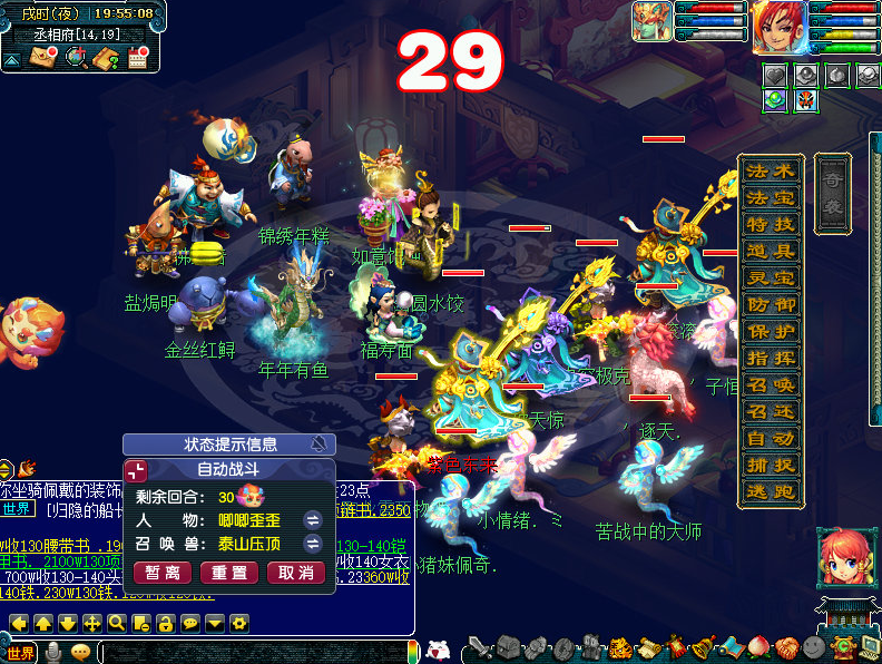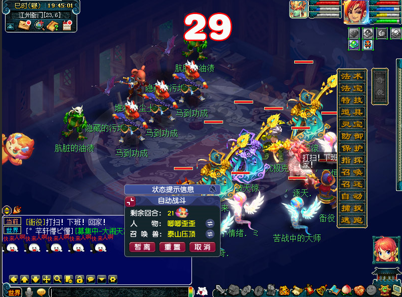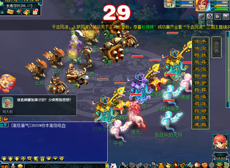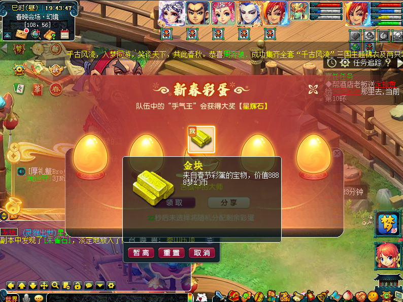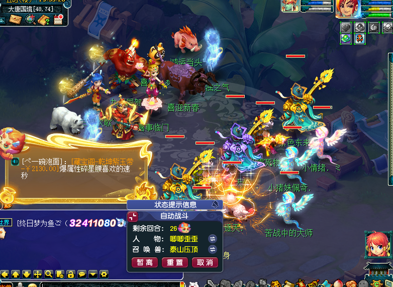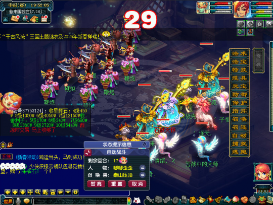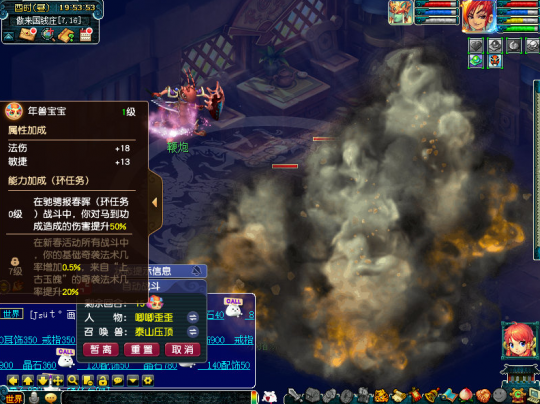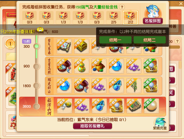 正文开始前补充一下,通过小副本的科普我们已经得知,有二个结局,今天笔者给大家补上第二结局及达成收集玩法后,开启的宝箱奖励。 结局二,帮助县蔚。 主怪:五庄,会烟雨。 小福:凌波,被封印。 蓝色果精:天宫,会错乱。 绿色果精:天宫会雷霆万钧,龙宫会龙卷雨击。 粉色果精:普陀,会点灯。 助战县蔚:化生,会推气过宫。 这样就达成了两个结局,可以领取宝箱奖励了。 有5W6梦幻币,还不错! 好了,开始正文,玩家达成一轮环式所获奖励如表所示,其中紫阳药师会索要三药;国境的边关将士会索要烹饪,但这个NPC坐标不固定,且有限时激励玩法,一接取任务就立即计时了,会把人搞得很紧张,建议烹饪提前备好,或者在送货途中烹饪。 接取到这类任务时,玩家可以利用各个场景地图中的快马加速抵达目的地,前半段是自动加速过去的,后半段就恢复了正常速度。若不使用快马,那就得用飞行祥瑞,否则大概率无法达成激励任务,快马所处位置如图。 开启加速效果后,会出现类似奇袭技能一样的界面效果,不过就送烹饪的有实际增益,其他都是降低战斗难度,因为今年没有灵气结晶,笔者猜测是把送的灵气做到这个环节里了。 玩家有一定概率接到奇遇环,奇遇环承担了宣传春晚活动的作用,一个尴尬的事实是往年官方都有送名额给大神玩家,但是没人要,这次把活动关联到一起了,似乎不用重新开一个客户端了,不知效果会不会好些。 奇遇环,帮助忙碌的工匠。 主怪:化生,会唧唧歪歪。 狂豹:魔王,会三昧真火。 琴仙:会水漫金山。 月影仙:龙宫,会龙腾。 花妖:神木,会四系小法。 牛妖:会四系小法。 律法女娲:没机会出手。 达成奇遇环的同时全员会开启砸彩蛋玩法,可砸出6666、8888、3W8梦幻币,其中3W8是最高奖励,相比往年各种物品还有8W8金钱而言,奖励是被削弱了。 这是为春晚设计的新场景地图。 队长转盘奖励如图所示。 此外,年兽宝宝会在战斗界面的左侧探出头来,点击可以看到属性加成。 其余战斗简单看下,部分和往年是一样的。 购买年货。 主怪:会地狱烈火。 花妖:没机会出手。 长乐灵仙:化生,会唧唧歪歪。 百足将军:魔王,会三昧真火。 红萼仙子:没机会出手。 马面:会四系小法。 点燃烟花。 主怪:会水漫金山。 星灵仙子:没机会出手。 如意仙子:左边神木,会荆棘舞。右边魔王,会三昧真火。 马面:会四系小法。 帮助忙碌的衙役。 主怪:魔王,会牛劲。 蛤蟆精:没机会出手。 大蝙蝠:没机会出手。 马面:会四系小法。 助战衙役:普攻。 放鞭炮。 百足将军:神木会荆棘舞/冰川怒,魔王会飞沙走石。 花妖:会四系小法。 参加新春宴席。 蛟龙:龙宫,会龙腾。 蚌精:神木,会荆棘舞。 花妖:会四系小法。 风波:凌波,会碎星决。 其他怪物没机会出手。 回合开始时怪物会顺时针移动位置。 观赏舞狮。 主怪:开场逃跑。 后排瑞兽:魔王会三昧真火,地府会判官令。 前排瑞兽:大唐会后发,狮驼会变身。 陪刘大伯打麻将。 主怪:会奔雷咒。 机关车:无底洞,会催心术,被击败会自爆,对部分怪物造成伤害。 连弩车:地府,会判官令。 巴蛇:神木,会落叶萧萧。、 其他怪物没机会出手。 小怪击飞后主怪逃跑,战斗结束。 帮小马一起贴春联。 主怪:狮驼,变身后狮搏。 白熊:神木,会落叶萧萧。 小龙女:神木,会落叶萧萧。 狸:魔王,牛劲后飞沙走石。 野猪:会四系小法。 芙蓉仙子:会四系小法。 其他怪物没机会出手。 叶子猪梦幻西游玩家群:1群 325703083 (2000人),2群: 330102322 (千人);3群: 424986787 (游戏疑难解答);4群: 330518295 (商人物价);5群: 1063086037 (疑难解答);6群: 1045753197 (春心萌动);7群: 787195090 (活跃互动);8群: 720665628 (全民PK) [编辑:百晓生]