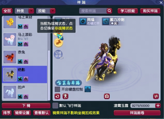 相信少侠们都被祥瑞的【冲刺玩法】吸引到了 而新春祥瑞可不止有冲刺! 今天带来更多祥瑞玩法的介绍。 【冲刺功能:风驰电掣,策马奔腾】 2026年新春祥瑞均携带蓄力冲刺技能,开启技能后, 长按鼠标右键或键盘shift键进入蓄力状态, 松开时开始高速冲刺,最高可进行三段蓄力加速 三段蓄力完美释放时分别消耗1/2/3点凌霄玉露 续航固定消耗1点凌霄玉露。