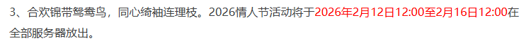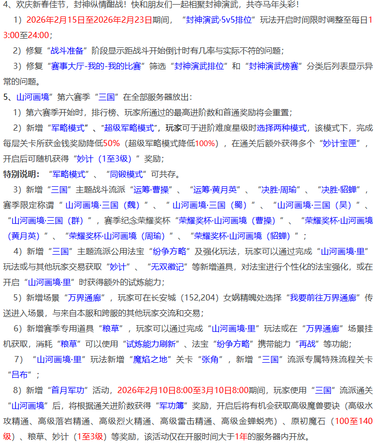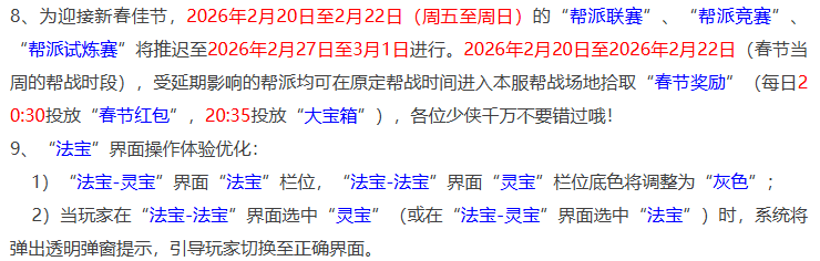 每年新年期间,系统都会开放一次百服平转的机会,所谓的百服平转就是字面意思,大部分服务器包含烟花区都会开放平转机会,这也是鬼区全满号身价暴涨的时候。鬼区一个全满化9角色,转到大烟花区至少甚至10%以上,性价比还是比较高的。至于百服平转是年前的周二开放,还是年后的周二开放就要看情况了,下面来看看本周的系统维护有哪些内容吧。 系统新出永久性签到锦衣,登录即可领取“吕布狮头套”,错过也可以通过补签完成。其次是新春活动2月10日晚上20点开启,此次新春福利到指定场景即可参加,五宝、兽决、神兽都有机会获得,活动放送的福利比较多,只要等级超过59级的角色就可以参与。 今年的情人节活动将在2月12日至16日期间开启,活动分单人和双人类型的,和往年大同小异。 春节期间封神演武玩法时间调整,每日13点至24点都可以参加。山河画境第六赛季“三国”全服开放,今年的嘉年华锦衣也是三国系列,从这点来看,今后可以展望水浒、红楼系列等锦衣。 2025全明星赛事圆满结束。锦衣“盖世方天画戟”进行优化,改动包含逍遥生、杀破狼、剑侠客、孙小圣、飞燕女、骨精灵的动作或战斗姿势等。 春节期间的帮派联赛、帮派竞赛、帮派试炼赛将推迟,受延迟影响的帮派可在原定的帮战时间进场捡“春节红包”和“大宝箱”。法宝界面优化。 一年一度的元宵节活动再次到来,元宵节答题收益比平时日常刷的还高,只要上线就不会亏点卡。元宵节期间最值钱的就是体力,各类与体力有关的物品价格都会小幅度上涨,如:家具、打造、合宝石等,相反,活力在这期间反而价格下跌,如:强化符、3级药、烹饪等。 另外海马的价格也会上涨,反而是百岁香的价格会跌(百岁香是活力做的,很多大佬都会在答题期间批量抛售,市场高度饱和)。 好了,本期的内容到此就结束了,喜欢表弟的记得点个赞。 叶子猪梦幻西游玩家群:1群 325703083 (2000人),2群: 330102322 (千人);3群: 424986787 (游戏疑难解答);4群: 330518295 (商人物价);5群: 1063086037 (疑难解答);6群: 1045753197 (春心萌动);7群: 787195090 (活跃互动);8群: 720665628 (全民PK) [编辑:百晓生]