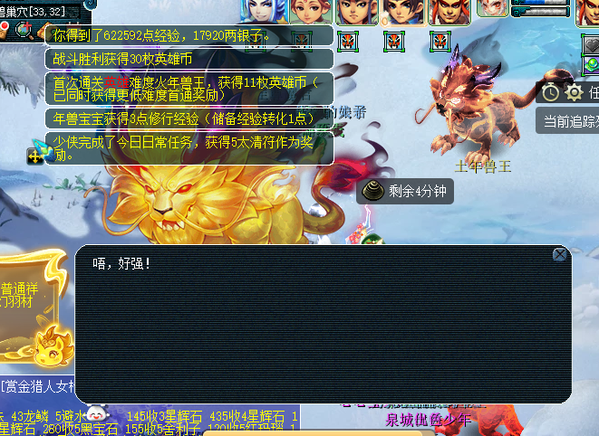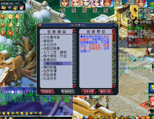 2月13日12:00,玩家上线后会自动获得一个任务。 进入长安城后,按照上北下南,左西右东的方位,可以获取福字的方位,而“财源广进”,很容易令人联想到“钱”,于是可获得福字的具体方位,在钱庄门口。 玩家点击福字,即可捡取,注意!必须捡满三个,获得奖励后,方为获得抽奖资格。 第二个,在超级巫医前面。 第三个,在紫衣盗门口。 如图所示,这样就能获取资格了。至于能不能抽到,最好别抱希望。 下面顺便给大家展示一下新春玩法的一些奖励,还有一些加速拿到奖励的小窍门。在小副本中,传统的方式就是按拼图提示去点亮碎片,但很多人忽视了右上角这个兑换拼图的选项,点击后可以把重复的三张卡片随机兑换成一张新的,虽然也有可能重复,但可以免去很多需要记的地方。 像笔者这样,已经打开全部箱子了。 第二个是最高档位的抽奖,笔者只抽到C66、内丹、灵尘。 关于奇遇环,被替换成了打果精,但是触发奇遇环的概率依然很高,建议把环式作为主刷项目。后面开始有物品了,不知是不是后面才加进去的。 奇遇环,触摸菩提果精。 主怪:魔王,会飞沙走石。 绿色果精:会雷击。 其他怪物没机会出手。 关于年兽挑战,下面是英雄难度的奖励,钱依然少得可怜,就是英雄币多一点,建议日常要刷5个太清符的玩家,优先选择打火年兽,接上罗汉就稳了。 最高档位的转盘,笔者抽到最好的是树苗,但是掉价了。其他大多都是1级星辉石,较低概率给灵尘C66,感觉性价比很低,所以挑战玩法我已经放弃了。 叶子猪梦幻西游玩家群:1群 325703083 (2000人),2群: 330102322 (千人);3群: 424986787 (游戏疑难解答);4群: 330518295 (商人物价);5群: 1063086037 (疑难解答);6群: 1045753197 (春心萌动);7群: 787195090 (活跃互动);8群: 720665628 (全民PK) [编辑:百晓生]