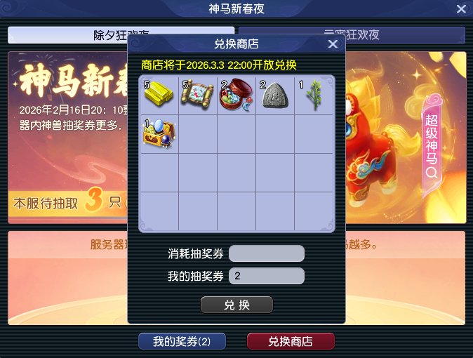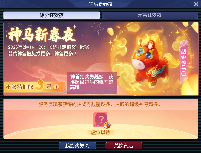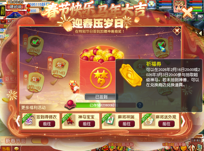 春节到了,相信各位少侠都忙着走亲戚,上游戏的时间少了。不过啊,春节期间有很多优厚福利,特别是在2月14日到2月23日,可以储存体力和活力,等到元宵节活动的时候能取出,用于答题。 下面,给大家介绍一下春节期间的优厚福利。 签到抽超级神马 春节活动的签到活动中,2月4日、2月10日、2月14日、2月16日、2月17日和2月21日签到能额外获得【祈福券】,有机会在除夕和元宵节抽到超级神马。 除夕狂欢夜和元宵狂欢夜,服务器玩家获得的抽奖券越多,抽取的超级神马就越多。现在服务器抽取3只超级神马,往后可能还会增加。 即使超级神马抽不到,抽奖券也能兑换物品,有储备金、宝图、宝石盒子、符石、摇钱树苗和五宝盒子。 若是抽到超级神马就给力了,7个技能带【浮云神马】特殊技能,两个蓝书技能还能通过打书替换,搭配上高级敏捷和高级隐身,妥妥的PK神宠。 各位少侠若是外出无法在电脑前面上号,可以用手机上互通版,一样可以签到领取【祈福券】。 储存体力等元宵答题 在2026年2月14日12:00至2026年2月23日12:00,50级以上带30天尊享权益或者180天尊权益的少侠,根据尊享权益等级和角色等级可以储存不同数量的体力和活力。 在2026年2月27日12:00至2026年3月3日12:00,即元宵节活动期间取出储存的体力和活力。 取出阶段每日自动解锁20%已存入的体活,当日活跃度达到100后额外解锁20%。 这是畅玩服第一个元宵节活动,大家对各种元宵的需求非常大。在测试区,元宵节刚开始的几分钟,就有少侠发传音高价收攻元宵和速度元宵,即使之后价格有所回落,但价值也非常高。 兑换元宵需要灯谜积分,而灯谜积分需要消耗10点体力答题获得。由此可见,体力对于元宵节活动来说至关重要,在2月14日到2月23日储存体力,等元宵节再取出就非常划算了。 在储存体力的时间段,各位少侠即使在外面也尽量上互通版挂体力,不然存少了会很吃亏。 在测试区,即使元宵节活动过去23个小时,大家收购攻元宵的价格也非常高,可见元宵的价值了。 在元宵节活动的时候,大家也可以上互通版挂体力和答题,到时候挂在【卖元宵的兔子】旁边,看积分的变化,若是兑换积分下降就可以换了。 春节期间,大家可能外出走访亲戚、朋友聚会或者是家庭旅游,但是这不影响大家上互通版,加入队伍照样可以做任务。若是聚会感觉无聊,也可以上互通版打麻将,匹配秒排,每局5分钟左右,还有排名。 *扫描二维码,下载互通版 叶子猪梦幻西游玩家群:1群 325703083 (2000人),2群: 330102322 (千人);3群: 424986787 (游戏疑难解答);4群: 330518295 (商人物价);5群: 1063086037 (疑难解答);6群: 1045753197 (春心萌动);7群: 787195090 (活跃互动);8群: 720665628 (全民PK) [编辑:百晓生]