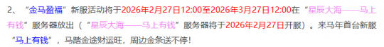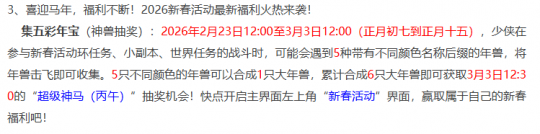 上周百服平转正好是大年初一,很多玩家都忘记了及时上线抢名额,而本周二系统大概率还会开启百服平转,本周二正是上班的第一天,想抢百服平转也比较麻烦,上班族玩家只能手机抢一个名额。对于单开的玩家来说,这个影响不大,而对于五开玩家来说比较麻烦。百服平转一年也就这两次,错过确实比较可惜,下面来看看本周的系统维护情况吧。 首先是口袋版放出元宵节活动,口袋刷元宵很多玩家都吐槽过,但对于大部分五开来说,都不会在口袋刷元宵的,口袋只有商人、实际需求的老板们才会去刷。 2月27日开始,元宵节活动在全服开放,玩家答题可以获得积分,积分可以兑换元宵。元宵节期间对于五开来说,只要在线就是赚钱,随便怎么折腾体力都不会亏本。 另外,元宵节期间各个服务器与体力相关的物品价格都会上涨,大家可以提前囤点货及时清理。1.家具,一级家具、二级家具价格都会小幅度上涨,涨价20%左右。2.高级宝石价格会小幅度上涨,很多宝石号体力都在答题,合宝石摊位价格也会上涨。3.海马价格会上涨,提前1个月收购是最划算的。价格下跌的物品:1.三级药、烹饪、强化符玩家在线时间长,活力溢出,活力相关产出价格下降。2.百岁香,同样是增加体力的物品,百岁香和海马恰恰相反,百岁香每个区都有大量存货,很多五开都会在元宵节期间集中清理,价格下跌很正常。 时间服马年首个服务器“星辰大海—马上有钱”在2月27日开启,如今时间服新区热度并不高,远不如畅玩服,这个马年新区火爆应该不会超过半年时间。 2026新春活动福利,2月23日开始至3月3日期间,参加新春活动:环任务、小副本、世界任务战斗时,会遇到5种带不同颜色名称后缀的年兽,战斗胜利后可以获得对应颜色的年兽,集齐5种颜色可以合成一只大年兽,累积合成6只大年兽可以参加超级神马(丙午)抽奖。 好了,本期的内容到此就结束了,喜欢表弟的记得点个赞。 叶子猪梦幻西游玩家群:1群 325703083 (2000人),2群: 330102322 (千人);3群: 424986787 (游戏疑难解答);4群: 330518295 (商人物价);5群: 1063086037 (疑难解答);6群: 1045753197 (春心萌动);7群: 787195090 (活跃互动);8群: 720665628 (全民PK) [编辑:百晓生]