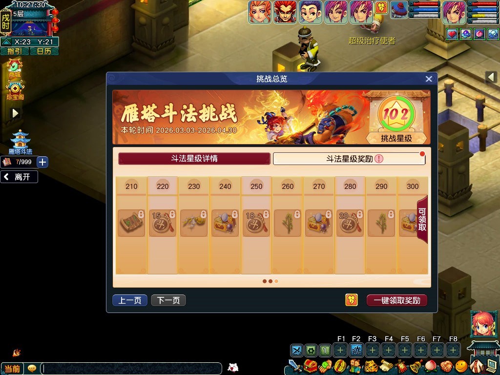 背景 自从唐王设立雁塔试炼以来,尚武之风鼓舞着每个少侠日夜修炼。街道巷陌,到处都是讨论着横扫千军与龙卷雨击谁更强力的三界弟子。有感于此,唐王决定加设雁塔斗法,给各大门派的佼佼者一个展示自己的舞台! 玩法规则 1、服务器开服时间≥45天,通关雁塔试炼40层的单人玩家,可前往长安城(442,221)寻找左果毅都尉开启玩法。 2、雁塔斗法包含“斗法挑战”和“斗法擂台”。 斗法挑战: 1、总共100层关卡,难度随层数递增。 2、每一层关卡有3星星级挑战;通关关卡并累计获得星级,可获得金钱、斗法奖章、摇钱树苗、魔兽要诀、五宝等奖励。 3、挑战关卡时需优先消耗体力。体力不足时,可购买斗法凭证抵扣体力消耗。 4、关卡的挑战进度与奖励将于每月1日0时重置。 斗法擂台: 1、雁塔斗法第20层通关后,将解锁“斗法擂台”玩法。 2、在每周二12:00至下周周一22:00期间,进行挑战。体力不足时,也可消耗凭证抵扣。 3、每周多次重复挑战擂台时,获得经验和道具将有一定衰减。次数在每周维护时重置。 4、根据挑战结果,每周将生成斗法擂台排行榜,并根据排名发放一定的斗法奖章和排名称谓、经验等奖励。 玩法流程 斗法挑战: 1、斗法玩法中,需先在入口招募助战加入队伍。助战将自动施放指令,无需玩家手动操作。 2、挑战关卡,通关后可进入更高层挑战;同时每个关卡都有星级条件,累计获得星级,可获得星级奖励。 3、玩法中获得的斗法奖章,可交给左果毅都尉,有机会获得符石、超级金柳露、摇钱树苗、五宝、高级魔兽要诀等奖励。 斗法擂台: 1、通关20层斗法挑战后,可寻找传送使者NPC传送进入场景,并挑战擂主。 2、根据挑战的数据,将会生成排行榜。排行榜奖励将在结算时自动发放。 其它说明 1、玩家的能力会同步给助战伙伴。提升师门等级、辅助技能等级、装备和宝石等级、符石属性和召唤兽修炼等级均会影响助战的属性。 2、玩法中的助战在战斗后自动回满气血和魔法,不消耗玩家秘制。 3、玩法当前开放50层挑战,后续将会逐步新增关卡。 4、玩法外放当月进度保留,首次重置日期为2026年5月1日0:00。 5、玩法奖励不受双倍时间影响,人物死亡也无损失。 叶子猪梦幻西游玩家群:1群 325703083 (2000人),2群: 330102322 (千人);3群: 424986787 (游戏疑难解答);4群: 330518295 (商人物价);5群: 1063086037 (疑难解答);6群: 1045753197 (春心萌动);7群: 787195090 (活跃互动);8群: 720665628 (全民PK) [编辑:百晓生]