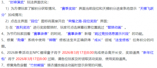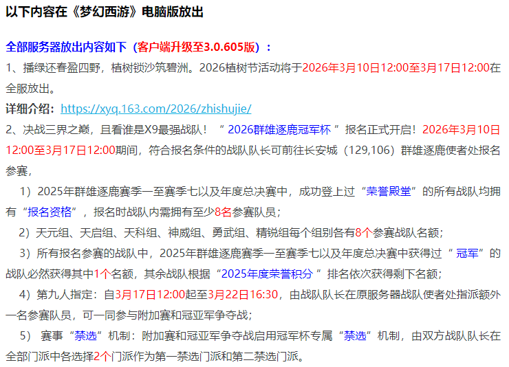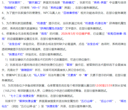 上周全服元宵节活动开启,每个服务器最深的感触就是人多,一线神区更是不要说,晚上排队半小时以上,有的甚至是1小时以上,周末周日没有半天时间根本就进不去。 不过,随着元宵节活动结束,各个服务器也回归到正常状态,今年的元宵节兑换积分有点神奇,活动结束兑换积分反而下降了,特别是攻击元宵,活动期间表弟所在的服务器涨到120左右,现在95左右,早几年积分是一步步上涨,今年反而不温不火的感觉。今年的小兔子3月17日就离开了,胆子大的玩家可以等待一波,最后再冲刺兑换。 下面来谈谈本周的游戏维护情况: 全服开放内容有植树节活动全面开启,3月10日中午就可以刷日常了,植树节活动有环式任务、挑战怪、单人玩法以及挂机四种模式。2026群雄逐鹿冠军杯报名正式开启,时间是3月10日至17日期间。 封神演武玩法优化。回看赛事录像新增加了“跳过竞技信息展示片段”。修复勋章系统重使用神髓修炼法宝相关问题。新春活动NPC将在3月17日离开,新年红包将在同天过期,大家记得及时使用。修复角色佩戴“竹林熊猫”锦衣问题。 优化新角色“孙小圣”的部分资源,其中包含:站立不协调、乘骑不协调、视角等情况。 下面是测试服的情况:新增加英雄副本“虎牢魔影”,该副本50级就可以开启,分普通模式和竞技模式两种,全服开放后开启副本英雄榜。天命副本列表更新,新英雄副本“虎牢魔影”将加入到天命副本。 好友聊天、聊天窗口支持选择色弱模式。召唤兽修炼相关功能选项优化。机缘盘提示优化,这里问一下,大家角色的机缘是不是都满了?修复商会无法收购召唤兽“泡泡”的问题。法宝合成体验优化。快捷法术栏体验优化,2个技能调换位置,被替代的不会消失,这波是干事实了。修复NPC玄云道人相关问题。七十二变快捷变身界面优化,玩家可于“替换快捷设置”界面直接搜索并添加指定属性的“五行山神”、“巡山小妖”、“瑶池仙女”(例如“五行山神·金”)至“快捷变身”列表。 好了,本期的内容到此就结束了,喜欢表弟的记得点个赞。 叶子猪梦幻西游玩家群:1群 325703083 (2000人),2群: 330102322 (千人);3群: 424986787 (游戏疑难解答);4群: 330518295 (商人物价);5群: 1063086037 (疑难解答);6群: 1045753197 (春心萌动);7群: 787195090 (活跃互动);8群: 720665628 (全民PK) [编辑:百晓生]