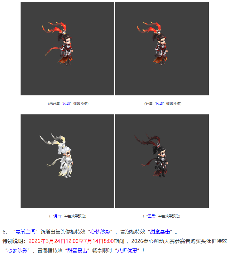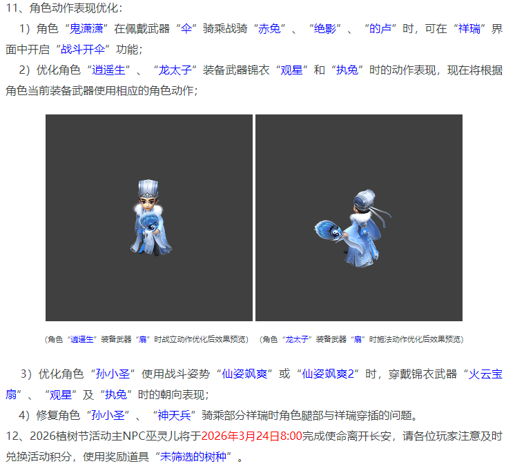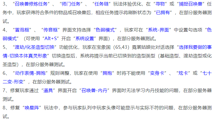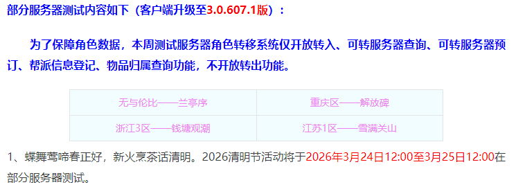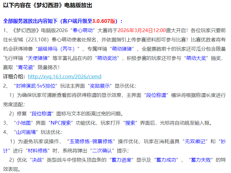 近期各个服务器的金价都在呈不同进度的上浮,不少玩家觉得近期道人会来,按照早几年的惯例,道人和四月大改时间点基本是重合的,大改的目的是减少玩家任务强度,相对应的收益是有所下降,而道人是提升金价的利器,这两两结合,直接把大改的缺陷给弥补了,本周系统维护未出现道人和四月大改任何消息,相信下周的传言会各种起飞了,下面来看看本周的系统维护情况吧。 全服开放内容有:电脑版“春心萌动”大赛将在3月24日开启,奖励甚至有青花瓷锦衣,青花瓷的出现就是神仙打架的场景,五开准备刷票即可。封神演武5V5排位玩法奖励展示显示优化。小地图NPC搜索功能、山河画境玩法优化。 女性角色获得锦衣“貂蝉”后,可前往“2026新春礼盒-礼盒购买-换购”,花费3600点仙玉换购获得锦衣“吕布”,开启飒爽新姿态。系统新增加头像框特效“心梦纱影”、冒泡框特效“甜蜜暴击”。化生寺门派技能特效优化。修复经脉界面偏移问题。 角色“鬼潇潇”在佩戴武器“伞”骑乘战骑“赤兔”、“绝影”、“的卢”时,可在“祥瑞”界面中开启“战斗开伞”功能;角色“逍遥生”、“龙太子”装备武器锦衣“观星”和“执兔”时的动作表现,现在将根据角色当前装备武器使用相应的角色动作。植树节活动结束,NPC巫灵儿将在3月24日8点离开长安城,大家记得及时兑换活动积分。 本周测试服内容:清明节、愚人节2项活动来袭。清明节活动包含环式任务、小副本、挂机得经验模式,另外,每天完成环任务(前100环)和小副本时,有概率获得抽奖道具"寻宝指针",参与特色抽奖活动。愚人节活动是表情大作战,该任务是单人模式,50级玩家就可以体验了。 “召唤兽修炼任务”、“师门任务”、“任务链”玩法体验优化。冒泡框、传音框可选择色弱模式。优化渡劫/化圣造型切换功能。动作表情拥抱规则调整。内丹无法学习问题、唤星阵玩法修复。 好了,本期的内容到此就结束了,喜欢表弟的记得点个赞。 叶子猪梦幻西游玩家群:1群 325703083 (2000人),2群: 330102322 (千人);3群: 424986787 (游戏疑难解答);4群: 330518295 (商人物价);5群: 1063086037 (疑难解答);6群: 1045753197 (春心萌动);7群: 787195090 (活跃互动);8群: 720665628 (全民PK) [编辑:百晓生]