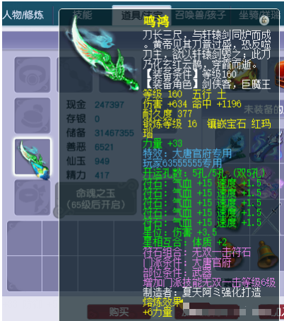 梦幻西游的阁子中有着不少的物品,其实包含了召唤兽、装备、武器、灵饰以及人物角色等等,而高价值的物品,更多的是出现在装备武器以及召唤兽上,能在阁子中看到一个摆出百万级别的角色,那么此号必然不简单。 毕竟即便是化圣九带青花瓷限量锦衣祥瑞的空号也就十多万,而近日来阁子中突然出现的百万大唐号,仅仅是一把武器,直接把角色推上了如此高的价格。下面,来看看武器到底如何。 TOP1:120超级简易双抗封一气血佩饰 对于109神威组来说,一线的神威输出号,那基本上全身都是无级别装备了,由于无级别的加持,所以这样的号输出和生存能力都是很顶尖的。但是,这样的输出号也有一个弱点,就是非常害怕被封系封住,一旦被封住了,那么哪怕在极品的属性,也只能在那里罚站。 所以,现在那些顶级的无级别神威号,除了追求极限属性外,也特别注重自身的抗封等级,就像以前的九黎城一样。今天这枚120级佩饰对于109输出门派,那就很好用了。首先带有超级简易特效,所以109就可以用。另外,这枚佩饰的速度很快,主属性速度有25点,这比极限的27点至少了2点,另外,下排还带有两条抗封,两条抵抗封印等级一起加了51点,气血也加了100点,因此,这条佩饰真的很不错了。 TOP2:丝叔夺冠重金买神衣 就在紫禁城夺冠之后,我们看到区内的绝对大佬的丝叔,也是继续更新。这次他买的这件衣服,我们看到虽然没有带什么物理暴击。但是属性和蓝字,都是属于很完美的了。 初始防御就达到了311点,距离非专用的极限,那也是不远了。另外还加了27点的体质和31点的力量。蓝字也是给力的,特技上面是破血狂攻,然后特效是一个精致。也就是说它能打到17级的月亮,这样的衣服一穿,综合属性提升就太高了。 TOP3:百万大唐仅凭一刀 这个价值百万的大唐号上所带的160级的专用武器,仔细一看居然是服战级别的,因为它的基础伤害就有着634点,在打上16级的玛瑙石后,命中是到了1196点,同时在下排的附带属性上有着33点的力量加成。 而熔炼效果后力量上再次提升了6点,那么这把武器的综合伤害直接到了1058.79点,对于任何一个服战的物理大佬来说,一把专用高伤武器是非常的关键。这也是能卖到如此高价的原因所在了。 叶子猪梦幻西游玩家群:1群 325703083 (2000人),2群: 330102322 (千人);3群: 424986787 (游戏疑难解答);4群: 330518295 (商人物价);5群: 1063086037 (疑难解答);6群: 1045753197 (春心萌动);7群: 787195090 (活跃互动);8群: 720665628 (全民PK) [编辑:百晓生]