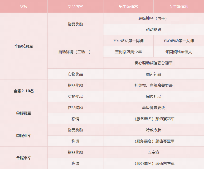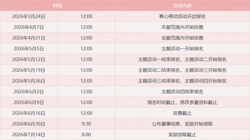大赛日程:从本服到全服的颜值PK征程 2026“春心萌动”大赛将于3月24日12:00正式开启;4月7日12:00将开启本服范围内的投票;4月21日12:00将开启全服范围内的投票。 本次“春心萌动”大赛还将于5月5日12:00起上线四大趣味满满的主题活动,大家亦可敬请期待!小编只能说,真的非常有趣哦! 小编将2026“春心萌动”大赛的详细日程整理成表,各位少侠可直接保存图片。 参赛规则:一场人人都可以参与的颜值趣味大比拼 2026“春心萌动”大赛分为两个组别,分别为男生颜值赛和女生颜值赛,每位玩家只能参加符合游戏内角色性别的组别比赛。 报名条件: 1、报名者图片资料性别与游戏角色相符。 2、等级≥50级。 报名地点:长安城(225,108)春心萌动使者处。 (参赛资料要求等说明请见活动专题:https://xyq.163.com/2026/cxmd/rule.html)