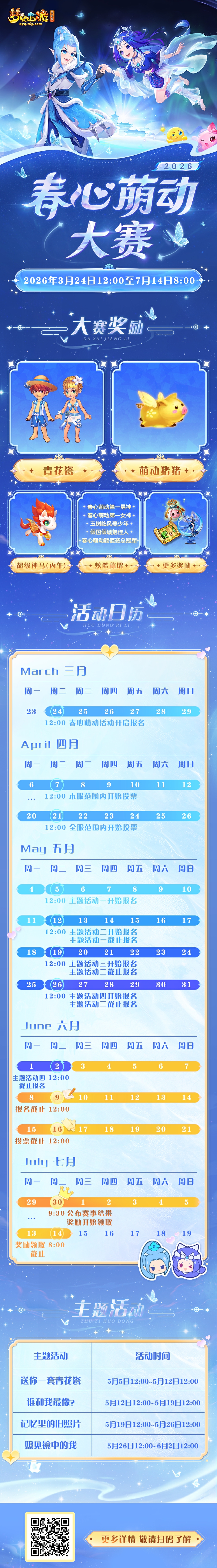 以上就是本次2026“春心萌动”大赛的活动详情和规则介绍啦!小编还贴心的为各位少侠准备了一图流的活动介绍长图,方便各位少侠保存和分享。 这个春天,让三界见证你的风采 一年一度的“春心萌动”大赛,不仅是一场颜值与才华的比拼,更是为各位《梦幻西游》电脑版少侠准备的一场盛大聚会。在这里,你可以: 结识志同道合的三界好友! 展现自己独特的才华与魅力! 争夺一年仅有一次的珍贵游戏奖励! 成为服务器乃至全服的焦点人物!