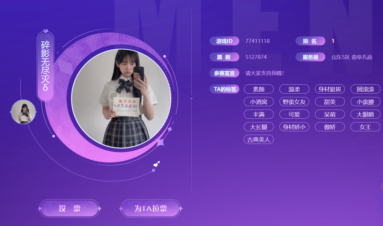 男生颜值赛明星选手 男生组的较量不止看颜值,更看气场!从票王天花板到收藏大佬,每一位冠军都有自己的独特魅力,承包了梦幻玩家的少女心。 玩家昵称:?白来烦我 服务器:大观园 谁能想到,2022年第7届“春心萌动”大赛的票数纪录,至今还没人能打破! 「白来烦我」在2022年以20172879票的恐怖成绩,斩获男生组冠军,这个票数直接碾压历届选手,堪称春心萌动“票王”天花板。他的“霸道总裁”形象深入人心,参赛宣言一句“金猪冲了兄弟们”,霸气又接地气,成为无数玩家心中的梦幻男神,辨识度直接拉满! 玩家昵称:看山 服务器:2008 2019年第4届“春心萌动”男生组冠军,「看山」参赛的初衷竟然只为圆自己一个青花瓷锦衣梦! 作为梦幻圈知名的“大收藏家”,「看山」的藏品堪称“梦幻博物馆”:绝版变异护卫、属性为负数的召唤兽,还有「三刀结束」等传奇角色,每一件都让人羡慕。凭颜值夺冠,凭收藏出圈,这才是梦幻大神的正确打开方式! 玩家昵称:天地寻龙鳞. 服务器:紫禁城 2023年第六届春心萌动男生组冠军,凭着断崖领先的票数,轻松登顶男神宝座! 「天地寻龙鳞.」不仅颜值出众,更是梦幻西游的忠实玩家,长期坚守紫禁城服务器,助力服战队发展,多次斩获武神坛、群雄逐鹿比赛冠军,颜值与实力双在线,妥妥的紫禁城牌面!
