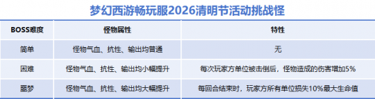畅玩服清明节活动来了,时间为2026年4月2日12:00至2026年4月9日12:00。大家可以在活动期间参与放纸鸢、杀挑战、经营酒家和赠送青团等任务,领取丰富奖励。 专题页链接:https://xyq.163.com/my/2026/qmj/ 翩翩纸鸢:控制好风向 活动期间,≥30级的少侠活跃度达到40和80时,可分别领取纸鸢和彩鸢。 根据提示前往指定场景位置放飞纸鸢可获得经验和储备金奖励。 需要注意的是彩鸢比纸鸢更难控制,到达场景后需要根据提示找到位置,然后需要手动做小游戏,控制彩鸢在指定位置才能完成。 第一次放彩鸢可以试玩小游戏,使用键盘的左右键控制彩鸢,让其在剩余时间结束的时候停在绿色区域即可。 魂安故里:挑战BOSS 活动期间,≥50级的少侠可以组队在长安城(225,121)找大唐雅士通过对话选项打开挑战界面,也可通过活动主界面或日历【魂安故里】标签打开挑战界面。 该挑战玩法共有3个BOSS,每名BOSS设有简单、困难和噩梦三个难度,少侠可自选难度进行挑战。成功挑战不同难度可解锁对应品质的宝箱 。 游荡孤魂BOSS是狮驼,变身后使用鹰击打面伤,可以被封印,但回合结束会自动解除。这关的特点是游荡孤魂每回合都会附身一个怪物身上,然后蓄力,若是下回合无法打断则会造成群体伤害。 队员之间需要相互配合,集火打断其施法,避免被群体面伤。人物的血线若是有压力,可以封印BOSS。 无名悍将BOSS是大唐,后排4个小怪会给它提供增益效果,连弩车提供反击,马面提供速度,野猪精提供防御,黑熊精提供伤害。将后排小怪击杀后,BOSS对应的增益效果就会消失。 黑熊精是狮驼岭,伤害比较高,建议先击杀,同时也能降低BOSS的伤害。连弩车是魔王,伤害较高,击杀后BOSS不会反击,召唤兽集火会安全很多。之后再击杀野猪精,这样BOSS的增益抗性会消失,更方便击杀。 阴煞邪祟BOSS不参与战斗,但是若有小怪倒地,会将其祭献提升怪物的伤害,同时会让后排一个怪物转成变异,伤害更高。怪物全部被清理后,BOSS会逃跑,战斗胜利。 BOSS每次祭献前排小怪都会说话,达到一定次数后,后排的怪物会变换成其他门派,更具攻击性。建议整体面伤输出,压低对面血线,等BOSS祭献后,后排小怪转成变异就集火。 每名BOSS每日仅可领取一次奖励,大家可以根据自身情况选择难度。 清明酒家:制作饮品 活动期间,≥30级的少侠可以通过活动主界面、日历【清明酒家】标签或背包中【清明酒家】道具打开活动界面。 少侠即使在战斗中也能操作【清明酒家】,可以制饮、运送和修炼,丝毫不耽误战斗。 订单:玩家在线会持续获得订单,少侠只要根据提示制作,运送过去便能解锁对应NPC的故事。若是无法制作饮品,可以去解锁后再制作或者取消订单。 制饮:消耗灵力和情思可制作饮品,灵力可通过在线自动恢复和投喂谛听三药(除金创药)获得。每个三药能增加谛听50点灵力,同时获得人物经验,3次后只能获得灵力,无法获得经验。 制作饮品补充库存后,可运送饮品完成订单,完成订单后可获得情思。不断制作同一种饮品可提升该饮品熟练等级,从而解锁更高级的饮品。 饮客故事:饮品能降低饮客苦闷度,苦闷度降低,谛听能听到他们的心声,并把这些故事记录在饮客集之中。每个饮客的故事全部解锁,还可以领取一份谢礼。 另外,解锁饮客故事每达到20%进度即可解锁一个宝箱奖励,有机会获得魔兽要诀和符石等奖励。 修炼:订单获得情思后,可以通过谛听修炼提升酒家和自身的各种能力,譬如增加库存和订单上限就比较实用。 战斗的时候可以操作【清明酒家】,这样就方便很多。根据订单情况制作并解锁更高级的饮品,运送饮品后获得情思,解锁故事,通过修炼提升库存和订单量,不断操作即可。 软糯青团:有特殊效果 活动期间,≥30级的少侠活跃度达到100时可随机获得一种口味的青团。 将青团给予其他人品尝,可获得经验和储备金奖励。食用他人赠予的青团,可根据青团口味获得不同效果,譬如【玲珑蛋黄肉松青团】可以在战斗外恢复满任务魔法。 本次清明节活动既可以组队打挑战怪,又可以单人经营酒家,每天达到特定活跃度还能领取额外奖励,大家别忘记参加哦! 叶子猪梦幻西游玩家群:1群 325703083 (2000人),2群: 330102322 (千人);3群: 424986787 (游戏疑难解答);4群: 330518295 (商人物价);5群: 1063086037 (疑难解答);6群: 1045753197 (春心萌动);7群: 787195090 (活跃互动);8群: 720665628 (全民PK) [编辑:百晓生]
