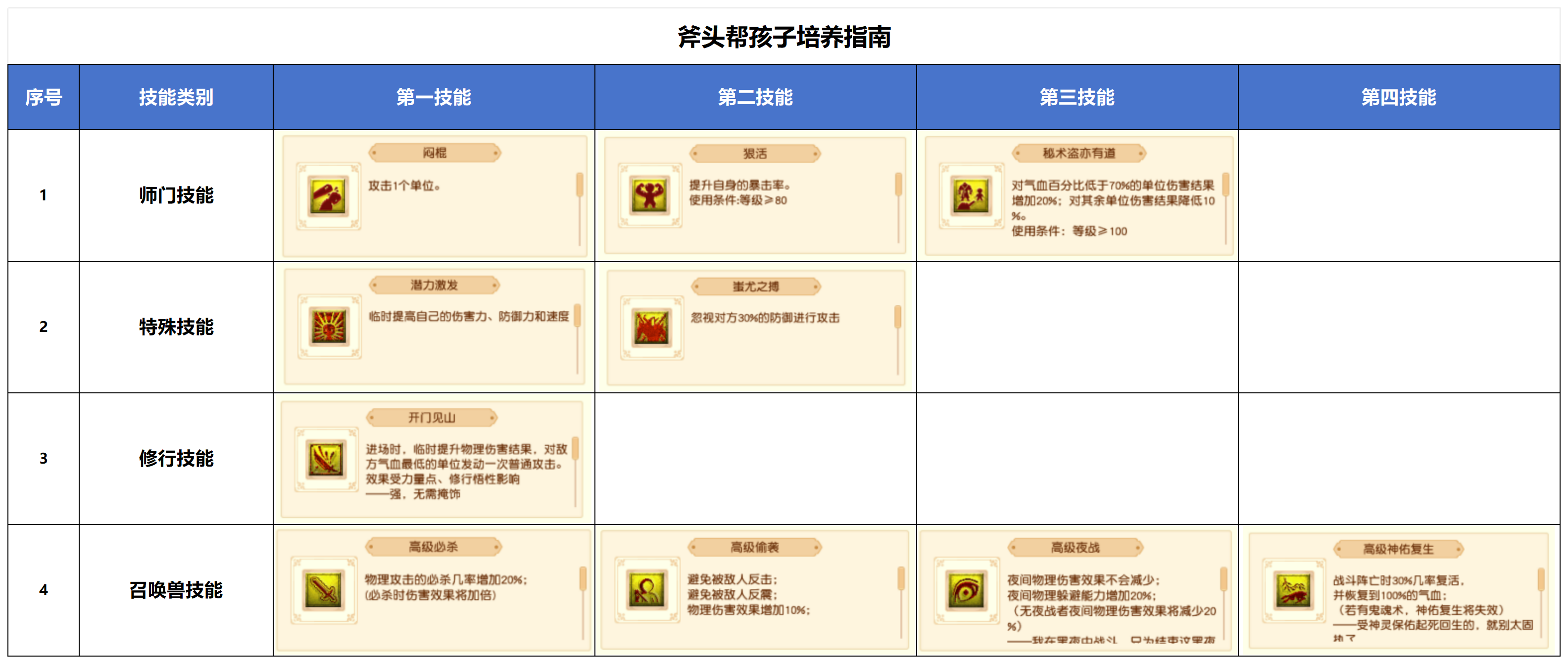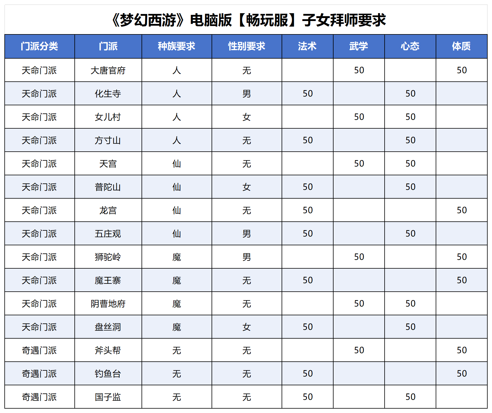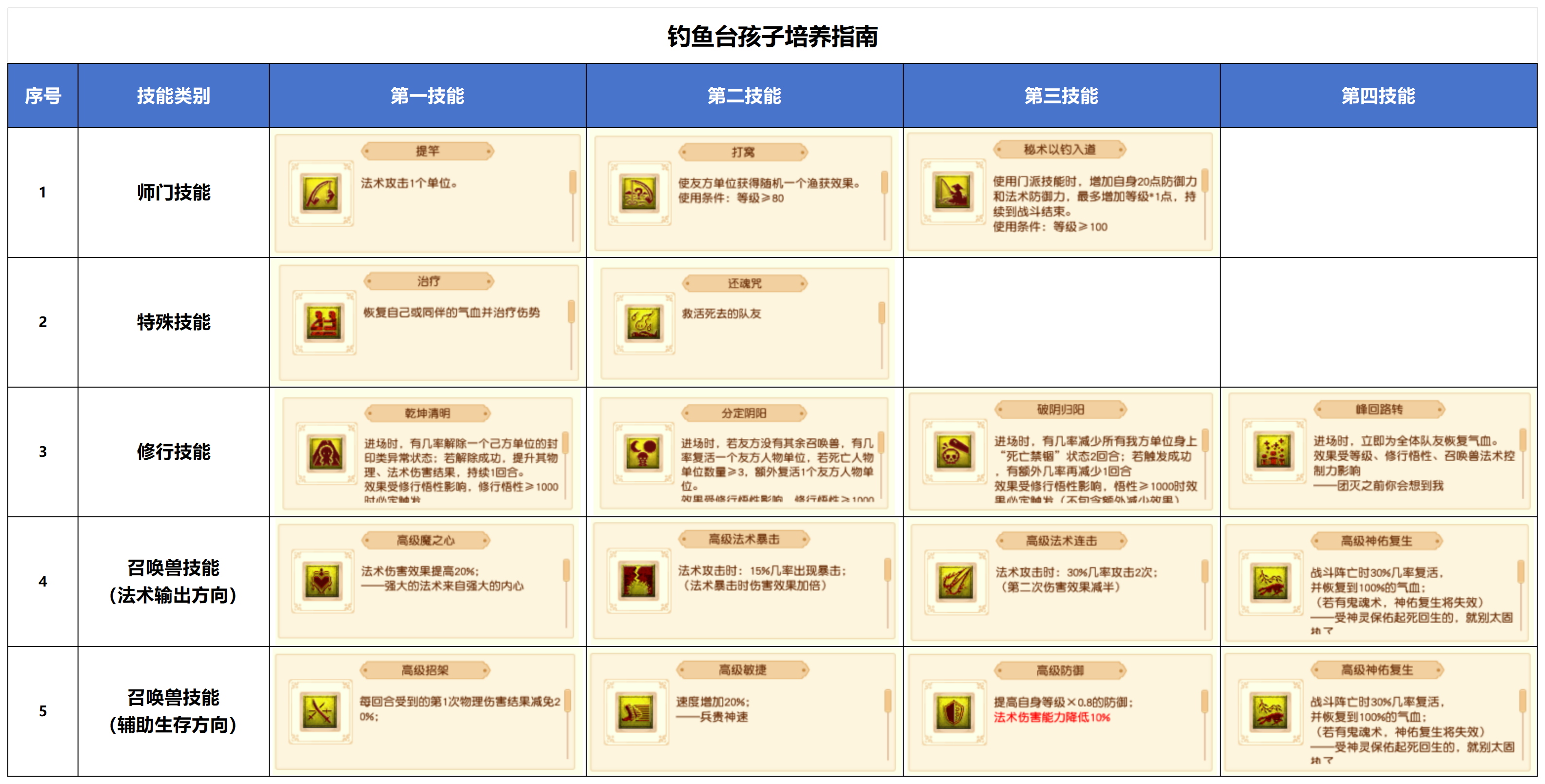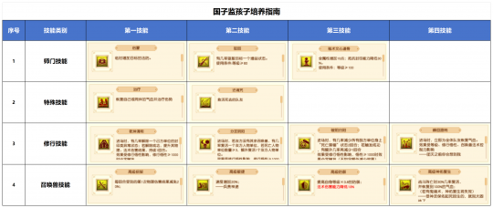随着《梦幻家园》资料片正式登陆《梦幻西游》电脑版【畅玩服】,各位少侠终于有机会在游戏中体验期待已久的子女系统。那么,如何高效地培养出适合自己的子女呢?下面,就带大家了解一下吧! 一、开启条件及获得方式 开启子女系统的条件有两个,一是服务器开服天数≥90天,二是角色等级≥65级。从时间上来看,【畅玩服】2025年开服的大区均已满足开服天数≥90天的条件,但2026年开服的大区则需要再耐心等待一段时间。 满足条件的少侠,可通过“生育”或“领养”的方式获得子女。夫妻玩家(好感度≥1000,等级≥65)可通过给予管家“千年人参”的方式获得子女(需消耗200点体力,怀孕概率为30%),单身或同袍玩家则需要购买“孤儿名册”来获得子女。不过,由于“孤儿名册”价格通常超过“千年人参”,结为夫妻的少侠会更有优势。 如果想获得特定种族的子女,可前往马婆婆处购买“祈福玉露”。需要注意的是,“祈福玉露”只能在待产阶段使用,使用后只能提升对应种族的概率,当父母种族相同时,无法祈福与父母相同的种族。 二、定向培养指南 子女培养可简单地分为待产期(5天,等待子女出生,等待期间可以通过散步、听曲或食用补品等方式加速2天)、幼年期(14天,可进行基础培养)和成年期(可培养子女的等级、属性、技能和资质)等三个阶段,不同阶段的培养重点也各有不同。 幼年期时,子女拥有武学、法术、心态、体质四种悟性,各项悟性初始为0,最大为100。各位少侠可以通过给予玩具(每天最多3次)、教导(消耗活力提升一项悟性,每日8次)、喂养(提升临时体质悟性)等方式,提升子女临时悟性和永久悟性。 每过24小时,子女的所有悟性就会根据条件发生变化,若临时悟性>永久悟性,则永久悟性+2,临时悟性下降为前一天的50%。不过,体质悟性比较特殊,需满足临时体质悟性>80,才能实现永久+2。 由于子女出生8天后可进行拜师,所以幼年期的培养需围绕“拜师”这一关键节点提前规划。比如,你想培养一个钓鱼台的子女,就需要在第八天前满足“法术≥50,体质≥50”的拜师条件。拜师后,可完成14个子女师门任务,完成后可提升子女两个悟性值(可突破100点悟性上限)。 子女出生8天后可以学习潜力激发、治疗、还魂咒、蚩尤武诀等特殊技能,学习时会消耗对应道具,建议大家提前准备。另外,子女拜师、师门任务、特技学习一定要在成年前完成! 子女成年后,等级上限会变为玩家等级+10,并获得1个师门技能,等级≥80的子女可学习2个师门技能,等级≥100的子女可学习3个师门技能。不过,学习第二、第三技能时,需要前往对应门派师傅处完成任务。 成年后的子女可在马婆婆处领取修行任务(最多100环),高级任务可获得120点修行悟性,中级可获得100点修行悟性,低级可获得80点修行悟性。 完成全部潜力修行任务后,子女会根据修行悟性,获得更多的属性点和1个随机修行技能,还将解锁全新造型。各位少侠还可以根据自身需要,继续领取奇遇修行提升属性,完成全部奇遇修行任务后,可获得50点属性,并根据门派提升两项资质100点。 各位少侠还可通过打书界面,替换1个子女已经拥有的召唤兽技能,并有概率额外获得一个召唤兽技能(上限4个)。在极限情况下,子女可以拥有“3个师门技能、1个特殊技能、1个修行技能、4个召唤兽技能”! 三、奇遇门派子女定位及培养指南 由于奇遇门派子女的师门技能具有独特的机制和效果,各位少侠需要结合其门派特性进行针对性培养。 比如,斧头帮子女的师门技能偏向“物理输出”,且第三技能会对气血百分比低于70%的单位伤害结果提升20%。因此,在培养方向上,大家需要以武学、体质为主;幼年期满足拜师条件后,推荐学习“潜力激发”或“蚩尤之搏”;修行技能推荐学习“开门见山”;召唤兽技能方面推荐学习“高级必杀、高级偷袭、高级夜战、高级神佑复生/高级鬼魂术/高级吸血”。 比如,钓鱼台子女的第一师门技能虽然偏向“法术输出”,但第二技能【打窝】(小鱼可恢复气血,河蛙可给予护盾,锦鲤可提升20%物理、法术伤害,螃蟹会降低气血值)、【秘术以钓入道】(使用技能时,增加自身防御、法防)更偏向于辅助技能。因此,在培养方向上,各位少侠既可以把它当成“单体法术”输出(以法术、体质为主),也能把它当作“抽卡辅助”(以心态、体质为主)来玩。 再比如,国子监子女的师门技能主要以增加法防、驱散状态为主,其定位偏向“战斗辅助”。因此,在培养方向上,大家除了满足拜师条件外,培养方向上要以心态、体质为主。不过,要想发挥出【启蒙】的辅助效果和【驳回】的作用,速度属性就要以中高速为主。召唤兽技能方面,比较推荐“高级招架、高级防御、高级神佑复生”等生存类技能和“高级敏捷、高级幸运”等辅助类技能。 总的来说,不同门派的子女可以凭借其独特的技能机制,在团队中担任输出、辅助、控制等角色。各位少侠在培养前,可结合自身门派特点、战斗需求进行规划,挑选合适的子女门派与养成方向,使其成为你闯荡三界的得力助手。 叶子猪梦幻西游玩家群:1群 325703083 (2000人),2群: 330102322 (千人);3群: 424986787 (游戏疑难解答);4群: 330518295 (商人物价);5群: 1063086037 (疑难解答);6群: 1045753197 (春心萌动);7群: 787195090 (活跃互动);8群: 720665628 (全民PK) [编辑:莫听雨]