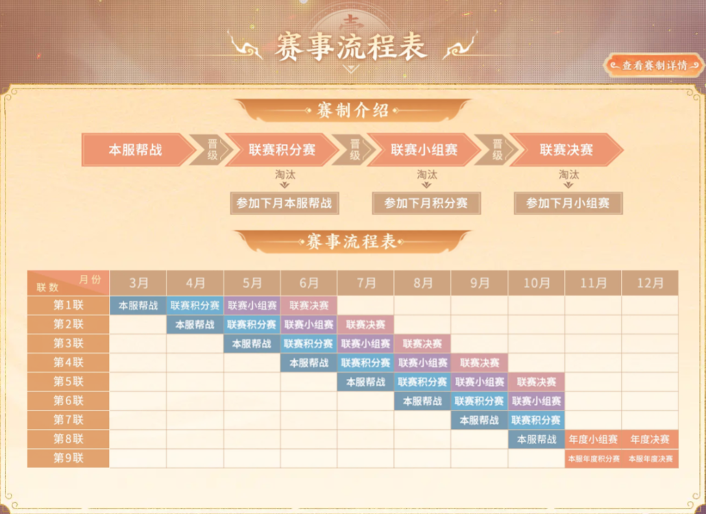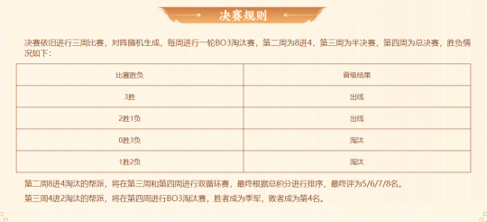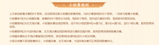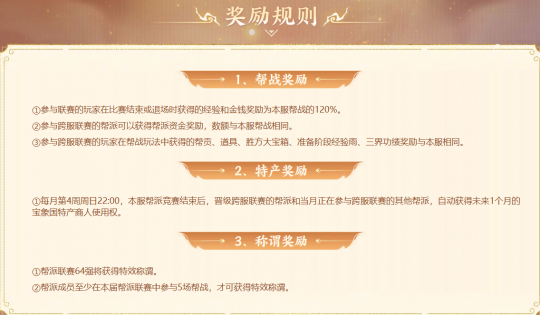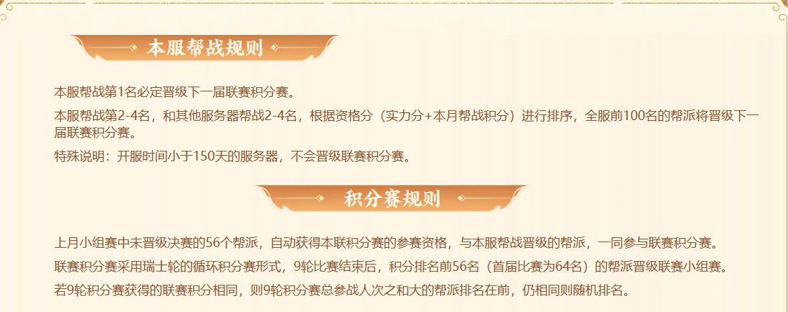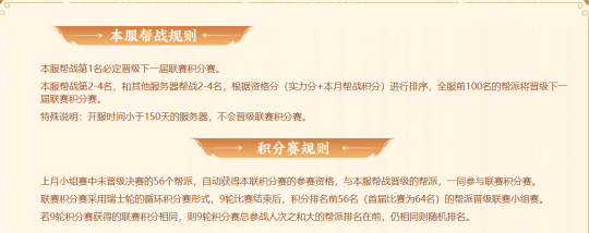 万众期待的畅玩服首届帮派联赛即将开打,各个区的顶级帮派早已经征招了大量高手,迎接这场大型团体比赛。相比其他比赛,帮派联赛有自己的特殊之处,需要整个帮派的人员默契配合,赢得【建设】、【竞技】和【夺旗】中的两场才获胜,玩起来十分热血。 一、帮派联赛介绍 帮派联赛由【本服帮战】、【联赛积分赛】、【联赛小组赛】和【联赛决赛】四个阶段组成。联赛每个阶段均历时一个月,在上个阶段晋级的帮派将自动进入下个阶段,被淘汰的帮派将根据被淘汰的阶段决定下次联赛征程的起点。 本服帮战会在每年1~10月举办十次,即每年将会有十个联赛周期。每年的11~12月,帮派联赛将举办年度联赛,未参与年度联赛的帮派将参与本服帮派年度赛事。 报名规则十分简单,仅本服帮战需要报名,时间为第二周周一至周五。上届帮派联赛积分赛未晋级的帮派,自动报名本届本服帮战。 本服帮战第1名必定晋级下一届联赛积分赛,第2-4名和其他服务器帮战2-4名,根据资格分(实力分+本月帮战积分)进行排序,全服前100名的帮派将晋级下一届联赛积分赛。 联赛积分赛采用瑞士轮的循环积分赛形式,9轮比赛结束后,积分排名前56名(首届比赛为64名)的帮派晋级联赛小组赛。 若9轮积分赛获得的联赛积分相同,则9轮积分赛总参战人次之和大的帮派排名在前,仍相同则随机排名。 小组赛前7轮为小组循环赛,参赛的64个帮派分为8组,每组8个帮派,组内进行循环对阵,每组前4名帮派出线。小组赛第8轮为交叉淘汰赛,第9轮为16进8淘汰赛。 小组循环赛和交叉淘汰赛被淘汰的帮派,将在第8轮和第9轮进行小组交流赛。 决赛依旧进行三周比赛,对阵随机生成,每周进行一轮BO3淘汰赛,第二周为8进4,第三周为半决赛,第四周为总决赛。 第二周8进4淘汰的帮派,将在第三周和第四周进行双循环赛,最终根据总积分进行排序,最终评为5/6/7/8名。 第三周4进2淘汰的帮派,将在第四周进行BO3淘汰赛,胜者成为季军,败者成为第4名。 帮派联赛为常规消耗,在比赛服只能本服进行流通操作,场地内可以切经脉和加点。 帮派联赛有帮战奖励、宝象国特产奖励和称谓奖励。 各位少侠只需要略微了解规则,平时听从帮主安排即可。 二、帮派联赛玩法 帮派联赛初始每名队员有1000点行动力,使用道具百岁香可以增加250行动力。战斗失败的一方扣除250点行动力,行动力为0则被淘汰离场。 从规则来看,帮派联赛需要各个成员都很强,不然一旦被三攻队迅速清场,人数快速减少,即使主队再厉害也没用。 帮派联赛周五是【建设】玩法,双方抢夺伐木工,让他们为帮派完成建设度,最先完成一方为胜。 这个玩法主要围绕7个伐木点进行,双方除了抢夺伐木工外,还要清理对方队伍,保住伐木点不被对方占据。 这里面有很多技巧,譬如散队拖对面队伍,变乌龟卡躲在暗处防被点等等,操作性非常高。 周六的【竞技】玩法是纯粹的对轰,技巧没有太多,尽可能将对方清出场。若是双方实力差距不大,那么就拼人数,在清理对方成员的时候,需要保护后自己这边没有太多行动力的成员,免得他们被清出去。 周日的【夺旗】玩法非常讲究战略,目的夺旗2次。这里面的技巧非常多,一些强队若是不注意也可能翻车,类似的故事不少。 有时候夺旗不一定是主队,小队也可以,其他队伍能拖住对方队伍,保住夺旗小队回去即可。同样,对面主队要是夺旗了,打不过对面可以各种拖,让对面回不去就可以。 帮派联赛的玩法不是纯粹的比硬件和指挥实力,更多是比拼帮派成员的默契和决心。 三、荣誉奖励 帮派联赛有【荣誉称谓】、【称谓图标】、【冠军奖杯】、【聚义亭】和【明星帮派】等荣誉奖励。这次是畅玩服第一届帮派联赛,关注的人非常多,而且会在【聚义亭】记录,意义非凡。 对于大多数少侠来说,霸气的称谓奖励最为实用,走在路上都拉风。 四、帮派备战情况 帮派联赛的消息出来后就有多帮派开始筹备,一些区合并几个帮派的主力一起征战,给高额补贴找队伍过来,或者是给高额奖励让大家提升召唤兽修炼等等。 建邺城的【627余生不变】是N哥和阳仔组建的帮派。早前新春巅峰赛,阳仔的Fighting战队就拿下了冠军,实力保证。 风少知道帮派联赛的消息后,就拉来宝儿姐等一起征战,再加上区里的强力三攻队,实力空前强大。再有,风少给的奖励非常高,譬如进入联赛前三,抽手机,发额外补贴,战功第一奖励99个神兜兜等等。 除此之外,建邺城的【兴福街的】和【猎人】帮派,实力也非常强。 齐天大圣服务器的【璀璨年华i】帮派更是集合了旭旭宝宝、战神爆爆、唐宋和叶子等知名玩家,号召力高,还有高额补贴,战力十分强悍。除此之外,齐天大圣的【饼牌制造】、【蜀山】和【德山传媒】帮派也十分强大。 此最相思服务器的帮派也十分厉害,譬如【怀旧梦幻西游】、【冥帮】。 其他区的帮派也在积极备战中,第一届帮派联赛冠军花落水手还要看战况,毕竟这不单单看硬件实力,还要拼战术,估计到时候会有不少“黑马”帮派出现,大家可以多留意。 总结: 帮派联赛是全体帮派成员一起讨论和实践的大型团队比赛,大家一起为了荣誉而战,打起来非常热血。各位少侠,若是喜欢热闹,喜欢PK,可以加入区内的联赛帮派,一起征战! 叶子猪梦幻西游玩家群:1群 325703083 (2000人),2群: 330102322 (千人);3群: 424986787 (游戏疑难解答);4群: 330518295 (商人物价);5群: 1063086037