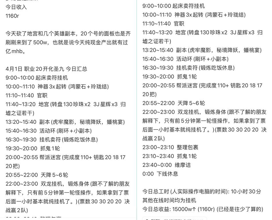 本期亮点: 一个道具两个名,现梦幻时期的绝版道具,有的别卖了; 20 开搬砖实录!10 小时狂赚 1.5 亿,日入 1160R 的完整日程表; 金屋玉宅到底值不值?算完这笔账,我直接造了 3 套! 2×2 拼图速通技巧!梦幻西游拼图小游戏,10 秒通关拿满奖励。 20 开搬砖实录!10 小时狂赚 1.5 亿,日入 1160R 的完整日程表 你永远想象不到梦幻西游的那些搬砖党靠这款游戏能够做到赚多少钱? 这是一位20开的梦幻西游的玩家公布出来的自己的角色每天所做的事情的日程表。从早上9点开始上线,一直忙碌到凌晨才下线。每天在线时间在10个小时以上。差不多能够获得1000以上的收益。 如果梦幻中的任务是每天刷新一次的,靠这样的方式能够做到月入3万了。 梦幻中很多任务玩法就是按周刷新的,没办法一直维持这么高的收益,但是也能够维持到三四百左右。 在梦幻西游中赚钱也是可以的,只是有点辛苦罢了。 2×2 拼图速通技巧!梦幻西游拼图小游戏,10 秒通关拿满奖励 口袋版上有很多的任务是通过上面的这种拼图来完成的,但有的时候大家会碰到显示bug---显示出来的拼图是没有选项的,全部都是空白。 碰到这种显示bug时的明智选项是取消任务,但也有一部玩家选择接受bug的挑战。 该拼图中有一种任务完成模式。如果大家也碰到了这种不显示图案的情况可以按照下面的这种方式进行尝试,或许可以成功。 先一个对角再接一个左右。不行就再一个上下接一个左右 一个道具两个名,现梦幻时期的绝版道具,有的别卖了 不看维护公告的玩家看到这两本书的时候是会有种迷茫的,枪的制造指南书怎么还有两种名称? 这是梦幻文字更新后的结果,同类型的指南书的名称进行了统一,-枪、枪矛 → 统一为 枪。 以后大家看到的只是枪的制造指南书,枪矛名称的制造指南书将成为绝版。 在藏宝阁上架枪矛书的不要再下架,在仓库存枪矛书的不要再取出,这些留着都是绝版道具。 金屋玉宅到底值不值?算完这笔账,我直接造了 3 套! 金屋玉宅的房子到底值不值得做?看完了上面的这个表格就能看明白。 哪怕只按 100 两 / 体的基础卖体,7-8 个月就能回本;如果用体力做高收益玩法,3 个月内就能回本,之后全是纯赚 。 基础卖体 1 年左右回本,高收益玩法 5-6 个月回本,适合不想折腾造房的玩家 结论:做好长时间玩梦幻的玩家要尽早做金屋玉宅,做的时间越长赚的越多。 叶子猪梦幻西游玩家群:1群 325703083 (2000人),2群: 330102322 (千人);3群: 424986787 (游戏疑难解答);4群: 330518295 (商人物价);5群: 1063086037 (疑难解答);6群: 1045753197 (春心萌动);7群: 787195090 (活跃互动);8群: 720665628 (全民PK) [编辑:莫听雨]