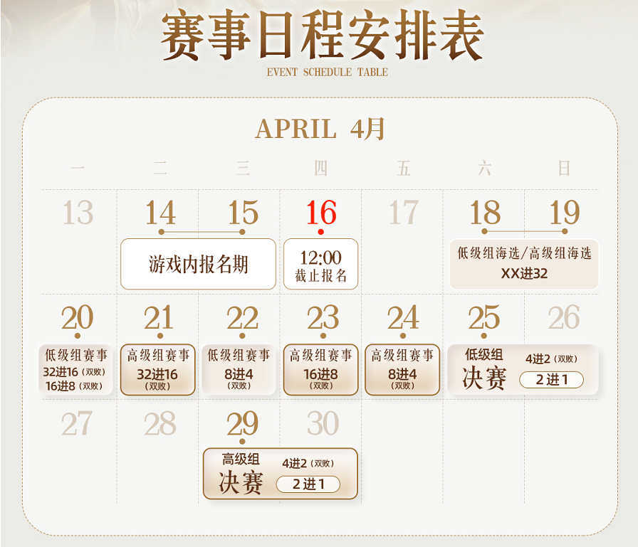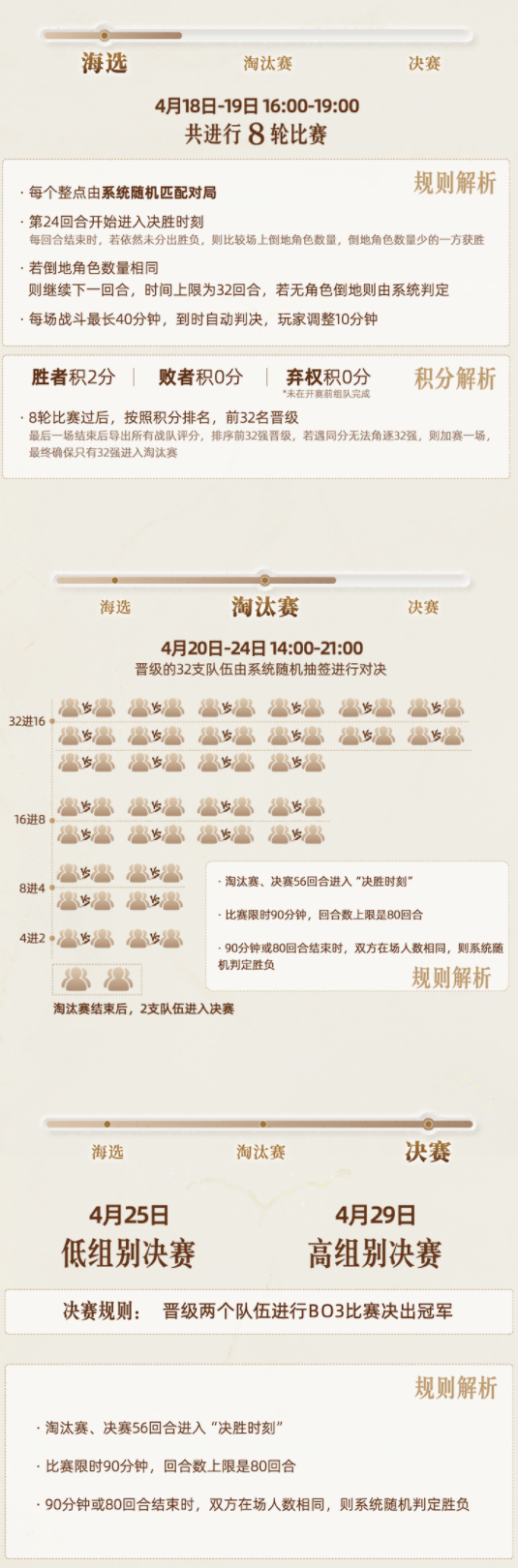 “大马猴杯”娱乐邀请赛来袭,在 2026 年 4 月 14?日开启报名,畅玩服全服符合参赛资格的玩家可五人组队,前往本服长安城(180, 238) NPC娱乐邀请赛使者处报名参赛。 下面,给大家介绍一下“大马猴杯”的奖励和规则。 参赛条件 本次赛事分为两个组别,各位少侠根据自己角色等级选择报名,分别为低组别39级和高组别109 级。 注意:39 级报名的账号需要在游戏-系统-更多功能-礼包中心输入过旭旭宝宝专属福利码?9999-9999-9999-9999,如不符合要求需创建符合要求的新账号。 比赛奖励 本次赛事总奖池高达150 万元,奖励十分丰厚! 高组别:冠军 70 万元,亚军 30 万元 低组别:冠军 35 万元,亚军 15 万元 (注:上述奖金金额为税前金额,需要按届时法律法规要求完成税费代扣代缴手续后进行发放,由旭旭宝宝传媒提供、执行与负责) 赛程安排 “大马猴杯”在2026年4月14日中午12:00开启报名,海选赛将于4月18日-19日进行。 比赛规则 一、所有比赛为跨服比赛,各位少侠可将角色传档至比赛服。传档成功后,少侠可通过娱乐赛使者传送至比赛场景或直接登录比赛服。比赛服和原服的角色可同时登录,比赛服的角色无需回传,且比赛当天,正常参赛的角色,19:30-23:00期间登录原服务器将无需排队。 低组别特殊比赛规则 1.比赛中,无法携带“无级别限制”装备,最高仅允许“简易”装备 2.参赛五个角色中同门派最多2人 3.每场战斗最多召唤4只召唤兽,技能不限(包含开场携带) 4.不允许携带任何神兽,本队神兽出场视为违规,直接判负 5·低组别药品会按照等级进行一定效果衰减 高组别规则参照常规“群雄逐鹿”赛事规则执行 二、比赛期间系统将提供比赛物资包含:临时符、变身卡、三药(120品) 三、每场比赛前,参赛战队需在休息室内做好战斗准备 1.队伍人数≥5人的队伍才能切入战斗 2.不满足切入战斗条件的队伍将视为本场比赛弃权 四、进入32强后,109级别比赛限时90分钟,回合数上限是80回合。90分钟内或80回合内,如果一方全部倒地,则另一方获胜;90分钟内或80回合内结束时,双方均有单位在场,则在场人数多的一方获胜(不包括召唤兽);90分钟或80回合结束时,双方在场人数相同则系统随机判定胜负。 五、比赛中增加“决胜时刻”,规则如下: 1.淘汰赛、决赛玩家对战至第56回合,战斗将进入“决胜时刻”;海选赛玩家对战24回合进入决胜时刻 2.“决胜时刻”持续时间自第56回合起(海选赛为24回合),持续至第80回合或战斗结束(海选赛为32回合) 3. “决胜时刻”期间,系统将于每回合结束时统计对战双方角色死亡人数,若死亡人数相同则继续战斗,否则战斗结束,死亡人数少的一方获胜 六、本次「大马猴杯」娱乐邀请赛仅允许年满18周岁的用户报名参与,未成年人不允许参赛,否则成绩无效、损失及责任自行承担。 七、本次「大马猴杯」娱乐邀请赛由东营市旭旭宝宝文化传媒有限公司(简称“旭旭宝宝传媒”)主办,相关赛事流程、赛事规则、奖金规则等由旭旭宝宝传媒负责制定,赛事运营、公平公正保障、如有奖金发放及税费缴纳相关工作由旭旭宝宝传媒负责;《梦幻西游》电脑版官方仅提供游戏环境支持。 叶子猪梦幻西游玩家群:1群 325703083 (2000人),2群: 330102322 (千人);3群: 424986787 (游戏疑难解答);4群: 330518295 (商人物价);5群: 1063086037 (疑难解答);6群: 1045753197 (春心萌动);7群: 787195090 (活跃互动);8群: 720665628 (全民PK) [编辑:莫听雨]