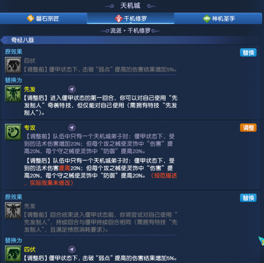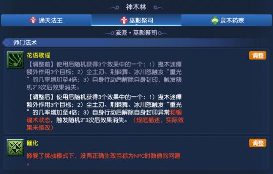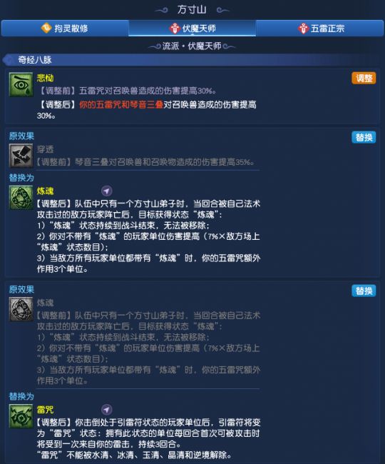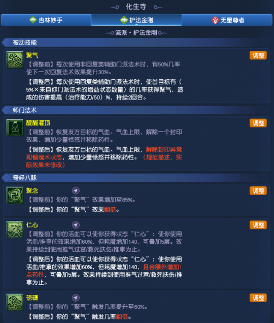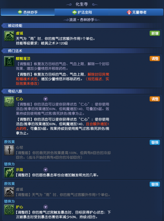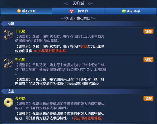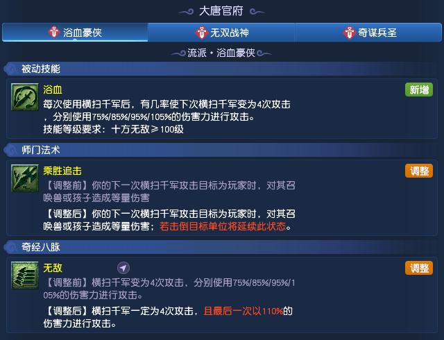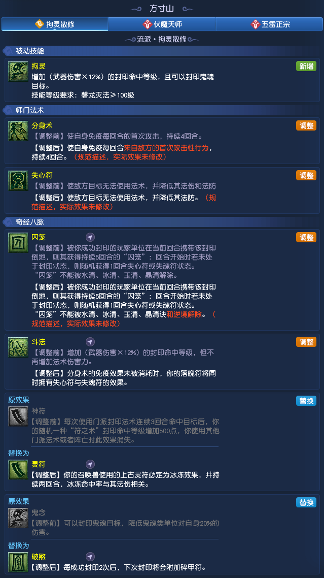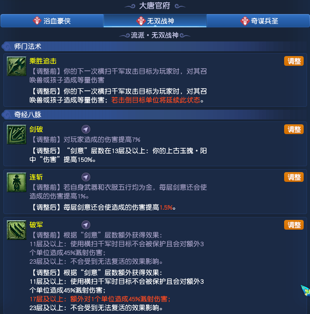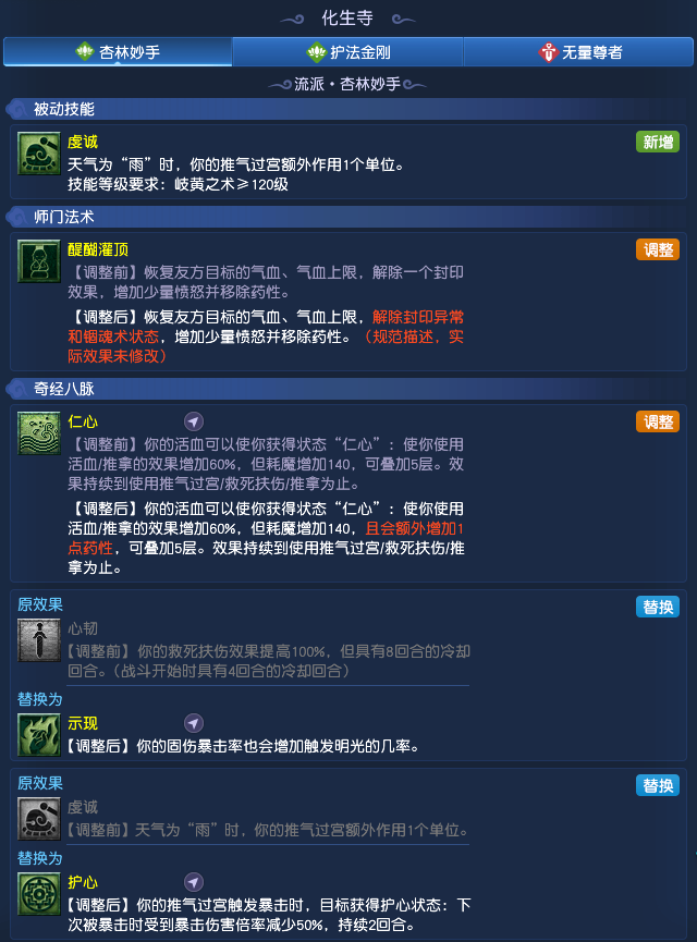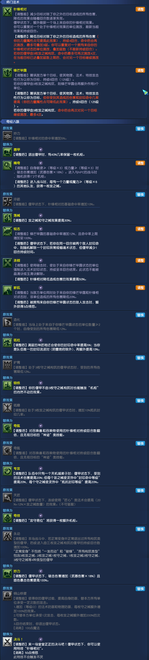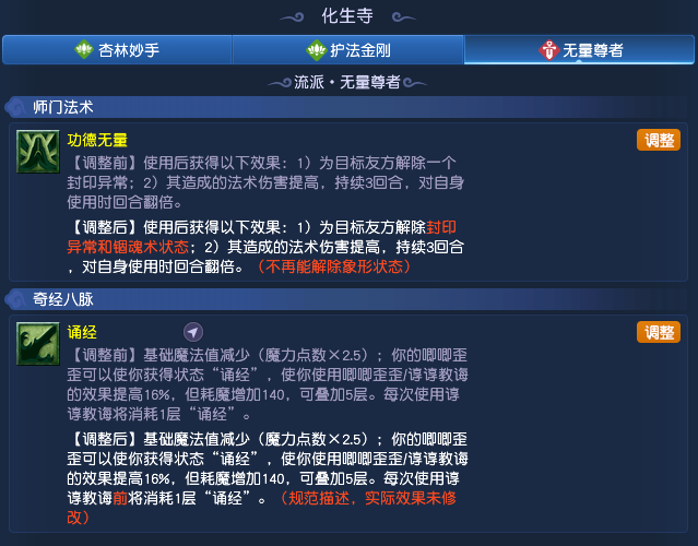 目前,关于梦幻西游电脑版2026四月门派大改的最新内容已经在测试服放出,人族六个门派均有调整。其中,大唐官府、方寸山、天机城等门派获得了一定程度上的加强,神木、女儿、化生等门派则有一定的数值调整。下面,就带大家一起看看吧! 一、大唐官府新增第四流派【奇谋兵圣】 本次调整中,大唐官府调整了【浴血豪侠】、【无双战神】流派部分技能、师门法术和奇经八脉效果,并新增了【奇谋兵圣】流派。 【浴血豪侠】流派新增了门派被动技能“浴血”,效果为:“当师门技能十方无敌≥100级时,每次使用横扫千军后,有几率使下次横扫千军变为4次攻击分别使用75%/85%/95%/105%的伤害力进行攻击。”这就意味着,神威组、天科组的大唐官府玩家,将有机会享受到“四扫”的快乐。 师门法术【乘胜追击】在保留原效果的基础上,新增了“若击倒目标单位将延续此状态”条件,实战效果方面有所增强。 奇经八脉【无敌】则改为横扫千军一定为4次攻击,且最后一次以110%的伤害力进行攻击。这就意味着,大唐官府的点杀能力,要比之前强了不止一个档次,有望王者归来! 【无双战神】流派不仅延续了师门法术【乘胜追击】的调整,还大幅提升了“剑意”层数的收益。“连斩”调整之后,每层剑意可以增加1.5%伤害;“剑破”调整之后,当剑意≥13层,上古玉魄·阳中的“伤害”效果将提升150%;“破军”调整之后,剑意11层时可溅射3个单位,17层时可溅射4个单位! 【奇谋兵圣】是本次大唐官府新增的流派,该流派不仅保留了大唐官府的基础输出能力,还特别新增“奇谋”机制。 简单来说,就是该流派的大唐官府可以通过“奇谋”为召唤兽增加特殊状态,有的技能可以让队友召唤一只带有“瞬击”特性召唤兽,有的技能可以让自身召唤兽学习“横扫千军”。需要注意的是,“奇谋”法术只能在大唐官府弟子处于“休息状态”或触发“奇袭法术”时使用,存在一定的限制条件。 二、下雨天可推7,仁心将增加“药性”效果 本次调整中,化生寺调整了【杏林妙手】、【护法金刚】、【无量尊者】流派的部分技能、师门法术和奇经八脉效果。 【杏林妙手】流派新增被动技能“虔诚”,技能效果为“天气为雨时,推气过宫可额外作用1个单位”;化圣技能“醍醐灌顶”可解除封印和锢魂术状态(规范描述,之前也可以)。奇经八脉方面,“仁心”会为目标增加1点药性状态,属于效果没变,但降低药品恢复的操作;“示现”经脉可根据“固伤暴击率”增加触发“明光”的几率;新增的【护心】经脉可以在推血触发暴击时,降低受到的暴击伤害倍率(持续2回合)。 【护法金刚】流派主要调整了被动技能“聚气”的效果,调整后有几率(5%×来自你门派法术的增益状态数量)让首目标有聚气效果,提升其造成的伤害(治疗能力/50)%,持续2回合。奇经八脉方面,提升了“聚念”和“磅礴”效果,其他的改动和【杏林妙手】一致。 【无量尊者】流派调整了师门法术“功德无量”的效果,调整之后可解除友方的封印异常和锢魂术状态,但对象形状态无效;奇经八脉方面只是优化了一下文本,实际效果和之前一致。 三、力女儿轻拍法术可叠满天 本次调整中,女儿村调整了【绝代妖娆】和【妙舞佳人】流派的部分技能、师门法术和奇经八脉效果。 【绝代妖娆】流派只更新了“机巧”经脉的生效条件,基本没有太大的影响。 【妙舞佳人】流派新增了被动技能“妙舞缤纷”,该技能效果为“使用师门法术中的轻拍舞步,会获得1层满天花雨状态”,并删除了满天花雨技能。除此之外,还调整了部分师门技能和奇经八脉的效果,令其输出能力有了较为明显的提升。 四、封印经脉变为门派被动,方寸山有福了 本次调整中,方寸山调整了【拘灵散修】、【伏魔天使】和【五雷正宗】流派的部分技能、师门法术和奇经八脉效果。 【拘灵散修】流派新增被动技能“拘灵”,该技能可根据武器伤害增加封印命中率,且可封印鬼魂目标;师门技能方面,调整了“分身术”和“失心符”的描述;奇经八脉方面,优化了“囚笼”的描述,并提升了一定的封印能力。 【伏魔天师】流派调整奇经八脉的伤害效果。其中“悲恸”可对琴音三叠生效,但伤害降低了5%;“炼魂”经脉主要是换了个位置,现在可对89级开2丹的玩家生效;“雷咒”经脉可同“引雷符”联动,提升了控尸能力。 【五雷正宗】流派则是提升了下琴音三叠的伤害,影响不大。 五、师门技能系数调整,奶神木以后真的要堆治疗了 本次调整中,神木林调整了【通天法王】、【巫影祭司】和【灵木药宗】流派的部分技能、师门法术和奇经八脉效果。 【通天法王】、【巫影祭司】流派调整了师门技能“花语歌谣”的效果描述,整体影响不大。 【灵木药宗】流派则是大幅度调整了师门技能的系数,令其和治疗能力挂钩。 六、力天机城“先发”技能下放,辅助、封天机得到全面调整 本次调整中,天机城调整了【磐石宗匠】、【千机修罗】和【神机圣手】流派的部分技能、师门法术和奇经八脉效果。 【磐石宗匠】调整了神器技能和法宝的效果,调整之后可极大地提升自身的封印命中率和抗封能力。 师门法术方面,调整了被动技能“机枢”的效果,调整后攻之械可增加封印命中等级和命中率上线,守之械可以降低被暴击时受到的伤害;“针锋相对”和“锋芒毕露”将与人物力量属性点有关。 
