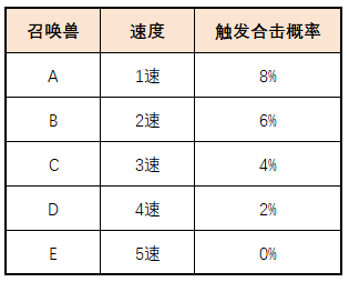 《梦幻西游》电脑版 2026 年 4 月门派调整已在测试服全面上线。本次调整对合击规则进行了重磅优化,重塑其战斗机制,使其适配当前战斗环境,为召唤兽带来实打实的战斗增益,以下就为大家带来全新合击规则的详细解读与测试数据。 温馨提示:本文数据均来自测试服实测,为小编个人测试观点,最终内容以全服上线为准。 1、只有召唤兽与召唤兽单位之间可以触发合击,人物、孩子召唤物、npc均无法触发合击。 2、召唤兽攻击时,先前已攻击过相同敌方目标的其他召唤兽有几率响应其行动,触发合击,额外攻击一次,自动战斗时不会触发合击。 3、手动控制召唤兽对指定目标使用普攻 / 单体法术(力劈华山、壁垒击破、超级壁垒击破、善恶有报、死亡召唤、惊心一剑、雷击、落岩、水攻、烈火、上古灵符和其他特殊法术)才可触发合击。 4、每回合每只召唤兽仅可响应合击一次,响应合击时将使用其本回合使用过的相同攻击指令。 5、召唤兽在响应合击时仅造成50%的伤害结果,且不会触发任何为对方附加状态的效果(例如“毒”)。 为便于理解,下文中使用召唤兽ABCDE代指1-5速召唤兽。 1、召唤兽A攻击,无召唤兽可响应合击;召唤兽B攻击,仅召唤兽A可响应合击;召唤兽E无法助力他人,但能被所有高速召唤兽助力。(特别说明:若A已经响应B的合击,则A无法再响应C、D、E的合击) 2、单回合可多次合击,但单只召唤兽仅能响应1次,理论单回合最多触发4次合击。 3、合击响应与速度间隔无关,召唤兽D出手时,召唤兽A、B、C均可能响应。 4、物理宠可响应法宠合击,法宠也可响应物理宠合击。 5、主动攻击召唤兽未触发连击/法连,合击召唤兽仍有概率触发连击/法连。 6、合击攻击顺序:主动宠→合击宠→主动宠→合击宠,循环输出。 7、多技能宠响应合击时,仅使用本回合已用的攻击方式。(如召唤兽同时携带壁垒击破和力劈华山,但本回合使用普通攻击,则触发合击时,该召唤兽将使用普通攻击) 1、触发合击使用普通攻击时,物理技能全部生效(高连、超级连击、理直气壮等均生效,超级神狗合击有概率造成3次伤害)。 2、触发合击使用普通攻击时,无法触发附加技能类召唤兽套装(如善恶有报、死亡召唤套装等)。 3、若召唤兽携带独行/高级独行,即使攻击目标不同,也能响应合击。 1、触发合击使用单体法术(雷击、落岩、水攻、烈火、上古灵符)时,法术技能全部生效(如法术连击、法术暴击、法术波动等)。 2、触发合击使用单体法术(力劈华山、壁垒击破、超级壁垒击破、善恶有报、死亡召唤、惊心一剑)时,物理攻击全部生效(如必杀、偷袭、强力等)。 3、触发合击使用单体法术时,该次攻击不消耗魔法。 4、召唤兽使用技能夜舞倾城无法触发合击。 召唤兽合击的触发概率是所有玩家最关心的重点,小编通过2人组队和5人组队的方式,测试合击的概率。 1、2人组队 小编测试了5组共计500回合,触发合击12次,整体概率为2.4%,基础概率约为2%。 2、5人组队 从5人组队的合击测试中,可以明显发现,速度较快的召唤兽(召唤兽A)触发的合击次数显著高于其他召唤兽;速度最慢的召唤兽(召唤兽E)不会触发合击;5只召唤兽的总合击概率约为20%。 根据2人组队和5人组队的测试可以得出结论: 召唤兽的合击基础概率为2%;5人组队时,各速召唤兽触发合击的概率如下: 3、5人组队时,每回合有至少1只召唤兽触发合击的概率为20%。 4、协力内丹可提升召唤兽响应合击的基础几率。(因为小编未能获得协力内丹,无法给大家提供准确数据) 1、任务利好:大唐、花果山等门派彻底告别合击减伤,日常任务输出更稳定。 2、PK价值:在PK中,全新的合击有更重要的战略意义,不仅能提高召唤兽的输出,更能轻松打破神佑、“163”,大幅提高点杀的成功率。 3、配速技巧:因为1速召唤兽触发合击概率最高,合理调整队伍内召唤兽的速度,能够让核心输出宠更容易触发合击。 4、战术开发:利用合击规则可以开发全新的战术,例如龟速血宠虽然无法造成高额伤害,但却能引起其他召唤兽的合击,完成点杀或守尸的操作。 本次合击改版将改变召唤兽输出体系,不管任务还是PK都有巨大影响,少侠们不妨去测试服抢先体验。 温馨提示:本文数据均来自测试服实测,为小编个人测试观点,最终内容以全服上线为准。 叶子猪梦幻西游玩家群:1群 325703083 (2000人),2群: 330102322 (千人);3群: 424986787 (游戏疑难解答);4群: 330518295 (商人物价);5群: 1063086037 (疑难解答);6群: 1045753197 (春心萌动);7群: 787195090 (活跃互动);8群: 720665628 (全民PK) [编辑:莫听雨]