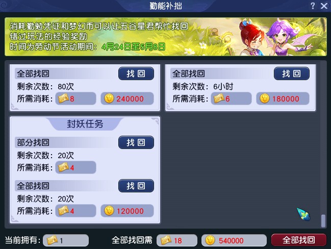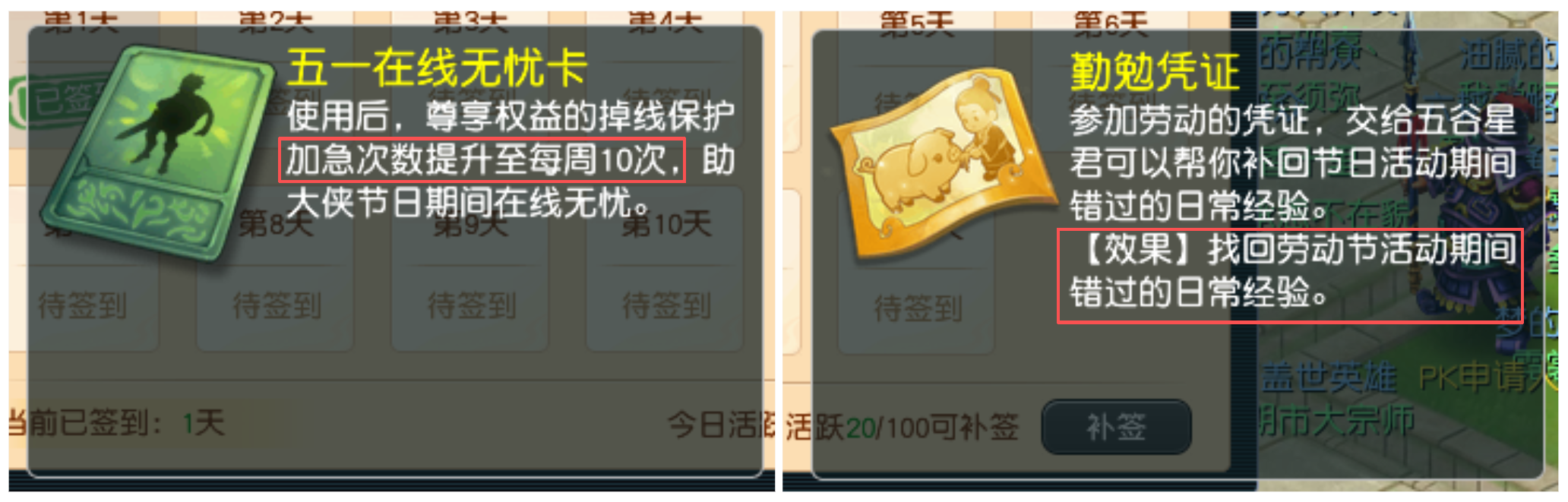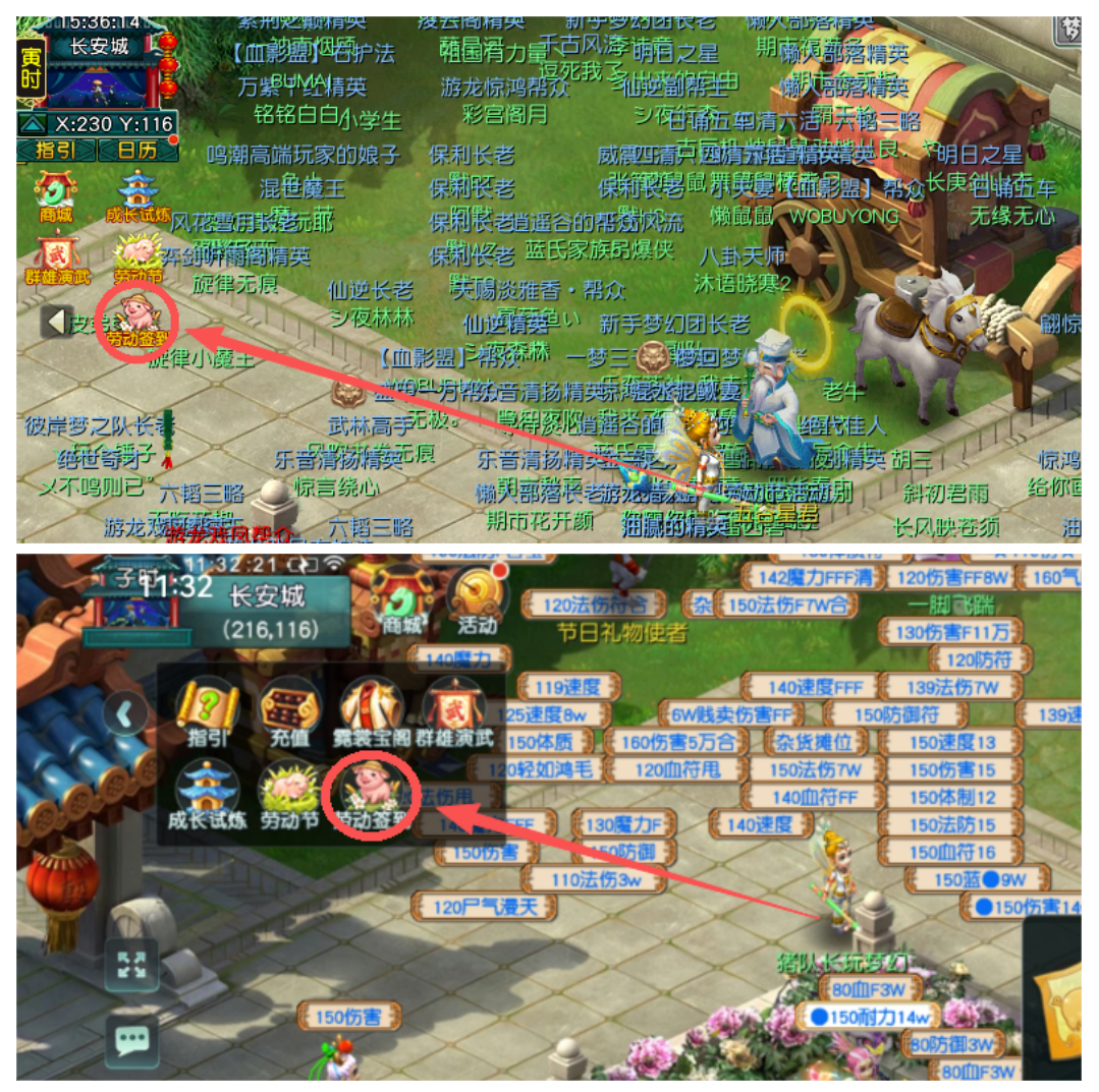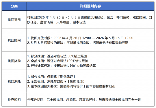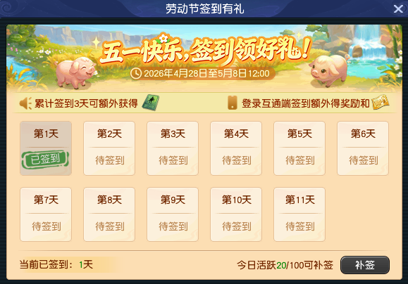 丰豕竞逐勤者彰,匠心硕果英名扬。2026年4月28日维护后,【畅玩服】将开启“劳动节签到有礼”活动。活动期间,各位少侠只需每日签到,便可获得活跃度、经验和储备金奖励,累计签到还可获得“五一在线无忧卡”。除此之外,使用《梦幻西游》互通版登录畅玩服的少侠,还可解锁专属奖励。下面,就带大家了解一下吧! 一、劳动节签到有礼活动 各位少侠登录游戏后,只需点击游戏界面右上角“劳动签到”,便能打开“劳动节签到有礼”界面。 劳动节签到有礼活动时间为2026年4月28日至5月8日12:00。活动期间,完成每日签到可获得20活跃度、经验和储备金奖励。每日活跃度达到100时,可获得1次“补签”机会。 签到时间累计3天,可额外获得1张“五一在线无忧卡”。使用该卡后,尊享权益的掉线保护加急次数将提升至每周10次,助力各位大侠节日期间在线无忧。如果使用《梦幻西游》互通版登录畅玩服参与签到活动,可额外获得一张经验奖励找回道具“勤勉凭证”(不可交易)。 二、互通版参与活动可享专属好礼 五一佳节将至,专属好礼如约而至!劳动节当日,节日礼物使者(长安城207,127)为各位少侠准备了节日礼物。各位少侠既可登录《梦幻西游》电脑版畅玩服,前往指定坐标领取劳动节限定节日福利;也能打开《梦幻西游》互通版,一键登录畅玩服,随时随地轻松领奖。 除此之外,使用《梦幻西游》互通版登录畅玩服领取节日礼物,还可获得额外奖励,且活动期间(2026年4月30日0:00至5月12日23:59),使用《梦幻西游》互通版登录畅玩服累计在线时间达到4/8/12小时,各位少侠还能通过“劳有所得”领取额外奖励。 三、善用“勤能补拙”,找回错失经验 活动期间,各位少侠如果因为临时有事错过了部分任务,可以通过劳动节活动任务、互通版签到获取的“勤勉凭证”,开启“勤能补拙”玩法找回经验。 “勤勉凭证”可以找回对应天数错失的日常任务经验,找回规则、找回时间以及找回奖励如上表所示。需要注意的是,“勤勉凭证”仅在本次劳动节活动期间生效,2026年5月15日12:00后,未使用的凭证将会过期失效,各位少侠记得及时使用,不要错失这份专属福利哦! 叶子猪梦幻西游玩家群:1群 325703083 (2000人),2群: 330102322 (千人);3群: 424986787 (游戏疑难解答);4群: 330518295 (商人物价);5群: 1063086037 (疑难解答);6群: 1045753197 (春心萌动);7群: 787195090 (活跃互动);8群: 720665628 (全民PK) [编辑:莫听雨]