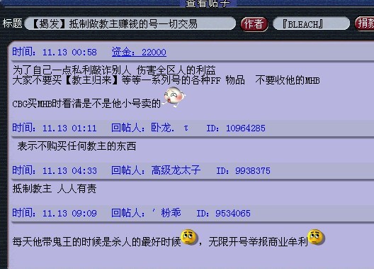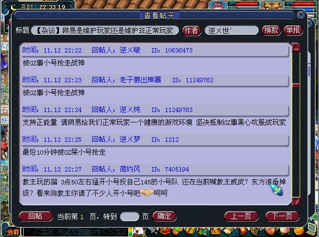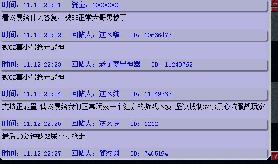 前情提要: 据悉:东方明珠175服战队长喜马拉雅与客服联系后,被告知145服战报名队有可能涉及商业牟利,将被冻结。网易正在进一步处理当中,详情我们将继续关注。 此次事件发生于昨日,东方明珠服战报名最后阶段爆出145队伍靠着工作室的众多小号,得分2倍于175服战队,直接获得服战资格,将于今日请战神。 叶子猪在得知此事后,马上反应并报道了此情况,并随即分别与官方、东方明珠服战队长、东方明珠区内玩家取得联系,为他们取得联系争取一个好结果。 145队被爆是工作室老板掌握,通过东方明珠服战队长提供一些相应图片、聊天证据,与网易客服沟通,希望证实两点:1、工作室老板是否有敲诈意图;2、工作室是否涉及商业牟利。 而后网易也积极展开行动,维护玩家利益。必须要声明的是,网易此次行动是以打击工作室为准,毕竟网易也一直在提倡健康游戏。 此次事件因为涉及关系较多,昨晚鸡翅一直在和官方联系,并和东方明珠服战队喜马拉雅取得联系。 昨晚11点半左右,服战队员联系鸡翅一度以为此事就将陷入死局,战神不保。 而后,今早鸡翅继续跟进事件,取得转机!服战队长喜马拉雅联系鸡翅说——网易客服与他取得联系,145服战号有可能涉及商业牟利,有可能被封号。 事件具体处理结果还未出来,叶子猪将继续独家跟进事件,希望网易能维护玩家利益,打击工作室,服战队长也能提供新证据,双方取得一个双赢结果。 后续情况,鸡翅跟进中,请关注叶子猪。