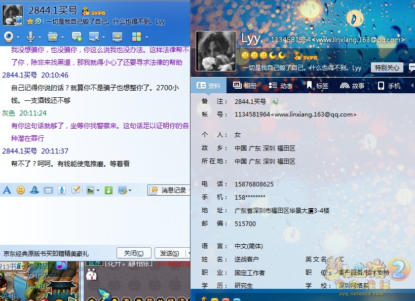相关八卦:开个玩笑被强P?梦幻西游2浣沙溪59大爷VS175大爷 给大家讲讲这个事,求大神帮助! 是这样滴,4月中旬,我卖号,和买家说好CBG 2844.1元,5月9号上架(14天登记期)。 今天上架了,他说,不先给WY手续费,说走线下,然后61元号指定他。 我觉得不安全,一开始没同意。 但是他说,让我把卡号姓名电话给他,他可以先钱,然后再给号,说我不给号他报警。 我想想,好像可以。所以就同意走下线了。2700元。 他是农行,之前听过利用农行短信提醒进行诈骗,所以就又提防起来。 他打好了钱,给我截图,又远程桌面给我看。 好像都很正常,但是 但是,他一直催我给号给号 我理解买号的人心里急 但是银行工作的朋友建议我还是收到款后给他号 不然还是有风险 我就跟他说收到钱给号 结果他就开骂,各种难听,各种刁钻,各种蛮不讲理 还说有钱能使鬼推磨,说花10W元弄死我 我好怕怕,2700元啊。。。 怎么办? |