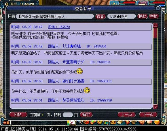 此人极度猥琐,每次被我杀都发个流口水的表情,事情就这么完了吗?木有,他一个垃圾帮的帮主还惹了另外一个129大爷的帮,结果惹得129大爷怒屠了他们帮,下面上点图,这个沫小强的帮叫无源之水,那个129大爷的帮是杨美世家 |
