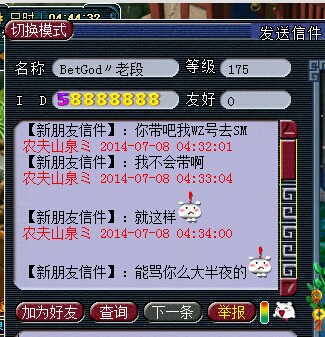 相关文章: 梦幻陆陆续续玩了10年了,从学生党到上班族,下班休息时间娱乐娱乐,平时和区里玩家没有什么摩擦,今天终于踩到狗尾巴了,疯狗无限来袭,都是之前的服战号,不过老段你给我看清楚,服战怎么了,人民币战士怎么了,叔就是不鸟你,邪不胜正,想玩我陪你玩,以下是和段狗斗智斗勇过程,不定时更新,欢迎收藏,另外补充一下,几年前他们这个号和橘子也是耗了一年多,我一直在看,当时特别不理解橘子,现在明白,狗即使装上獠牙,依然是狗,服战了,牛逼了,想杀谁就杀谁,呵呵,我去年买了个表 事情摩擦从昨天晚上半夜1点开始,本人当时师门刷完准备睡觉,看到有人开个天火之殇副本,随手一点加了副本,团长段狗也接收了,于是就等着刷副本,等副本要开了,段狗自己开的5个号发现有个五庄没有加进来,加错人了,我问他怎么办,他想了大概一分钟,说五庄不刷了,带上你,我说好的,两分钟之后他直接转交队长给我,说让我带,他给五庄刷师门,因为我实在很少刷这个副本,就说不会带啊,然后段狗就直接给我踢出队开骂,加进来不带队要你鸟用,滚远一点,老子4个人一样刷。我去你妈了个逼的,我可以不刷这个副本,或者你说你实在忙,我慢慢带队也行,我刚说不会带就直接开骂,你算个几把东西?你妈说她不会玩梦幻西游你还直接脱裤子日她么?畜生一个 |