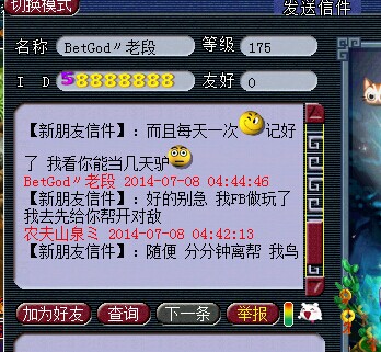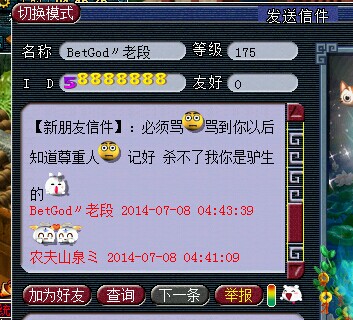 如题,先介绍一下么,很少发帖,梦幻陆陆续续玩了10年了,从学生党到上班族,下班休息时间娱乐娱乐,平时和区里玩家没有什么摩擦,今天终于踩到狗尾巴了,疯狗无限来袭,都是之前的服战号,不过老段你给我看清楚,服战怎么了,人民币战士怎么了,叔就是不鸟你,邪不胜正,想玩我陪你玩。 以下是和段狗斗智斗勇过程,不定时更新,欢迎收藏,另外补充一下,几年前他们这个号和橘子也是耗了一年多,我一直在看,当时特别不理解橘子,现在明白,狗即使装上獠牙,依然是狗,服战了,牛逼了,想杀谁就杀谁,呵呵,我去年买了个表 事情摩擦从昨天晚上半夜1点开始,本人当时师门刷完准备睡觉,看到有人开个天火之殇副本,随手一点加了副本,团长段狗也接收了,于是就等着刷副本,等副本要开了,段狗自己开的5个号发现有个五庄没有加进来,加错人了,我问他怎么办,他想了大概一分钟,说五庄不刷了,带上你,我说好的。 两分钟之后他直接转交队长给我,说让我带,他给五庄刷师门,因为我实在很少刷这个副本,就说不会带啊,然后段狗就直接给我踢出队开骂,加进来不带队要你鸟用,滚远一点,老子4 个人一样刷。我去你妈了个逼的,我可以不刷这个副本,或者你说你实在忙,我慢慢带队也行,我刚说不会带就直接开骂,你算个几把东西?你妈说她不会玩梦幻西游你还直接脱裤子日她么?畜生一个,上图 段狗说你带队吧,我说不会,直接踢了然后当前骂人,当时没有截图他骂的那些话