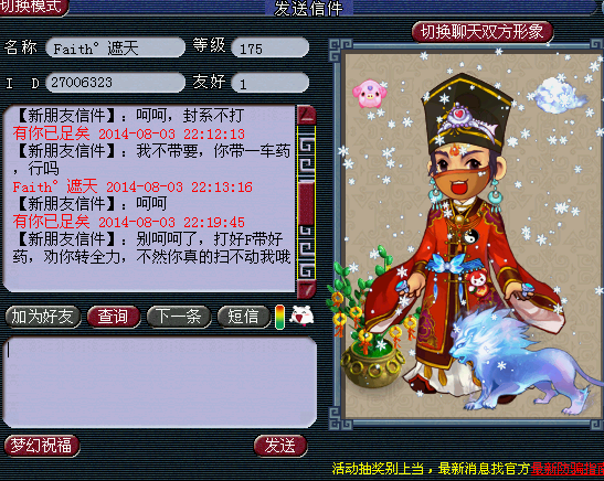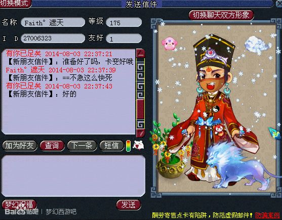 相关八卦:梦幻西游2惊现盗版王思聪:喊我一声老公送你5000W 事情是这样的,129的天宫号没有和大号在一个区,所以做任务的时候就关于秒和轰的问题,这位大爷就要来杀我了....... 抓鬼牛头他说第一下轰,我说秒是一样的,不就咱俩意见不统一嘛。他就开始各种骂了,说我SB、抓过鬼吗、是59大爷借的号吗......结果我自己都没再和他讨论了,他还抓着让我不放,硬是要我道歉才肯罢休! 放了话说不道歉就要追杀我。然后就用了他的175大唐号加了我。 现在的大爷都是这么屌吗?你们家里人造吗? 看了看大爷的武器,大概了解下实力。 你们说,这没900左右的伤应该没错算了吧? F已打好,直接大号找大爷去了。